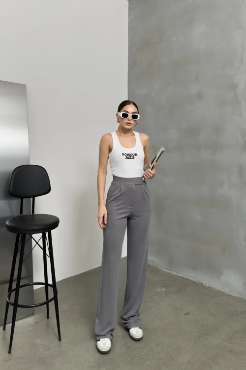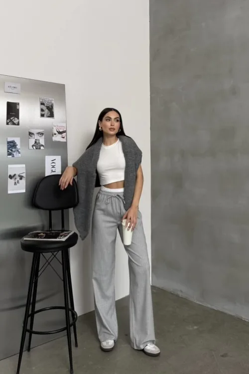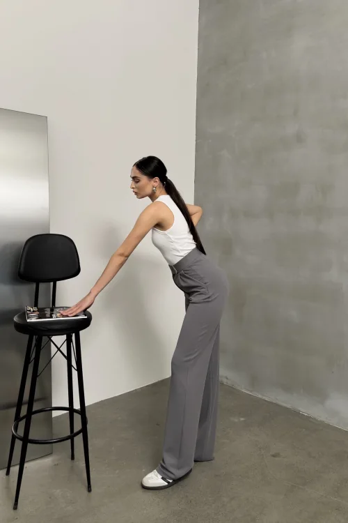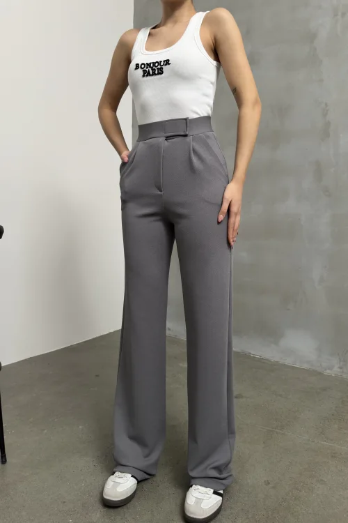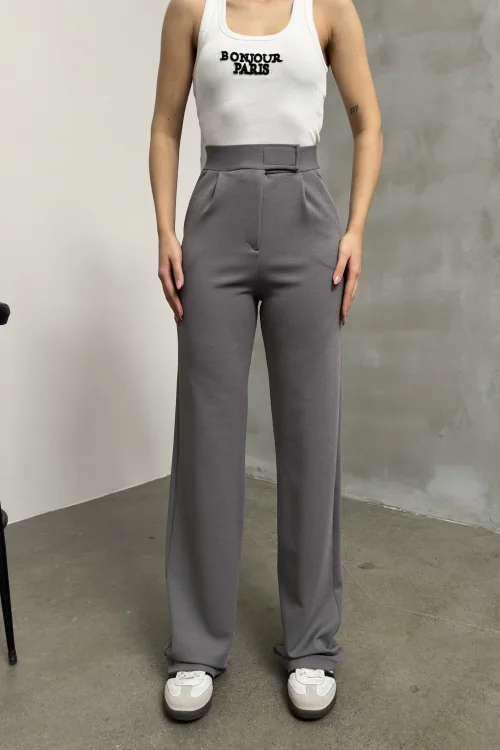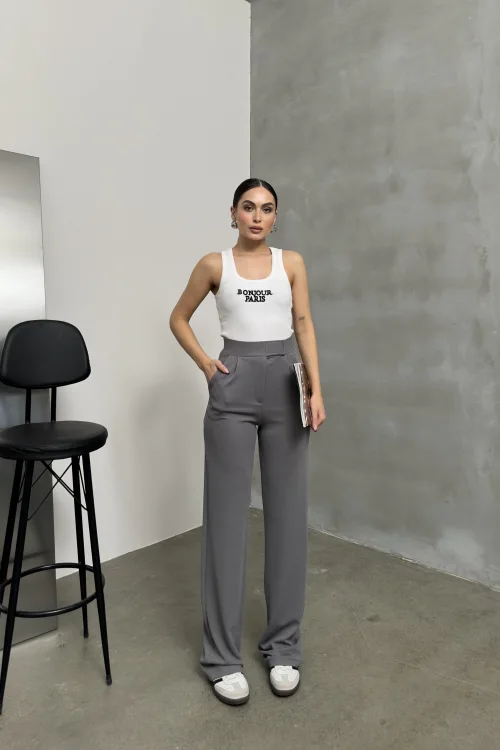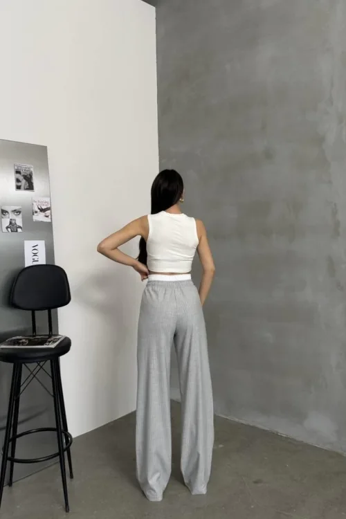 Gri Yüksek Bel Cırtlı Bel Oturtmalı Palazzo Pantolon