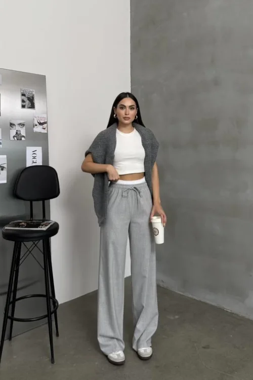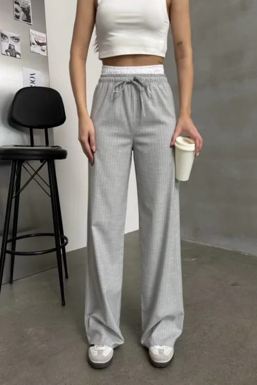 Gri Çizgili Çift Bel Detaylı İp Bağlamalı Palazzo Pantolon