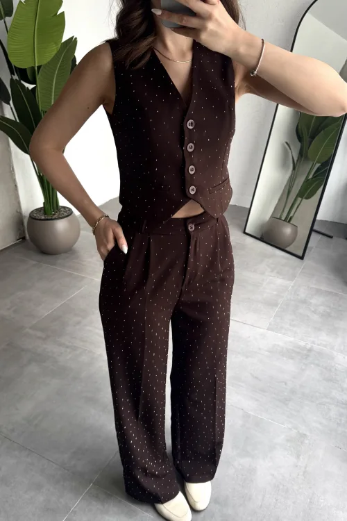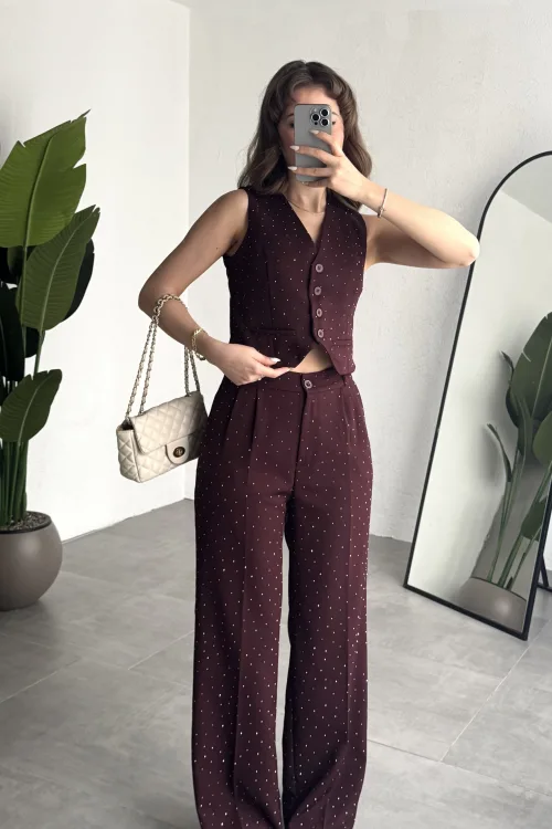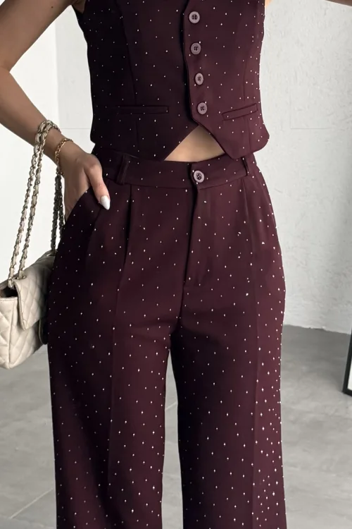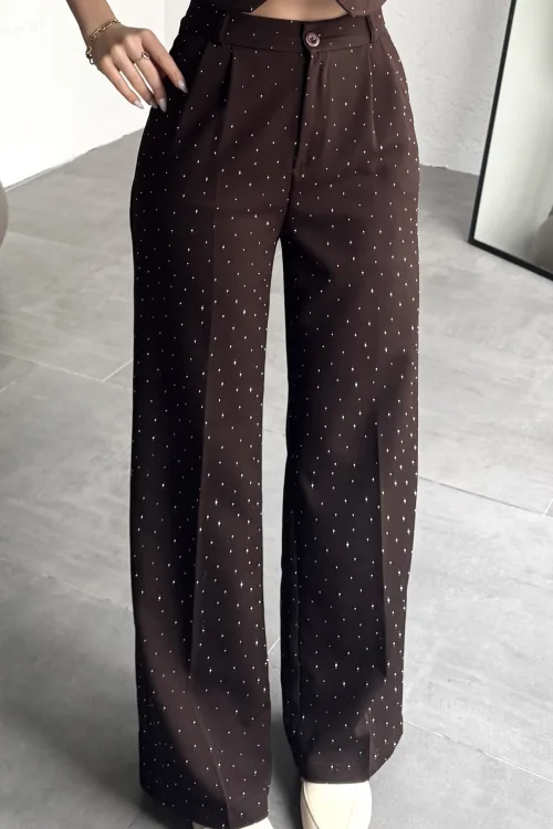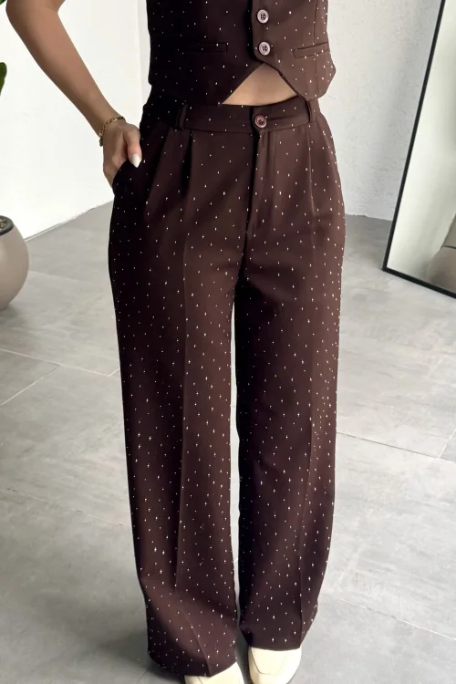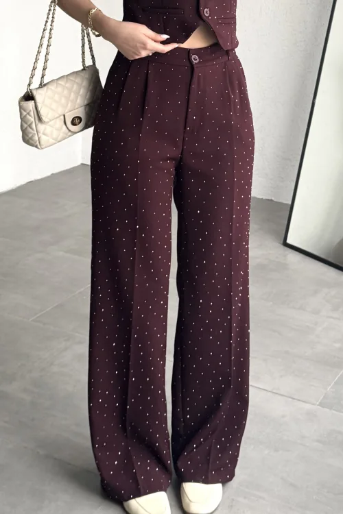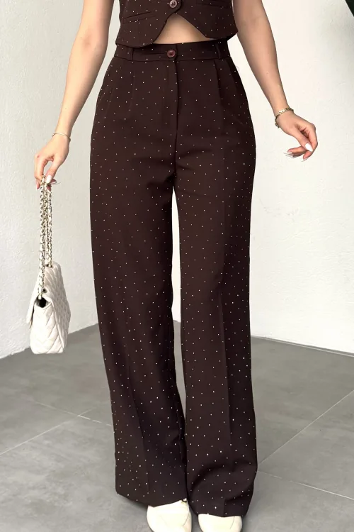 Kadın Kahverengi Taşlı Pırıltılı Yüksek Bel Bol Paça Pileli Palazzo Pantolon