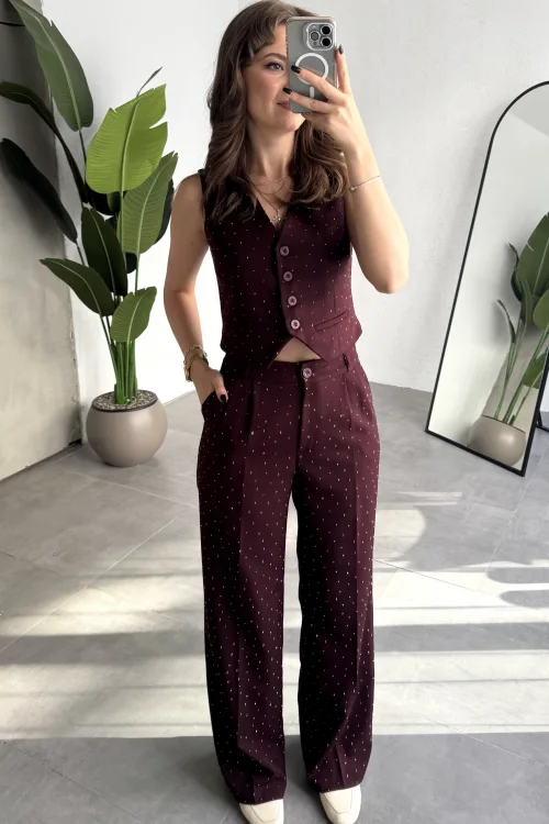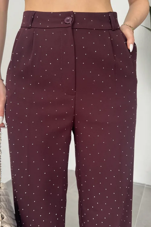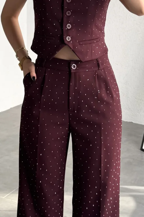 Kadın Bordo Taşlı Pırıltılı Yüksek Bel Bol Paça Pileli Palazzo Pantolon
