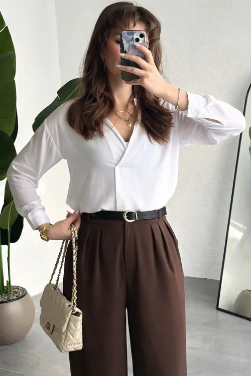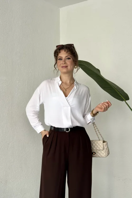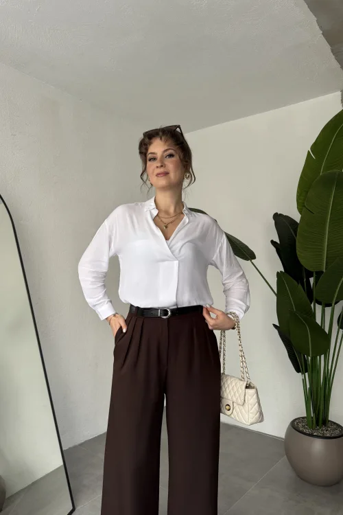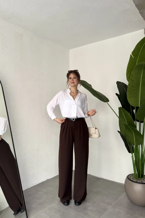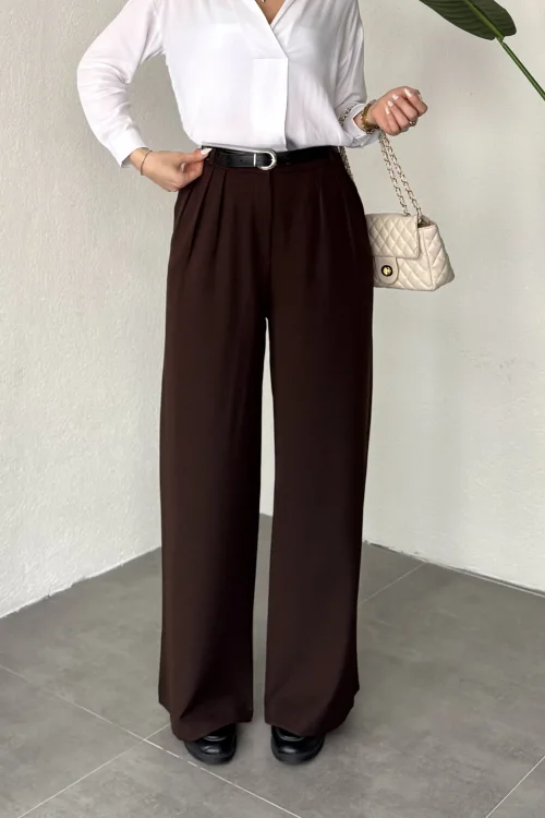 Kahverengi Pileli Tam Kalıp Bel Oturtmalı Geniş Paça Palazzo Pantolon