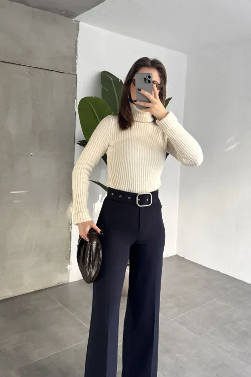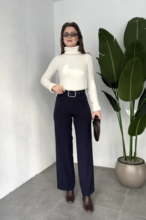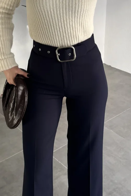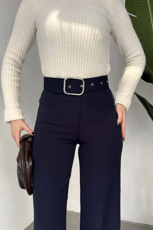 Kadın Kemerli Yüksek Bel Geniş Paça Kumaş Pantolon Lacivert