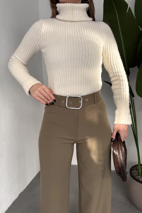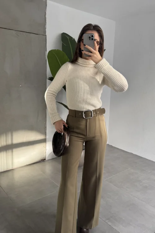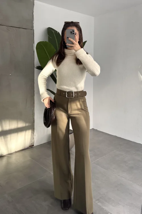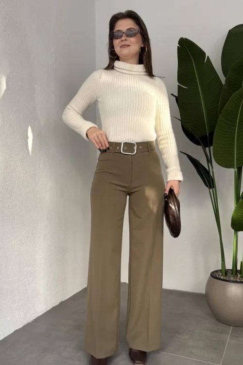 Kadın Kemerli Yüksek Bel Geniş Paça Kumaş Pantolon Haki