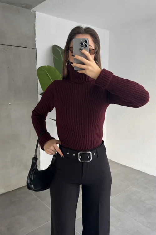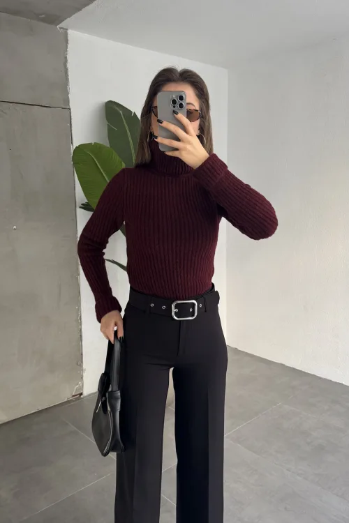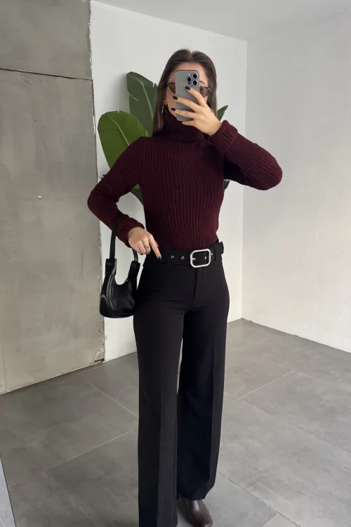 Bordo Pileli Tam Kalıp Bel Oturtmalı Geniş Paça Palazzo Pantolon