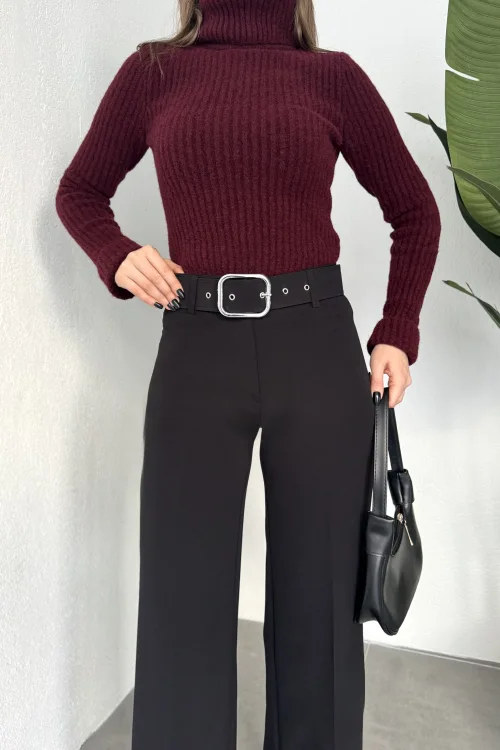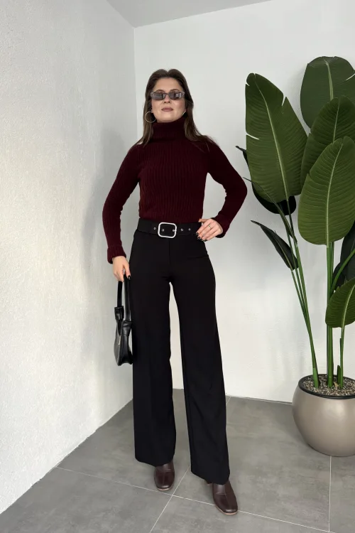 Kadın Kemerli Yüksek Bel Geniş Paça Kumaş Pantolon Siyah