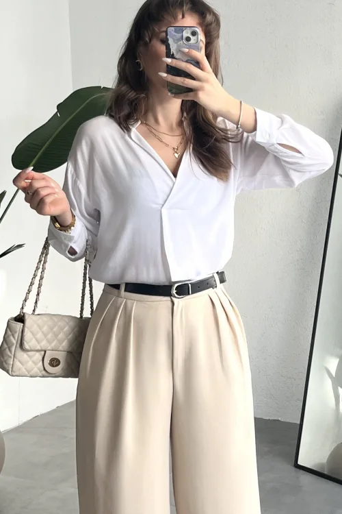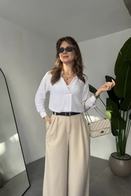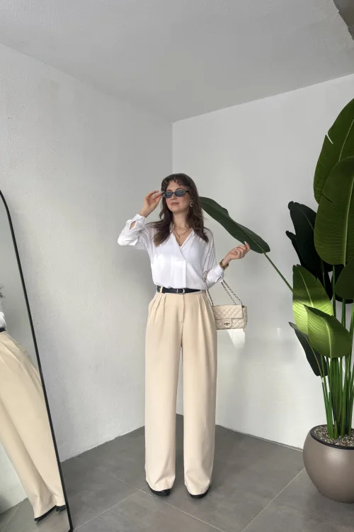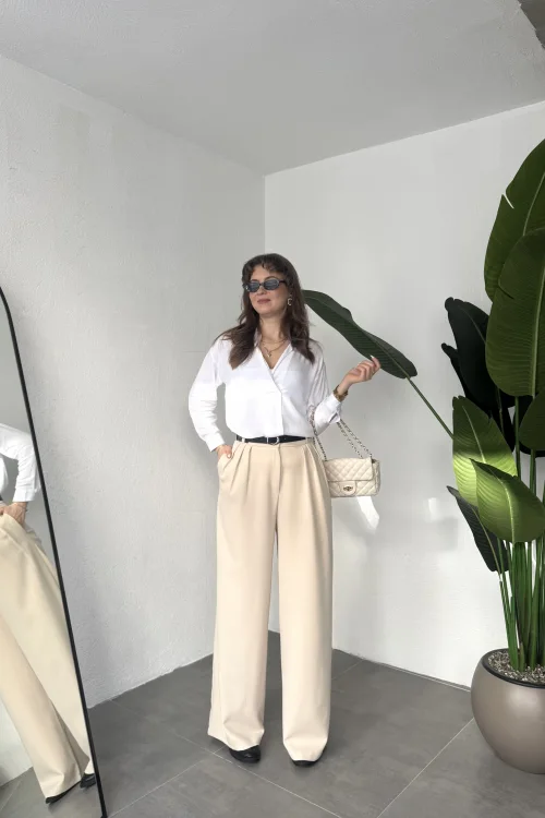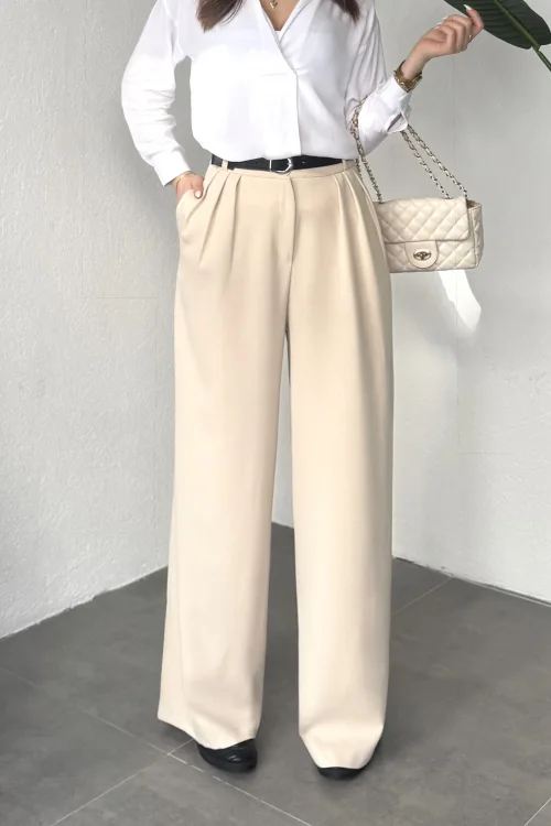 Krem Pileli Tam Kalıp Bel Oturtmalı Geniş Paça Palazzo Pantolon