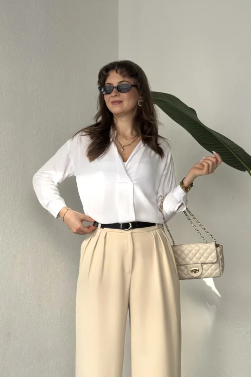 Kadın Krem Pileli Yüksek Bel Bol Paça Ekstra Bol Palazzo Kumaş Pantolon