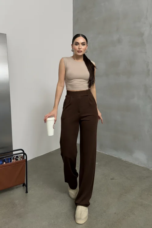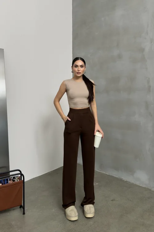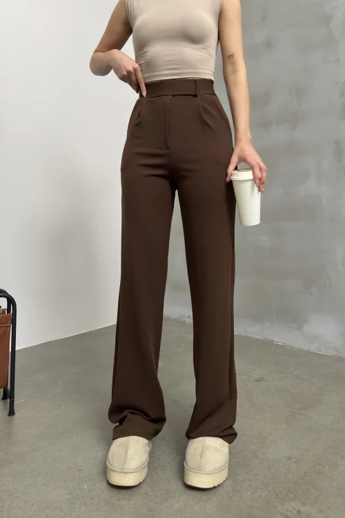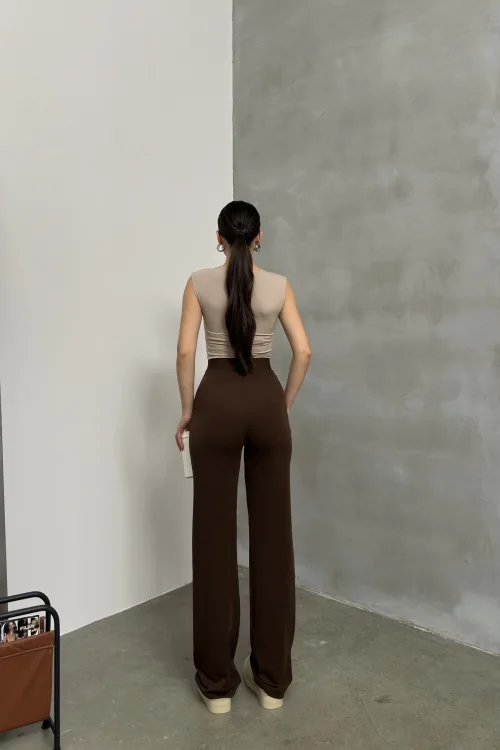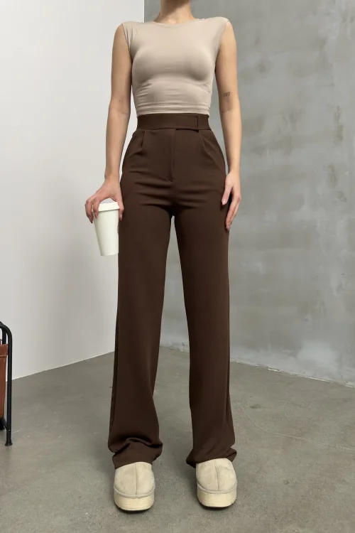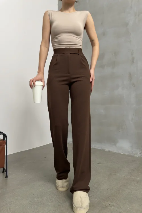 Kahverengi Yüksek Bel Cırtlı Bel Oturtmalı Palazzo Pantolon