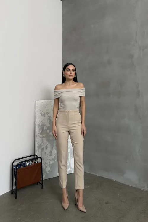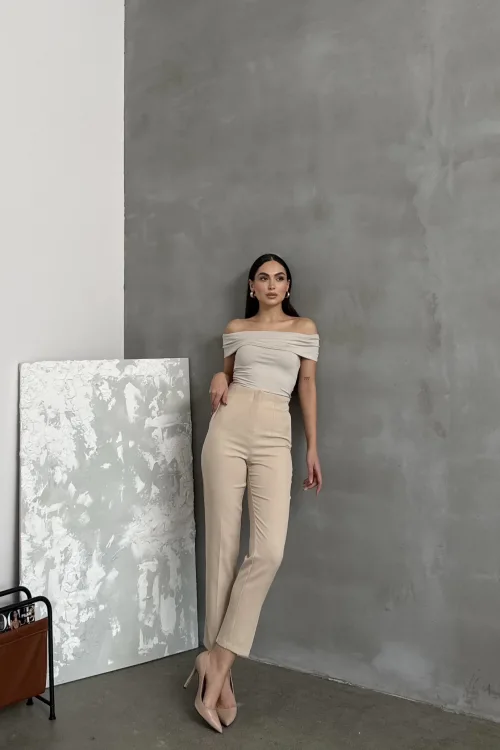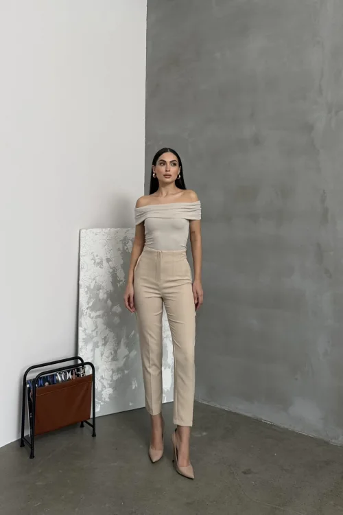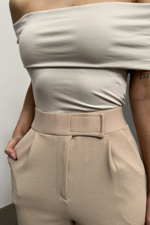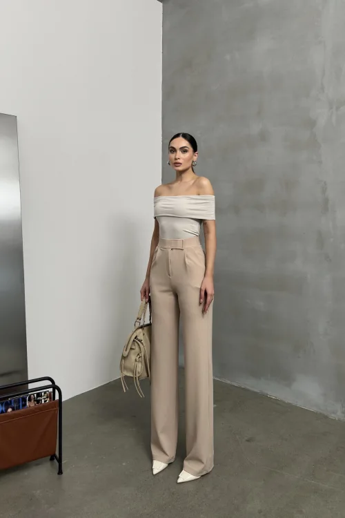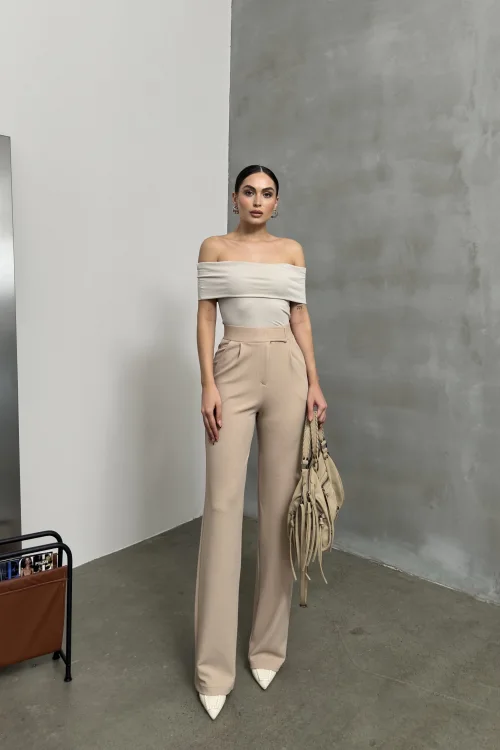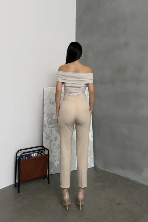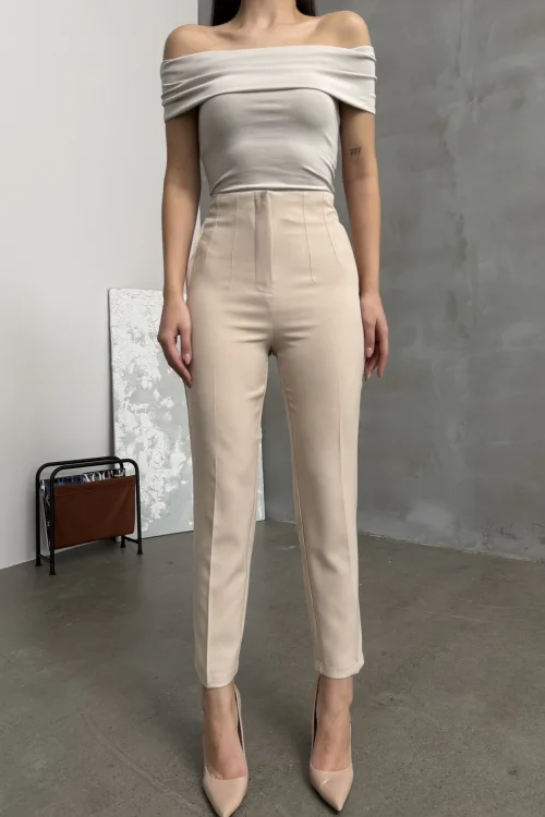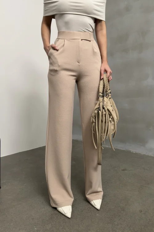 Krem ZR Model Piliseli Bel Oturtmalı Düğmesiz Pantolon
