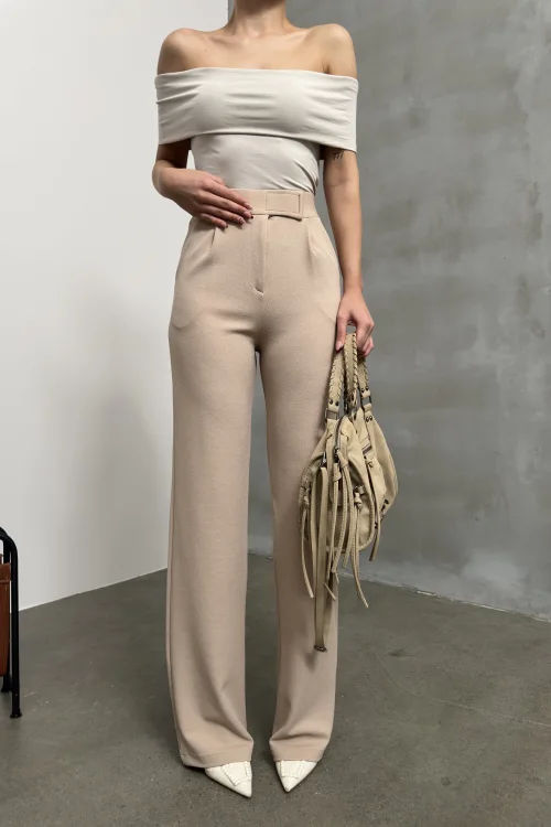Krem Yüksek Bel Cırtlı Bel Oturtmalı Palazzo Pantolon