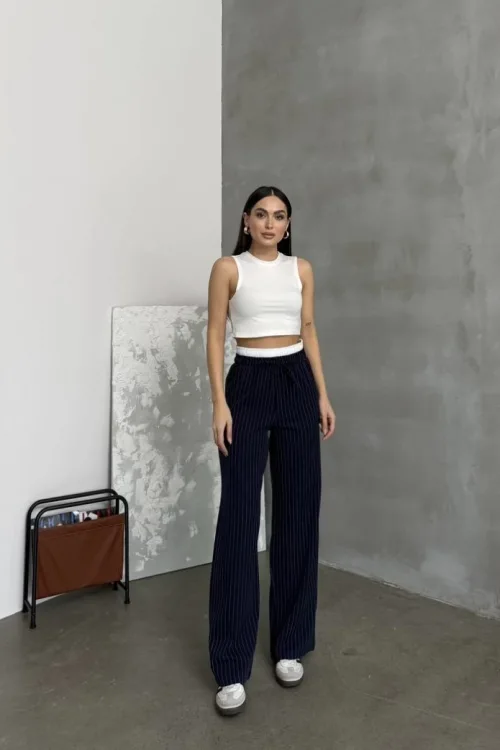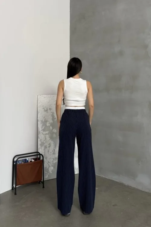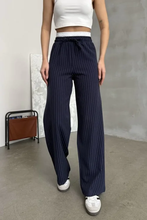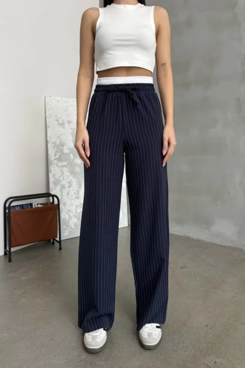 Lacivert Çizgili Çift Bel Detaylı İp Bağlamalı Palazzo Pantolon