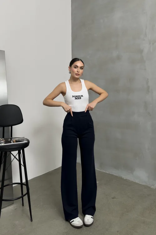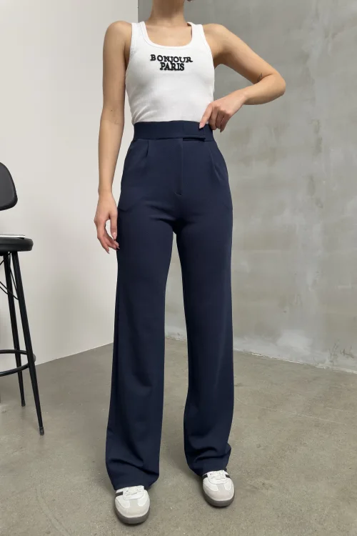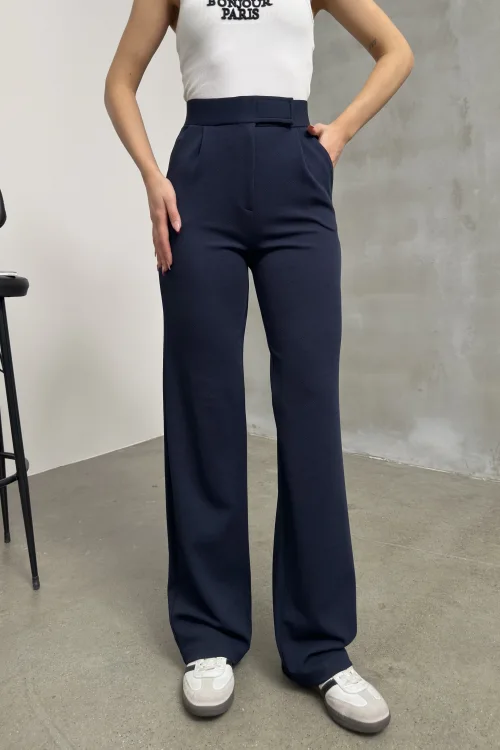 Lacivert Yüksek Bel Cırtlı Bel Oturtmalı Palazzo Pantolon