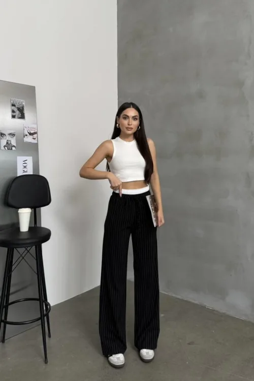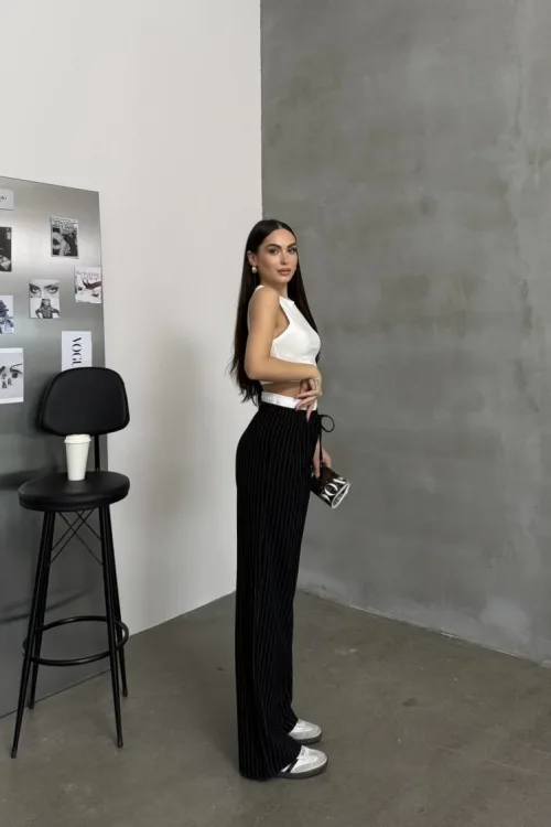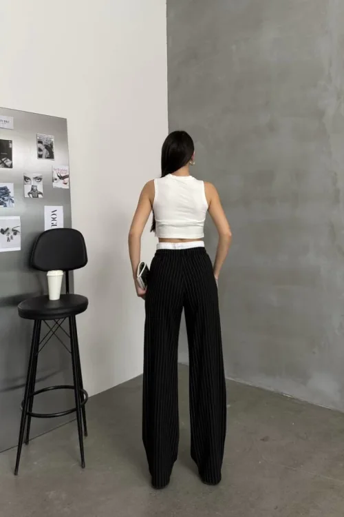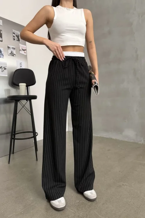 Siyah Çizgili Çift Bel Detaylı İp Bağlamalı Palazzo Pantolon