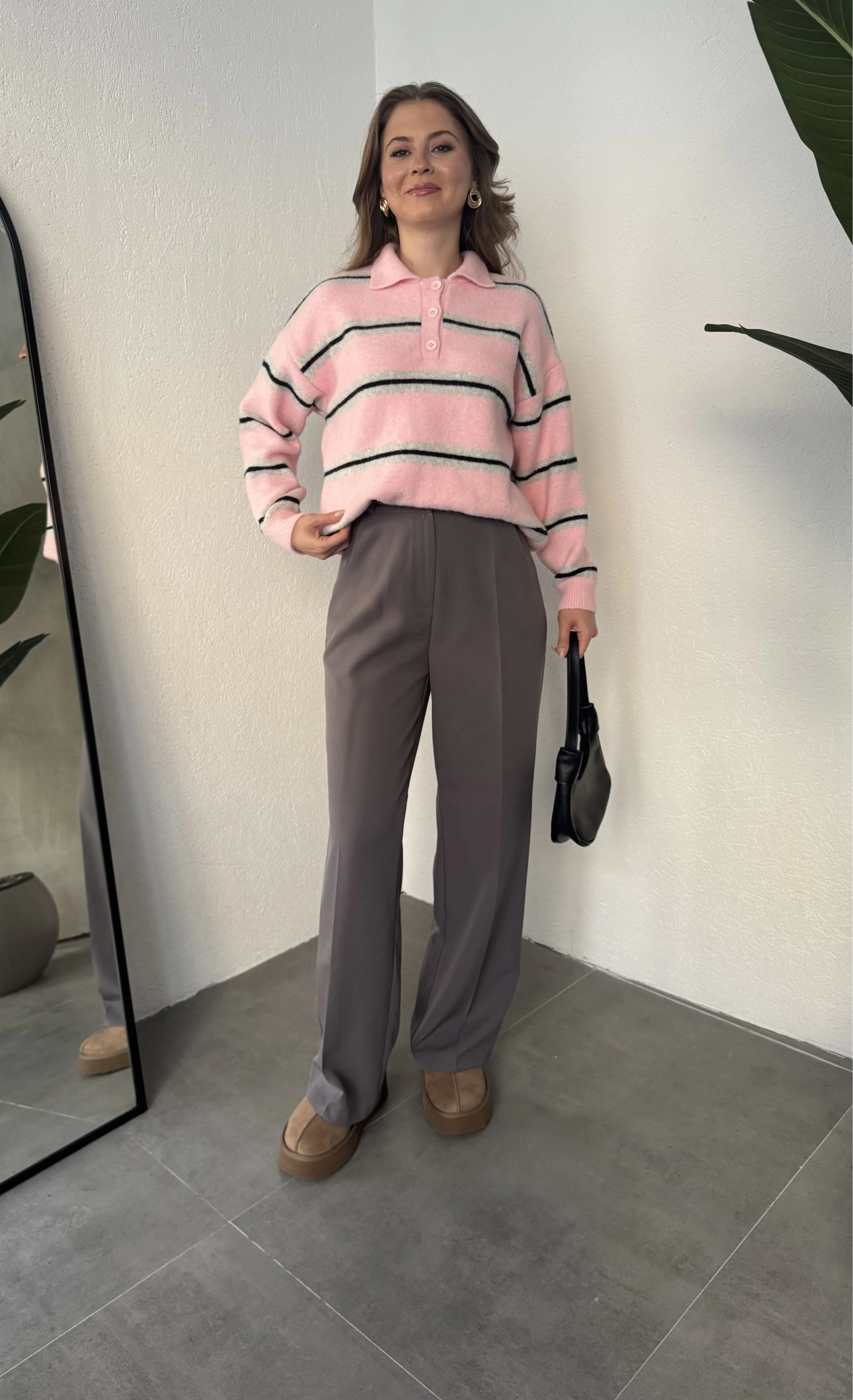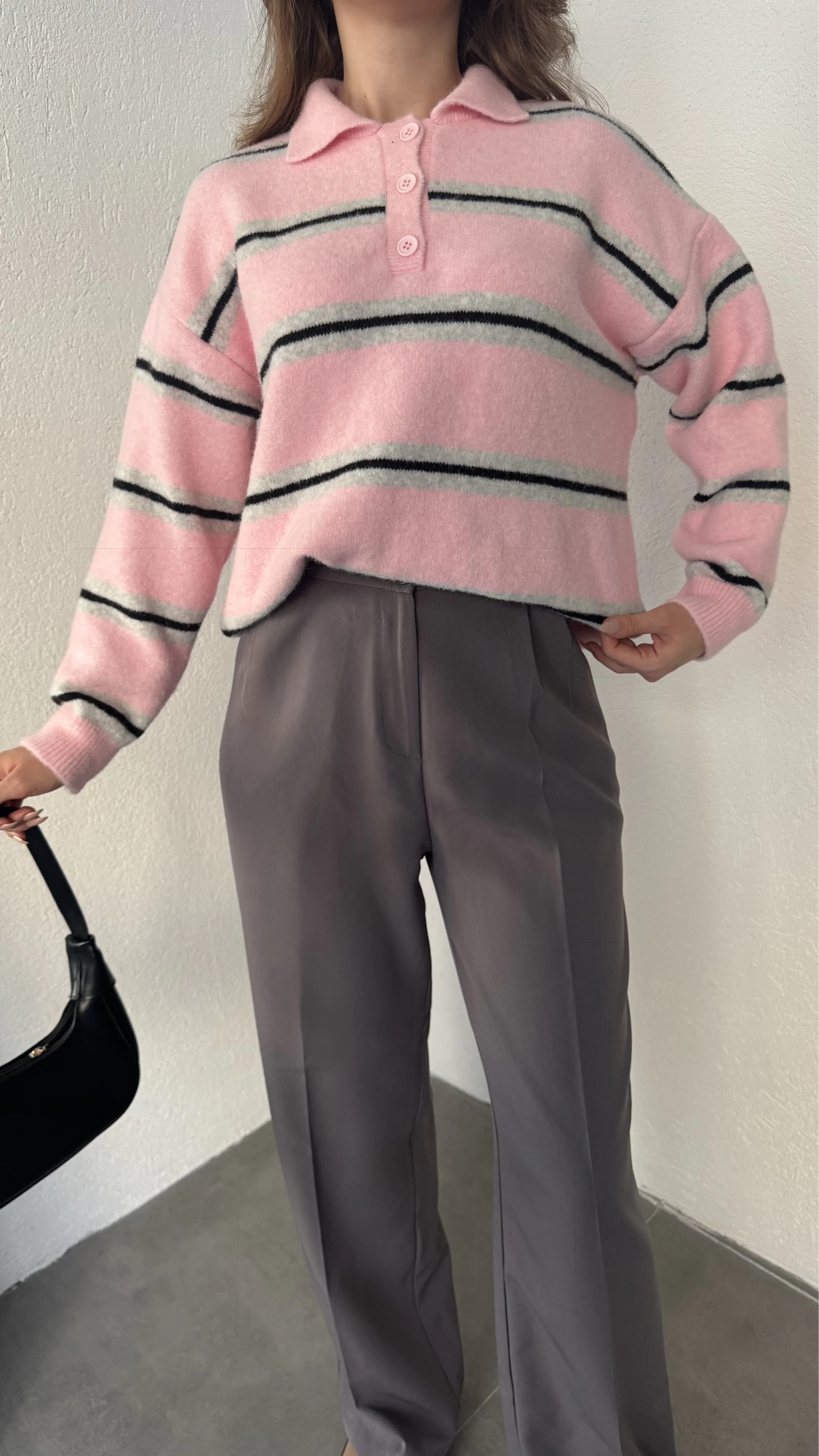 Pembe Çizgili Polo Yaka Çizgili Oversize Trend Kazak
