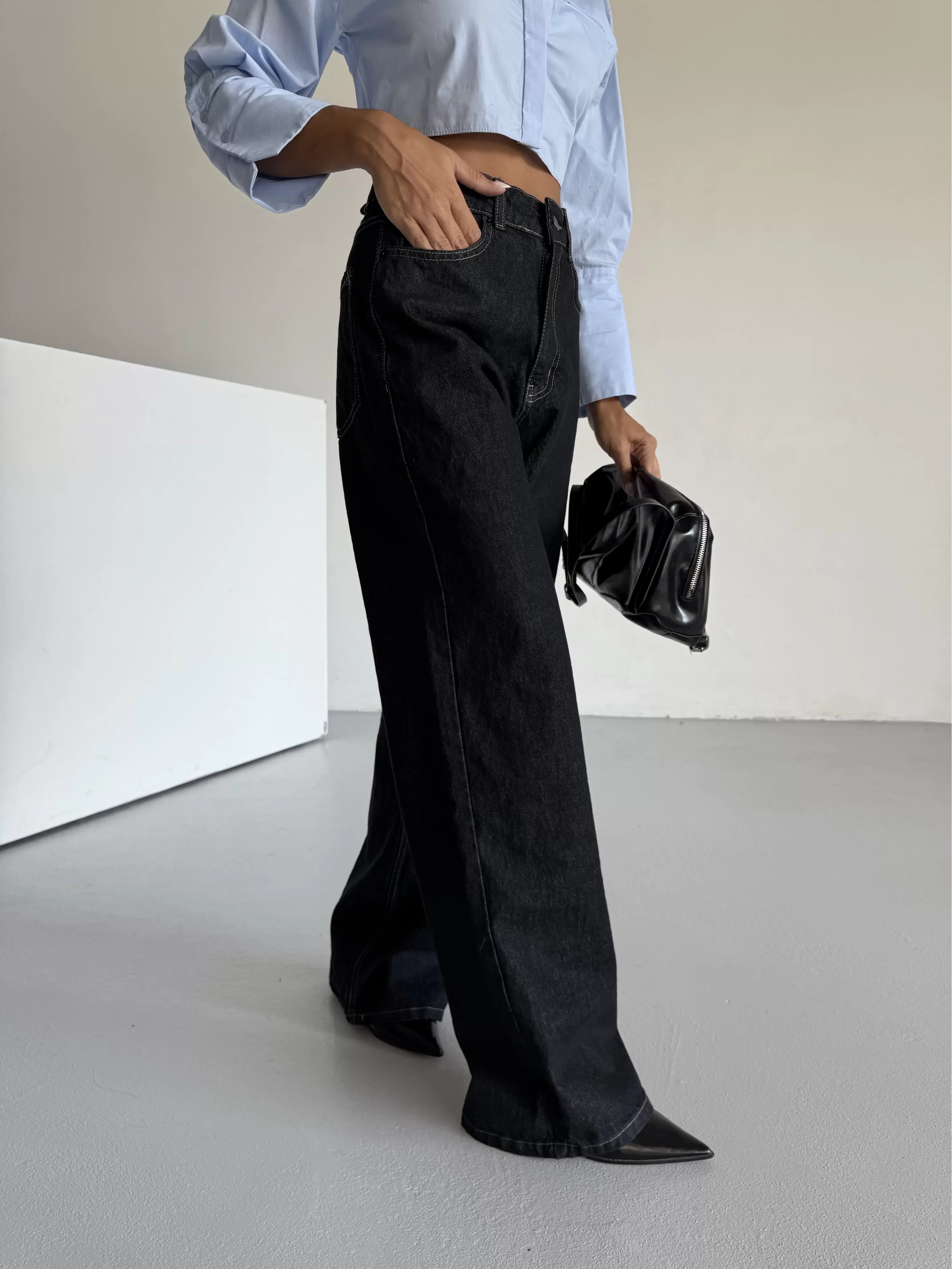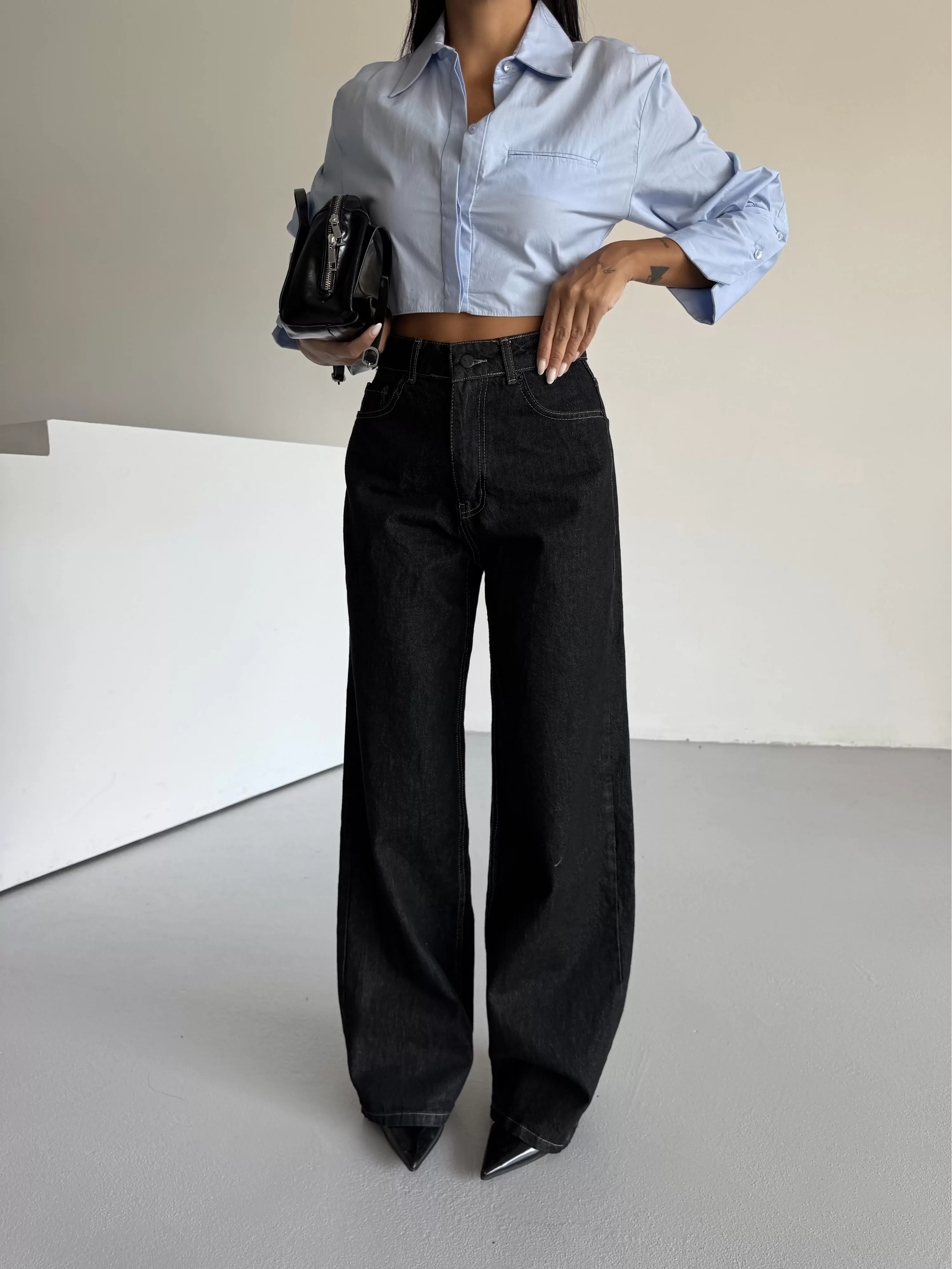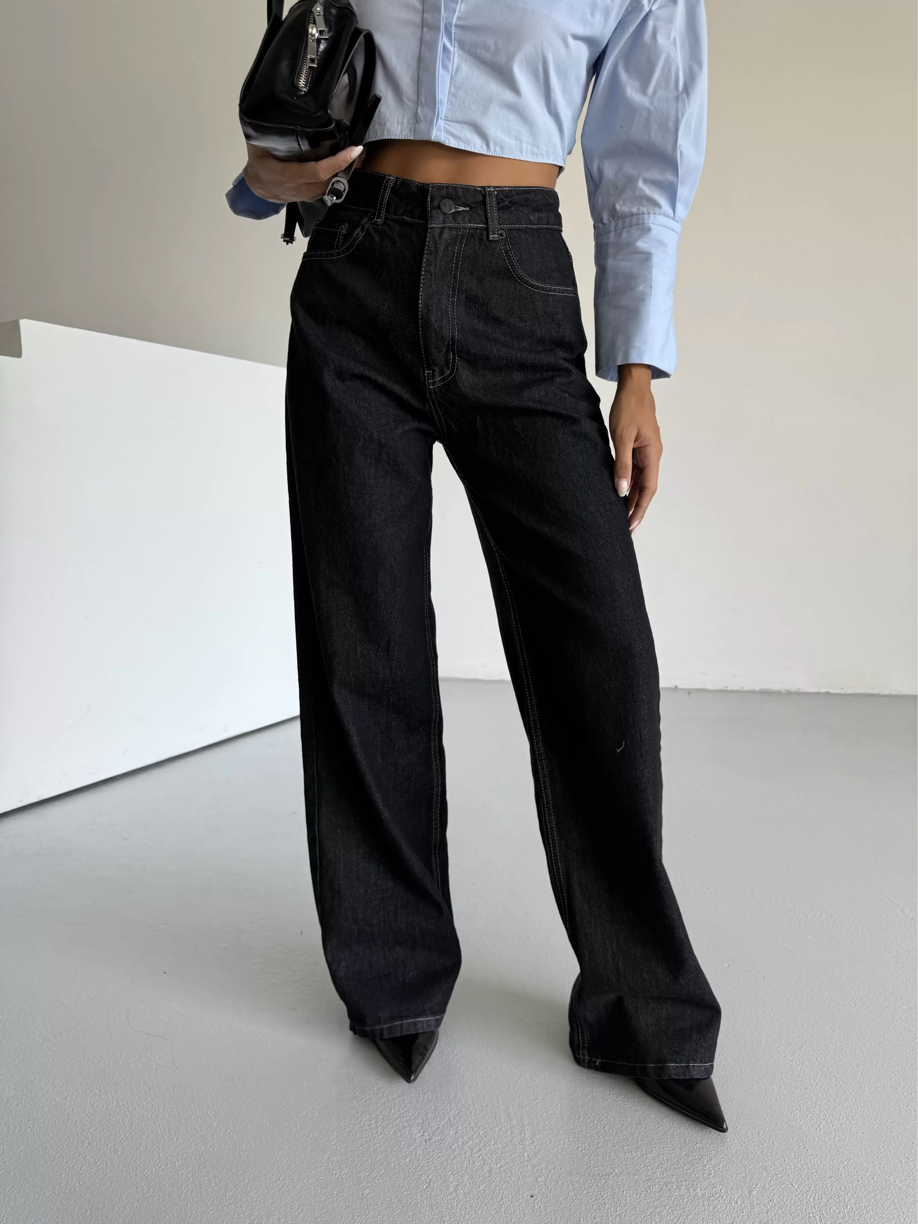 Sade Siyah Rins Yıkamalı Baggy Geniş Paça Yüksek Bel Oturtmalı Jean Kot Pantolon
