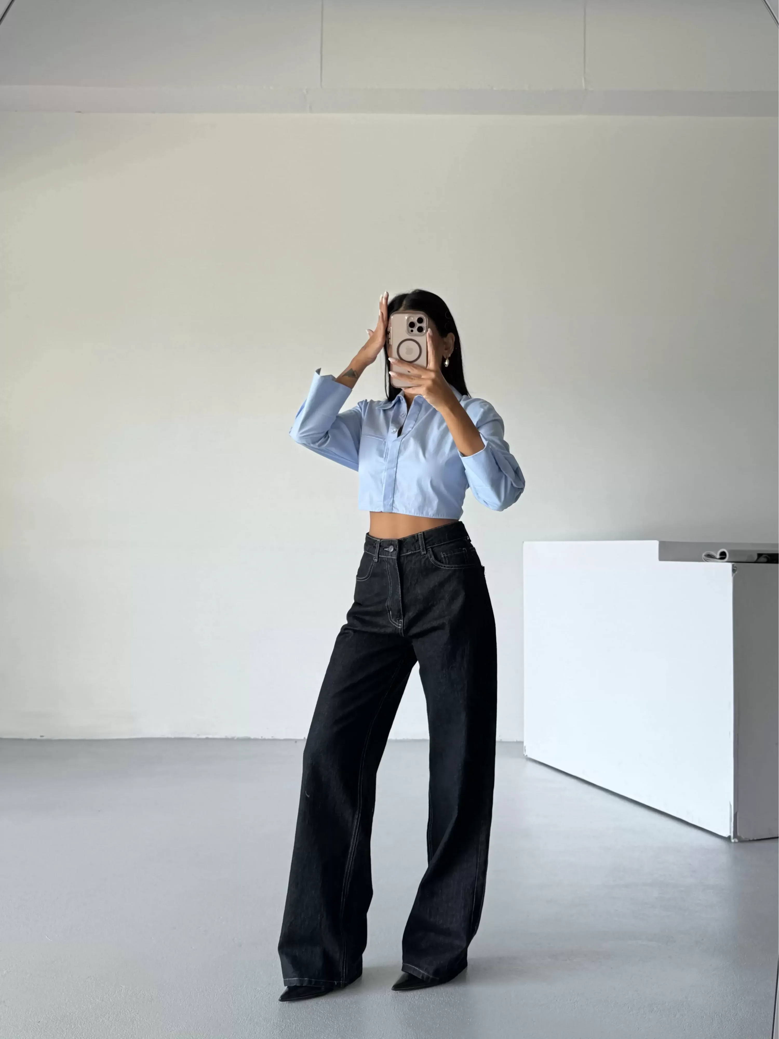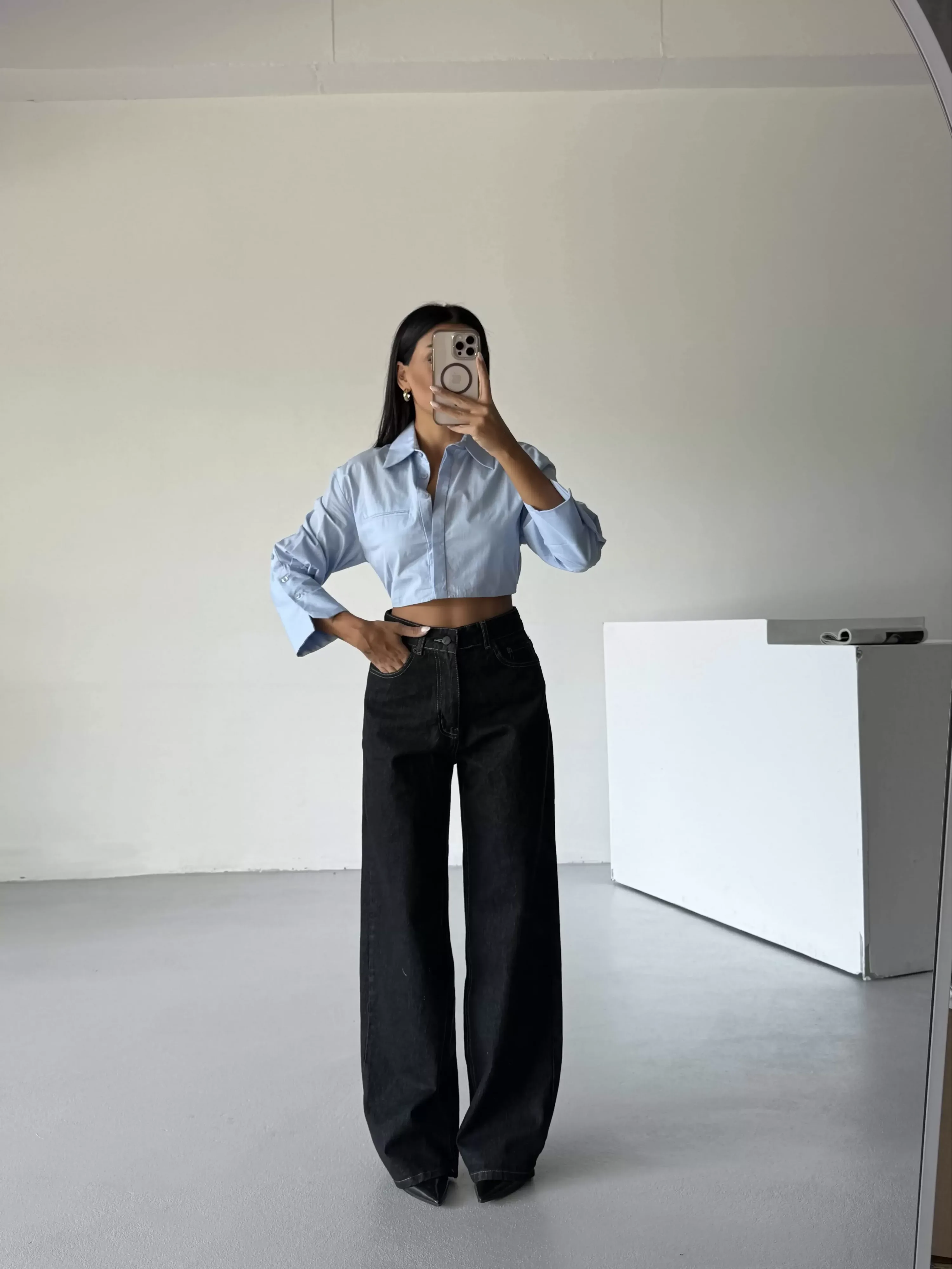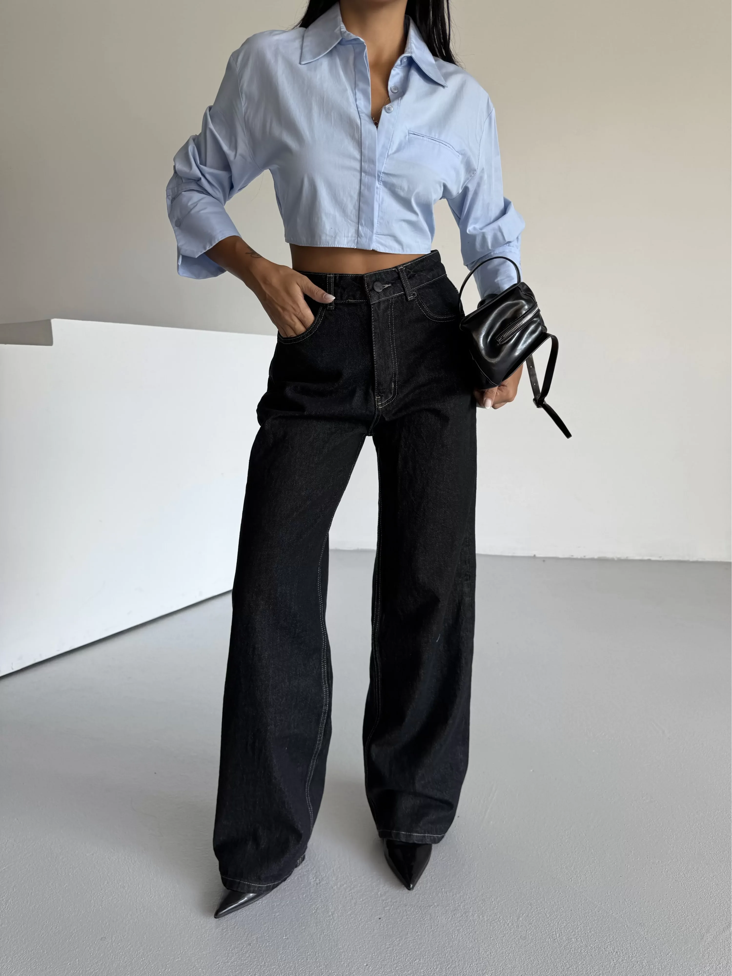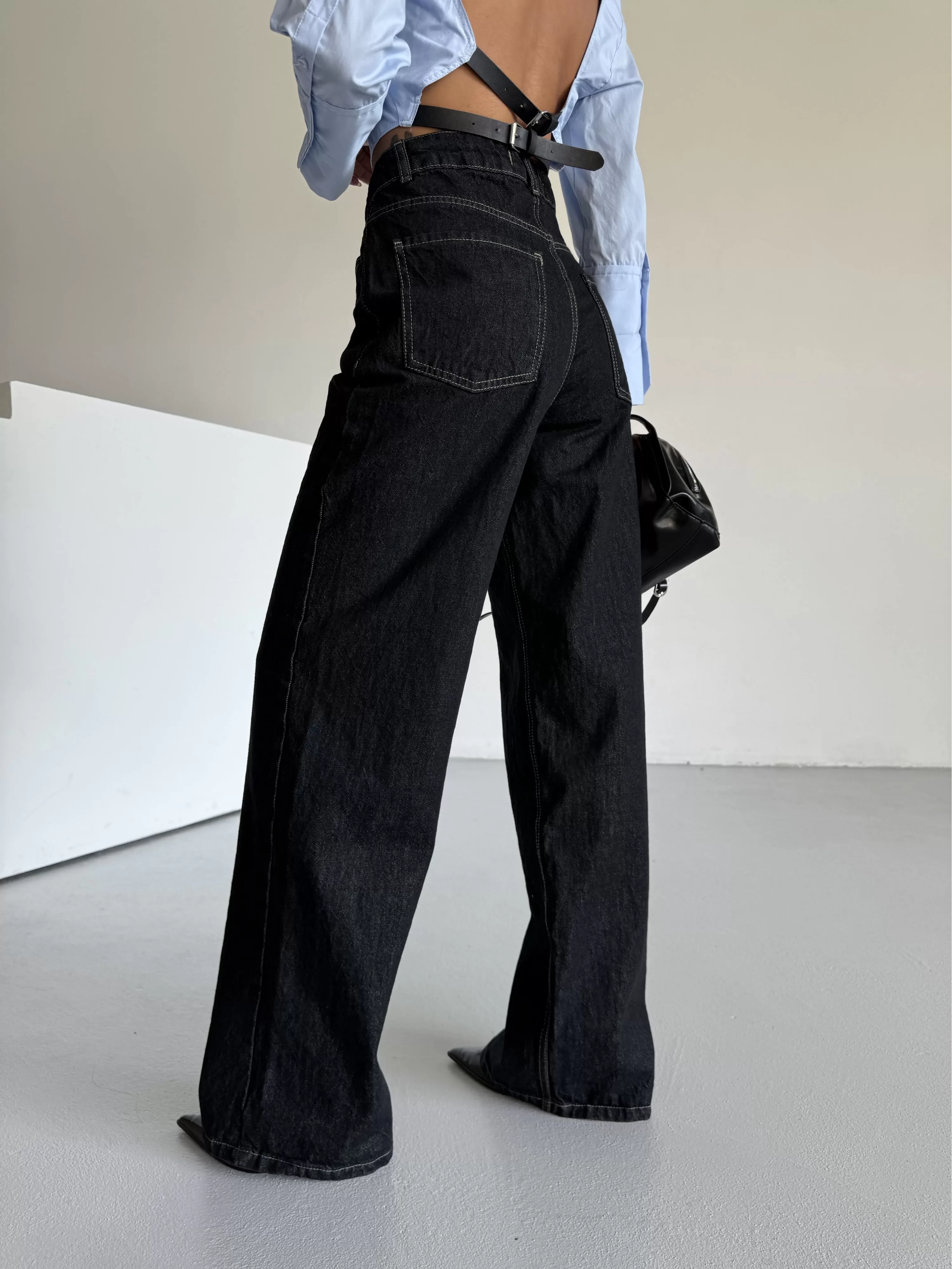 Sade Siyah Rins Yıkamalı Baggy Geniş Paça Yüksek Bel Oturtmalı Jean Kot Pantolon