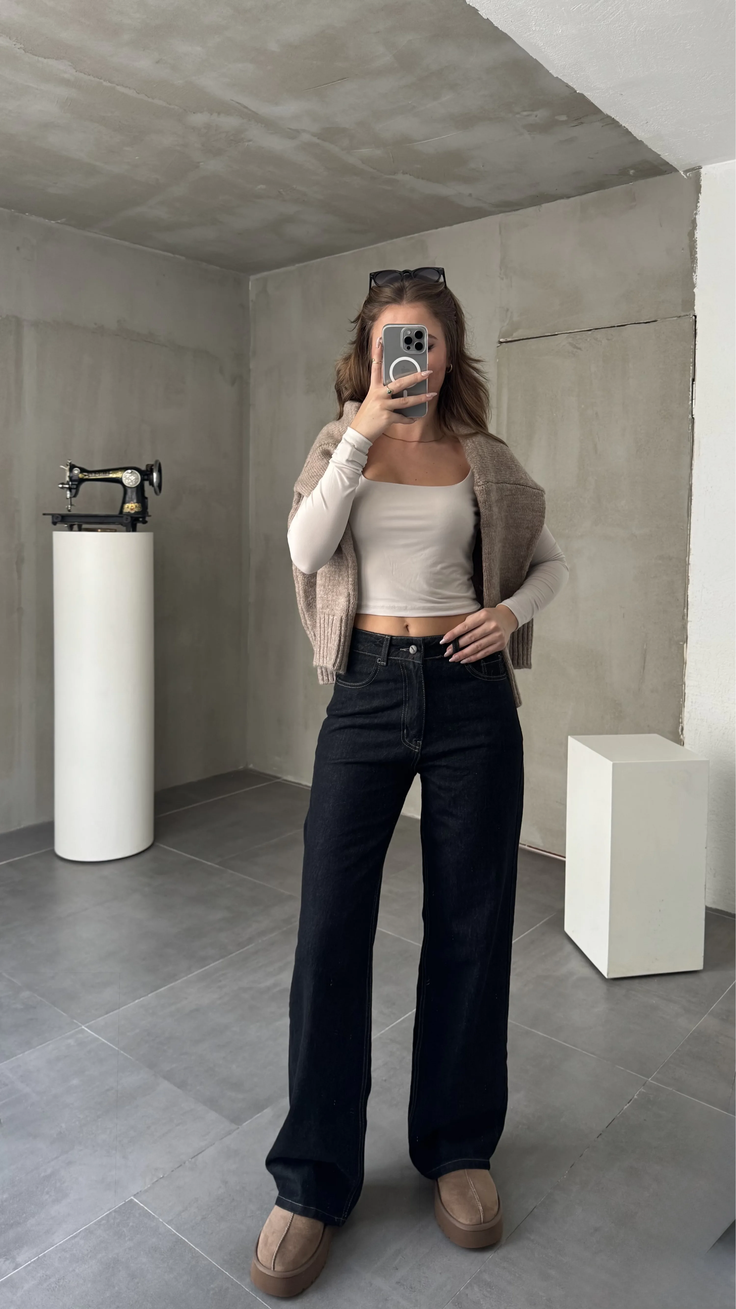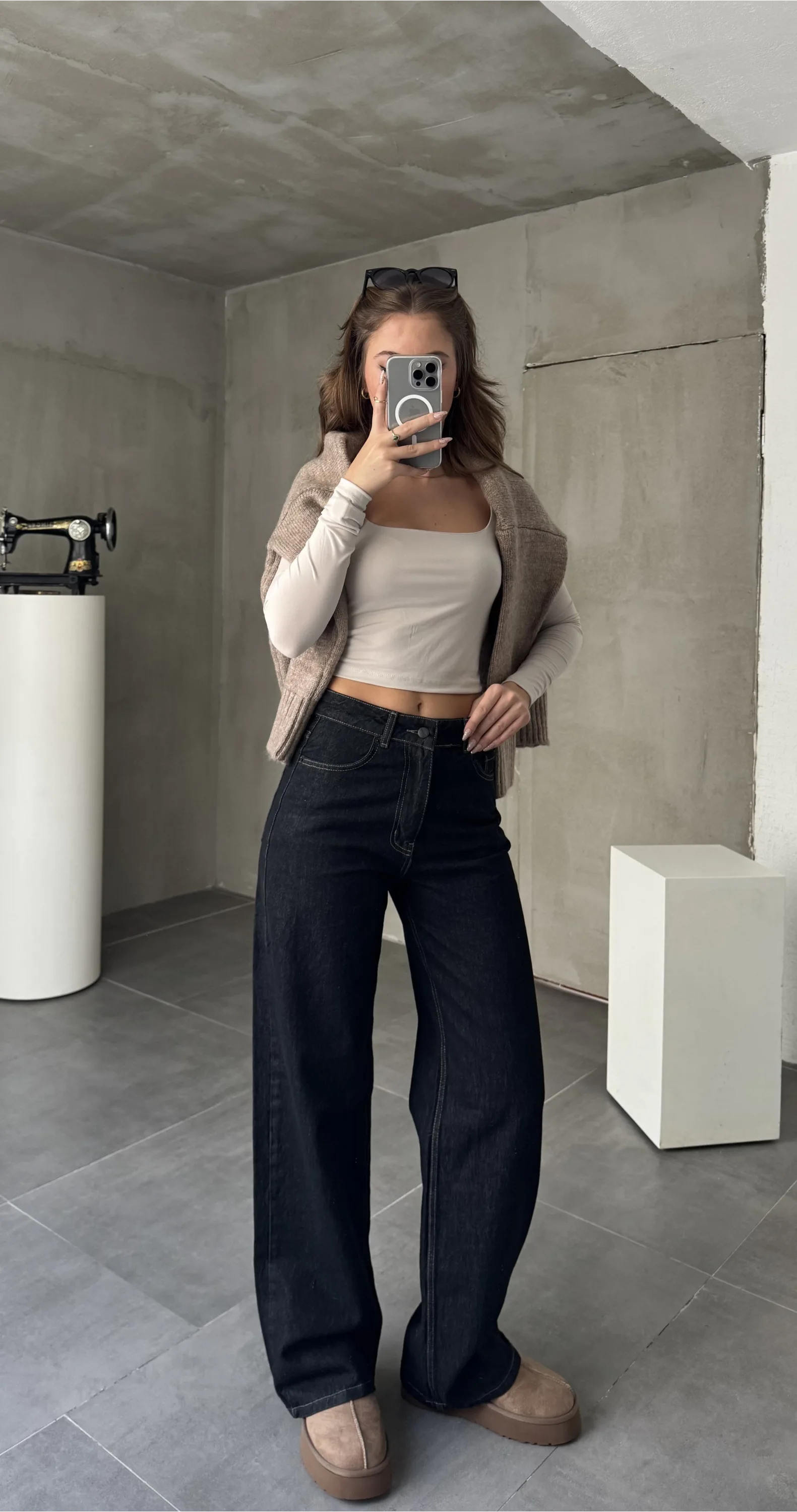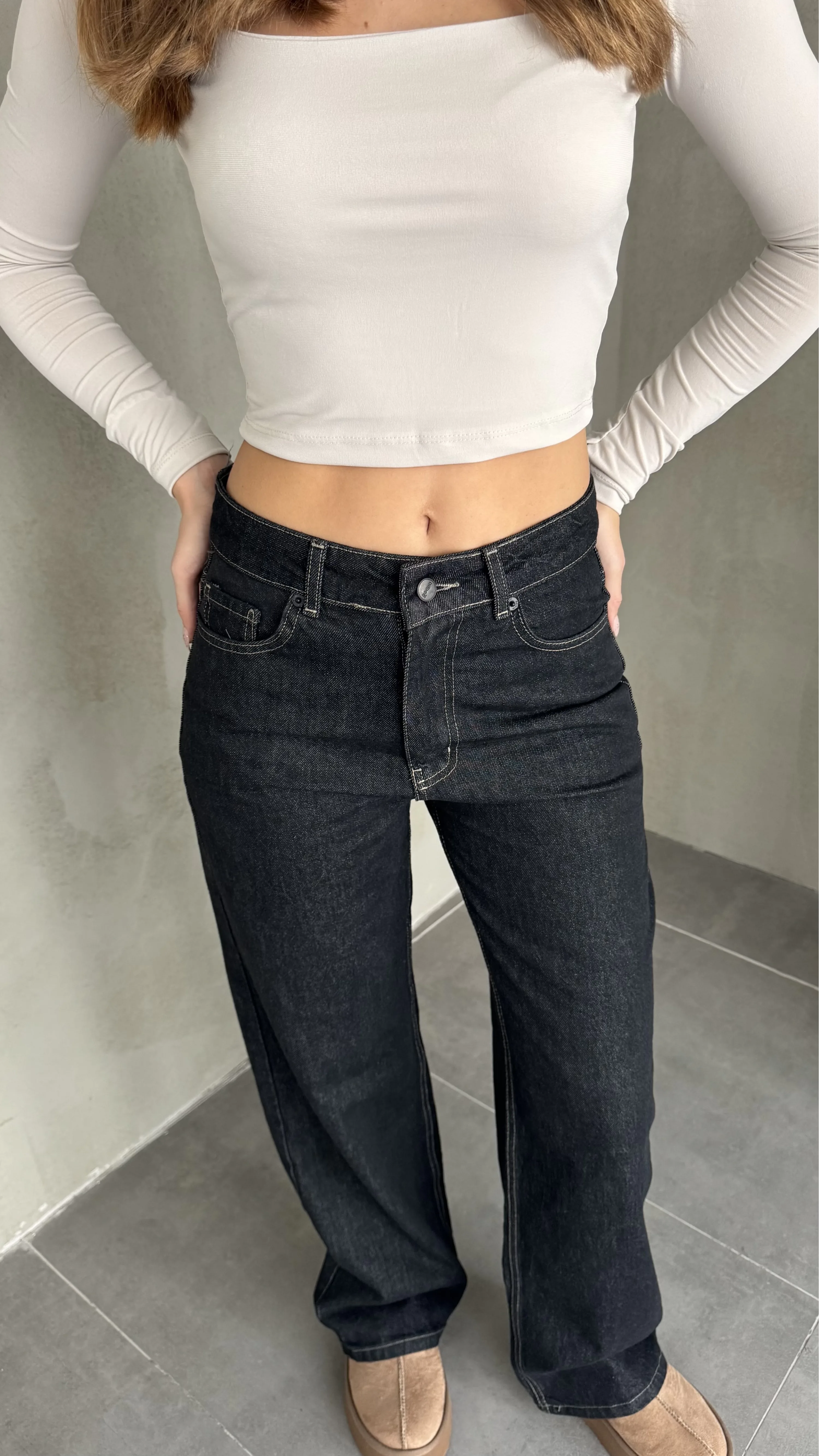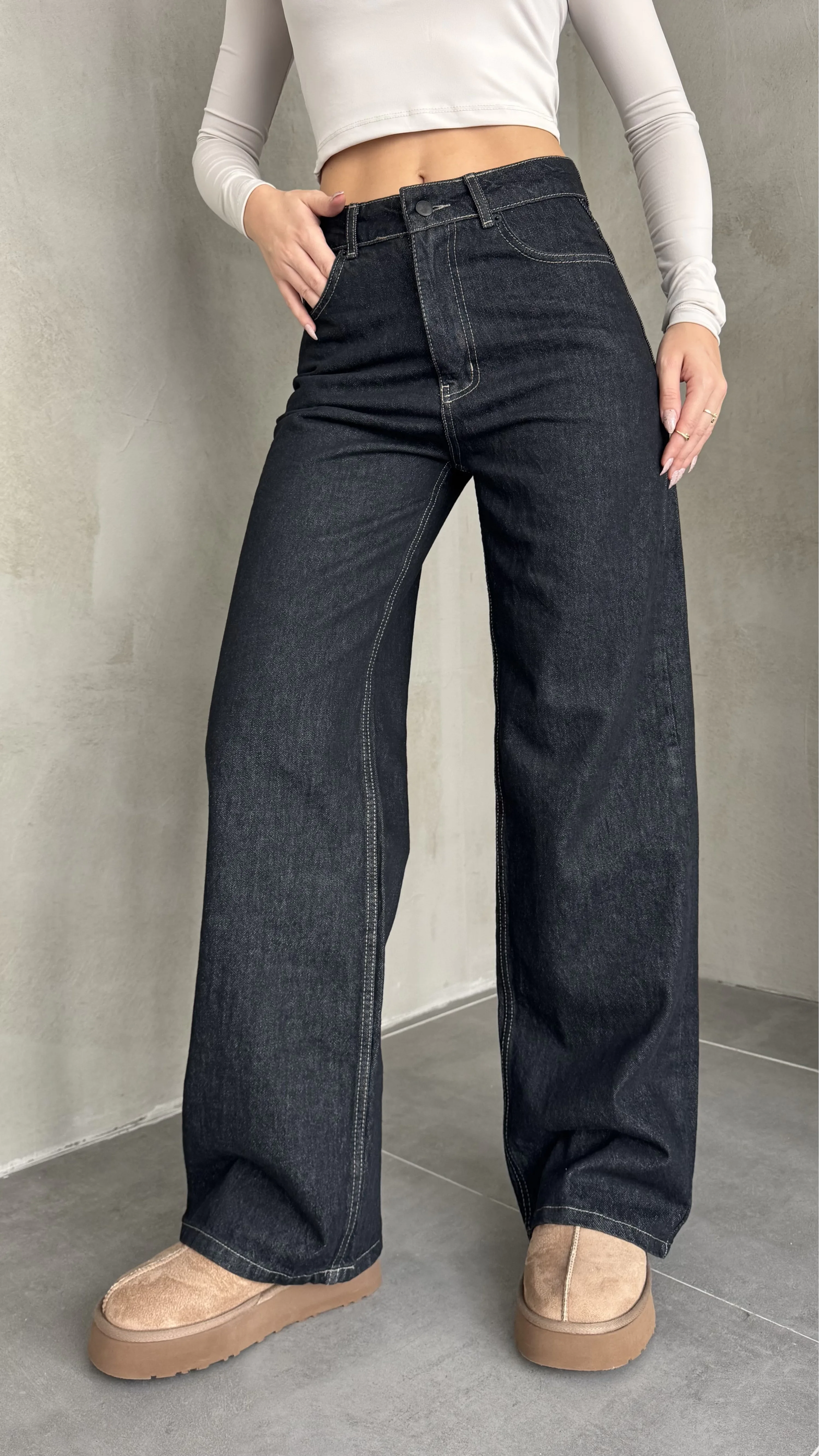 Sade Siyah Rins Yıkamalı Baggy Geniş Paça Yüksek Bel Wide Leg Jean Kot Pantolon