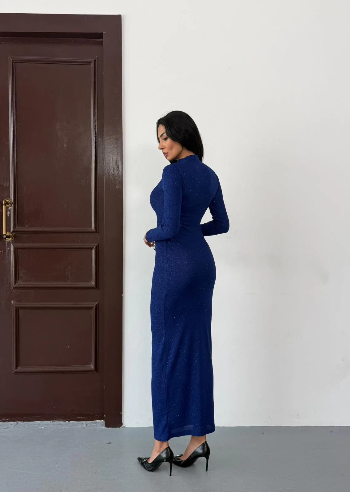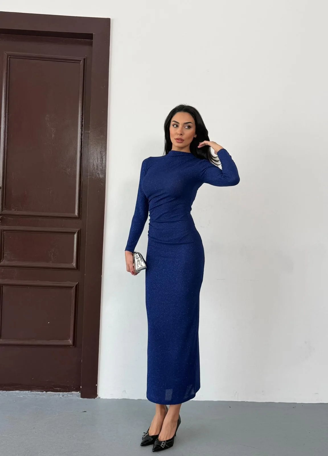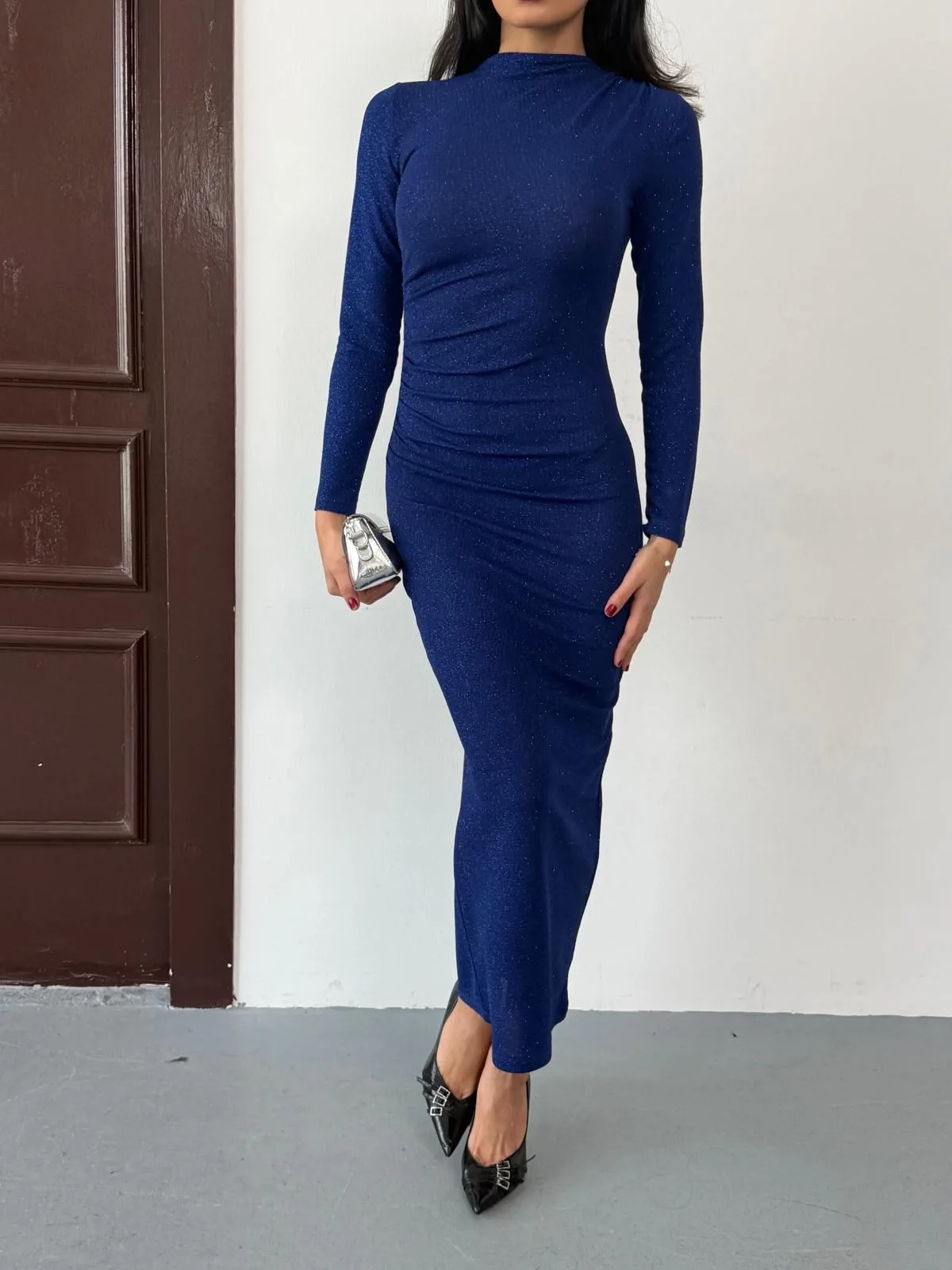 Saks Mavisi Vucudu Saran Simli Parlak Büzgülü Drapeli Midi Boy Uzun Kollu Elbise