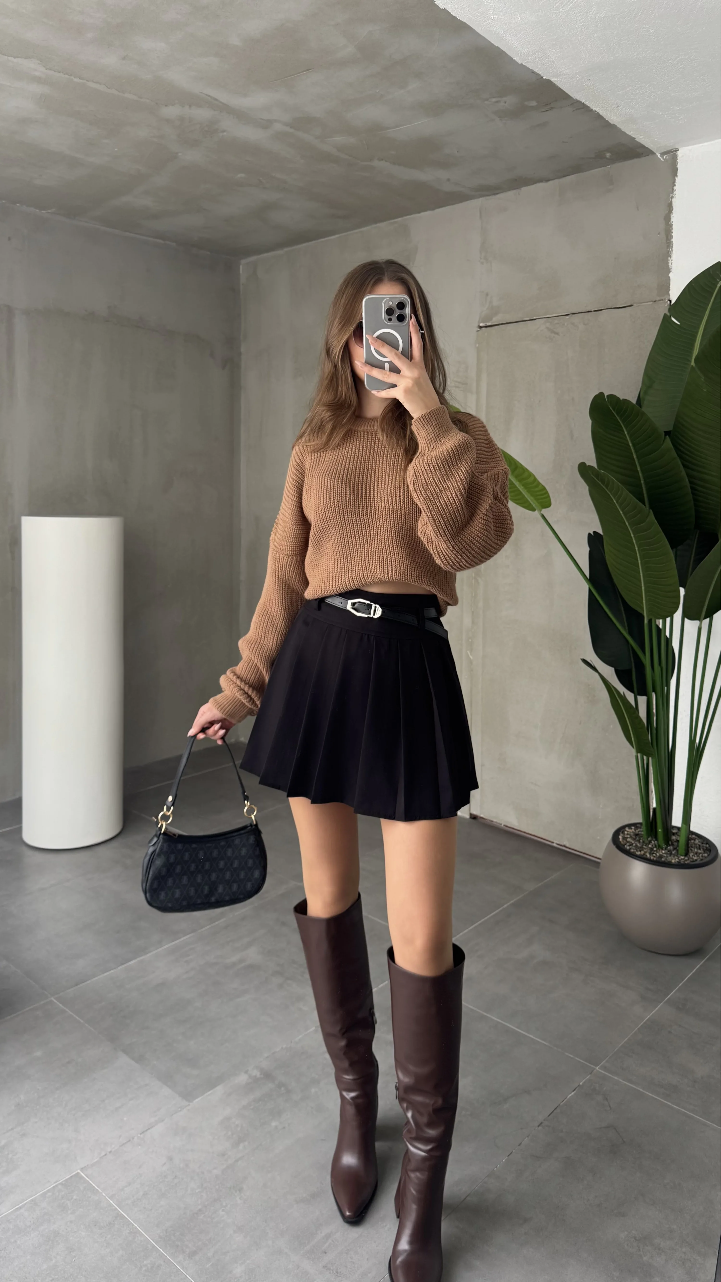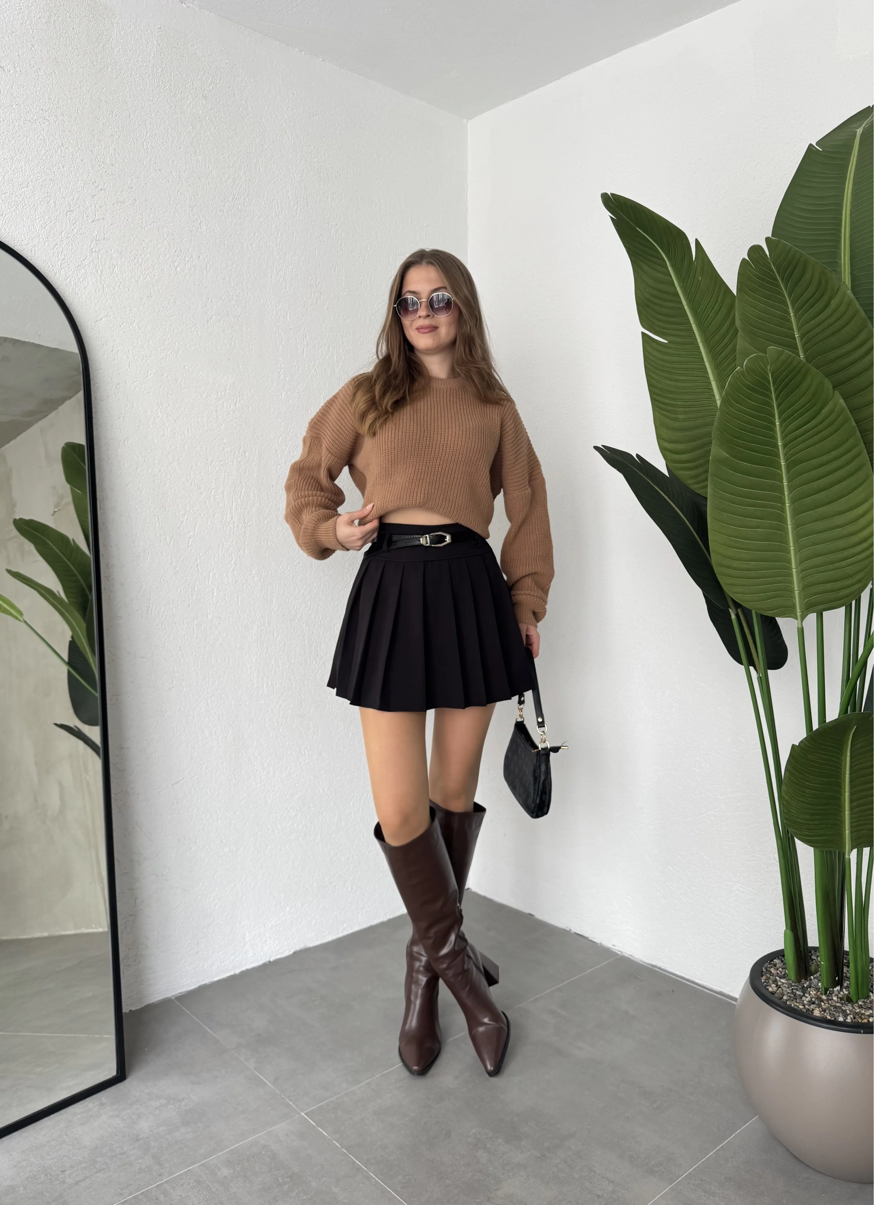 Siyah Astarlı Şortlu Kemerli Pileli Kışlık Mini Etek