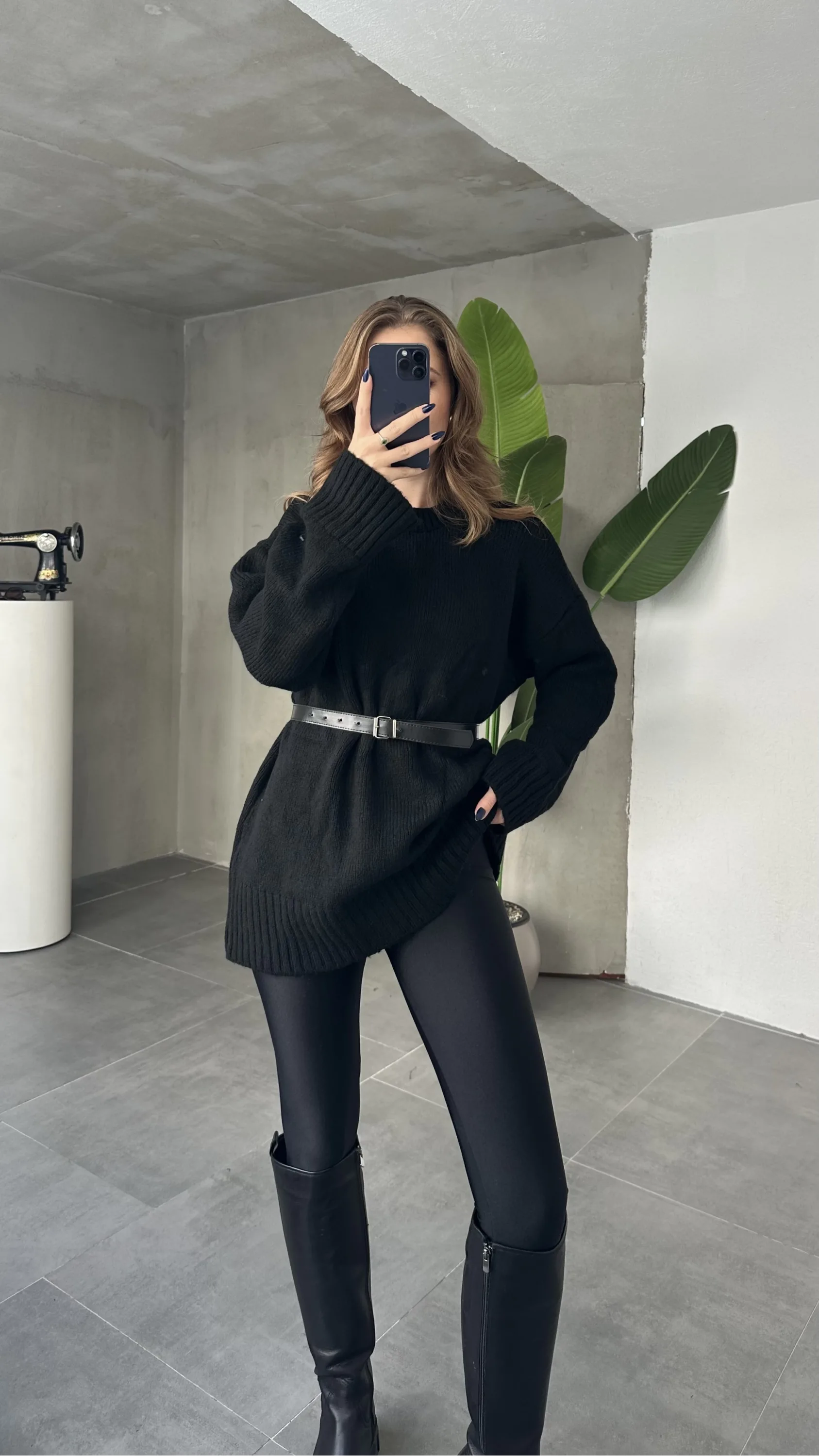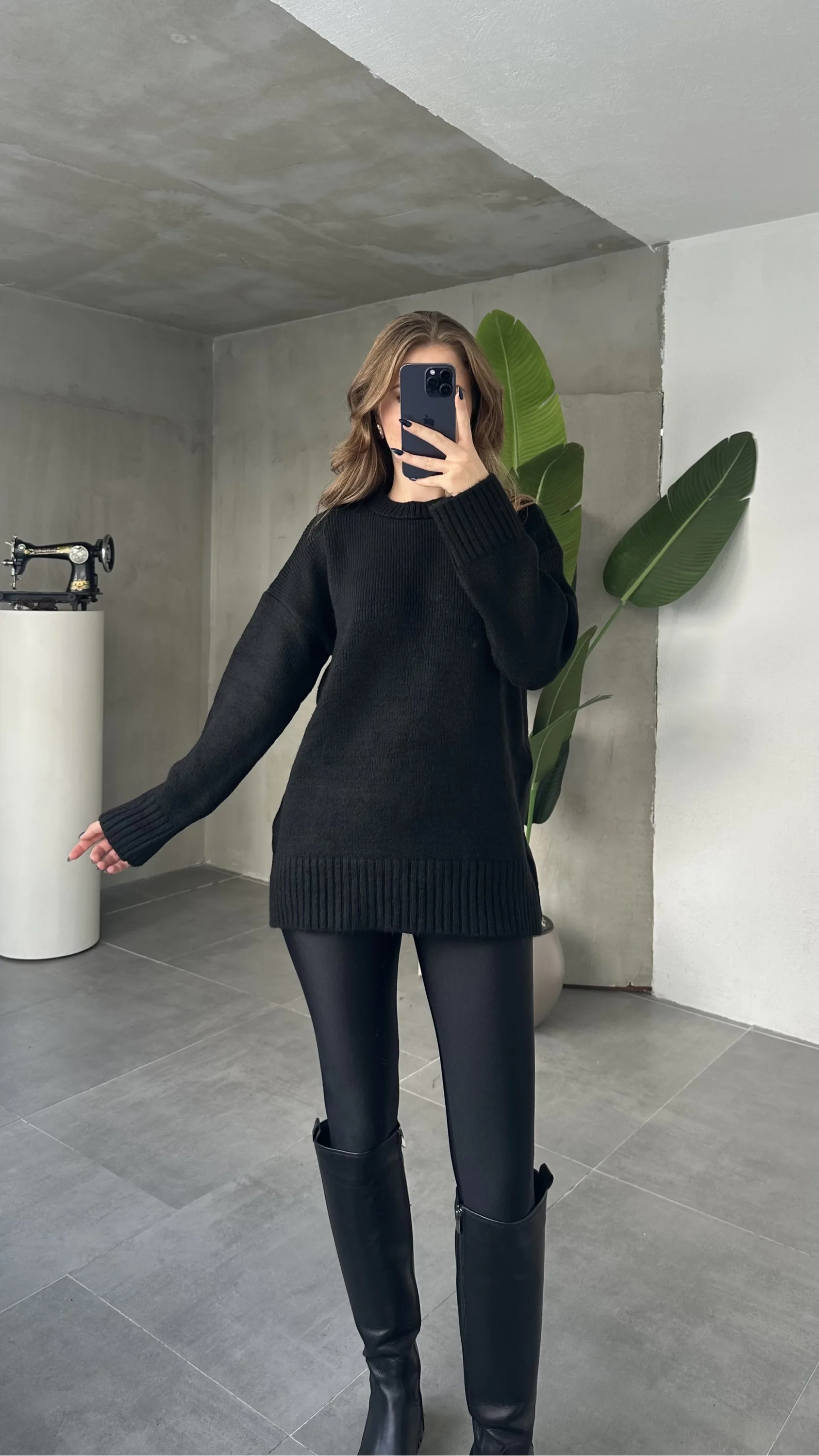 Siyah Bisiklet Yaka Tam Salaş Oversize Uzun Triko Kazak