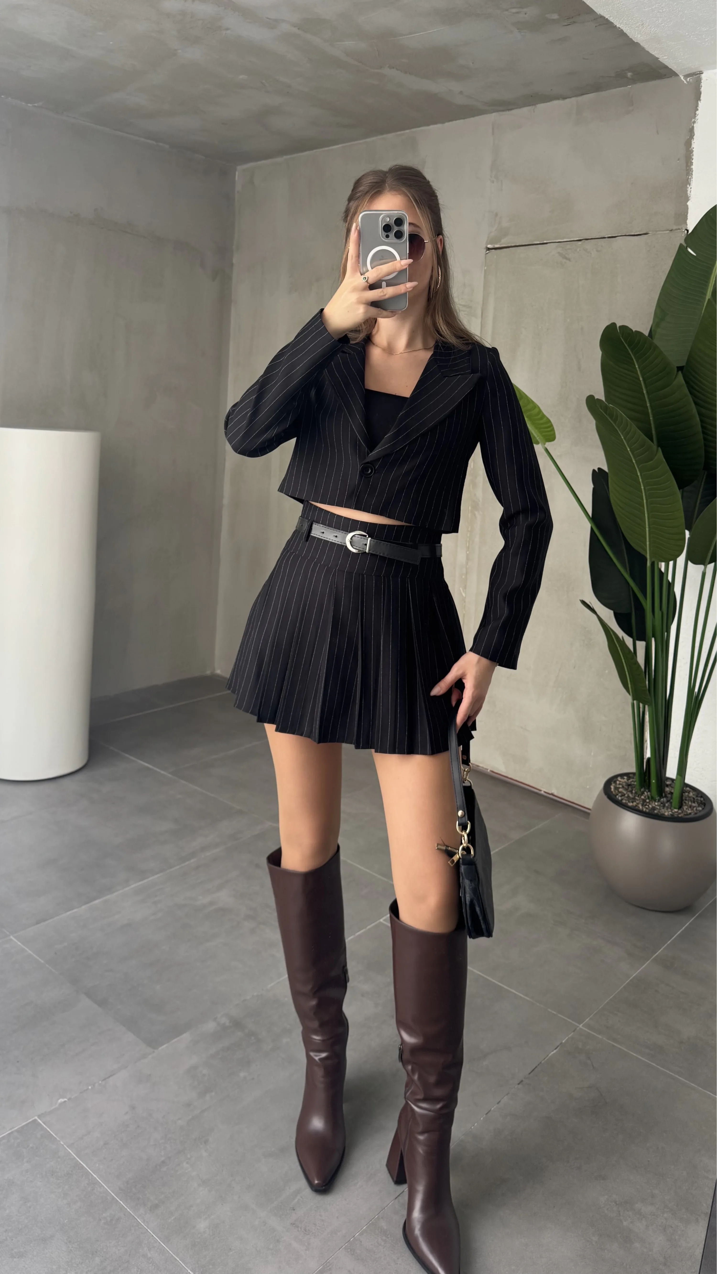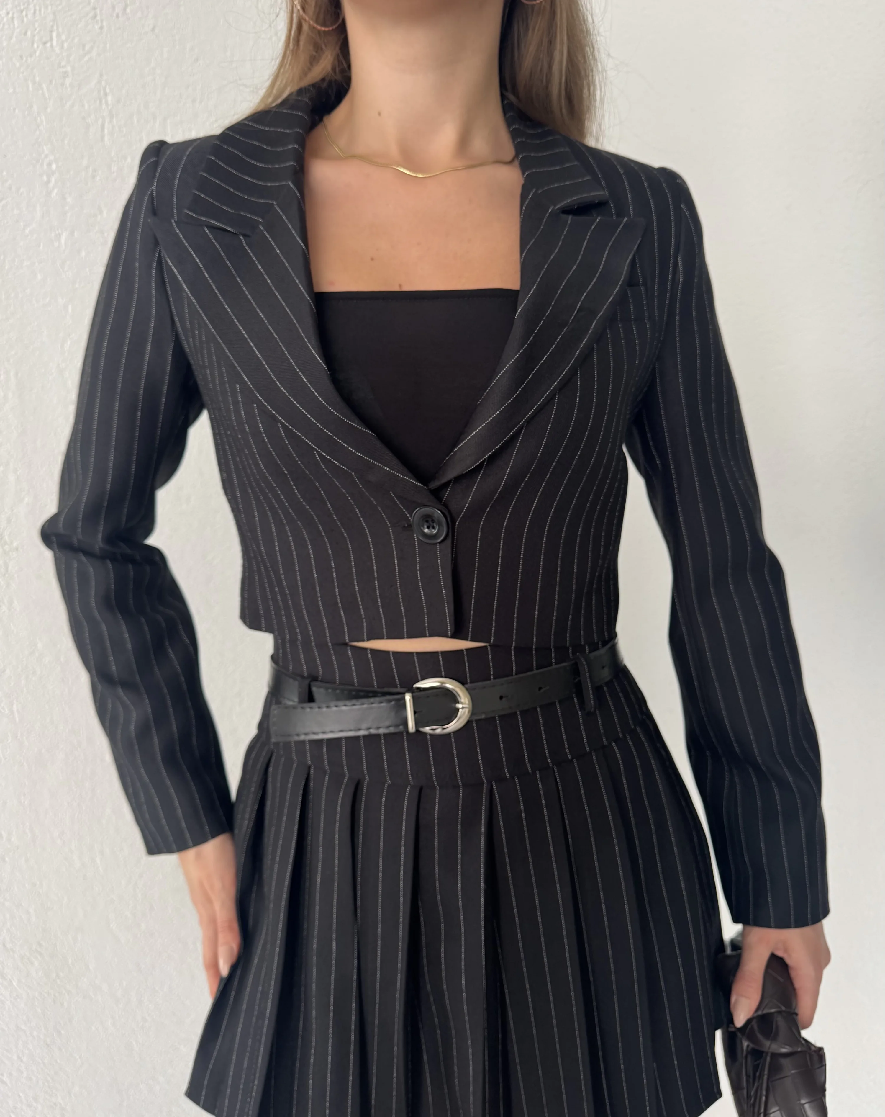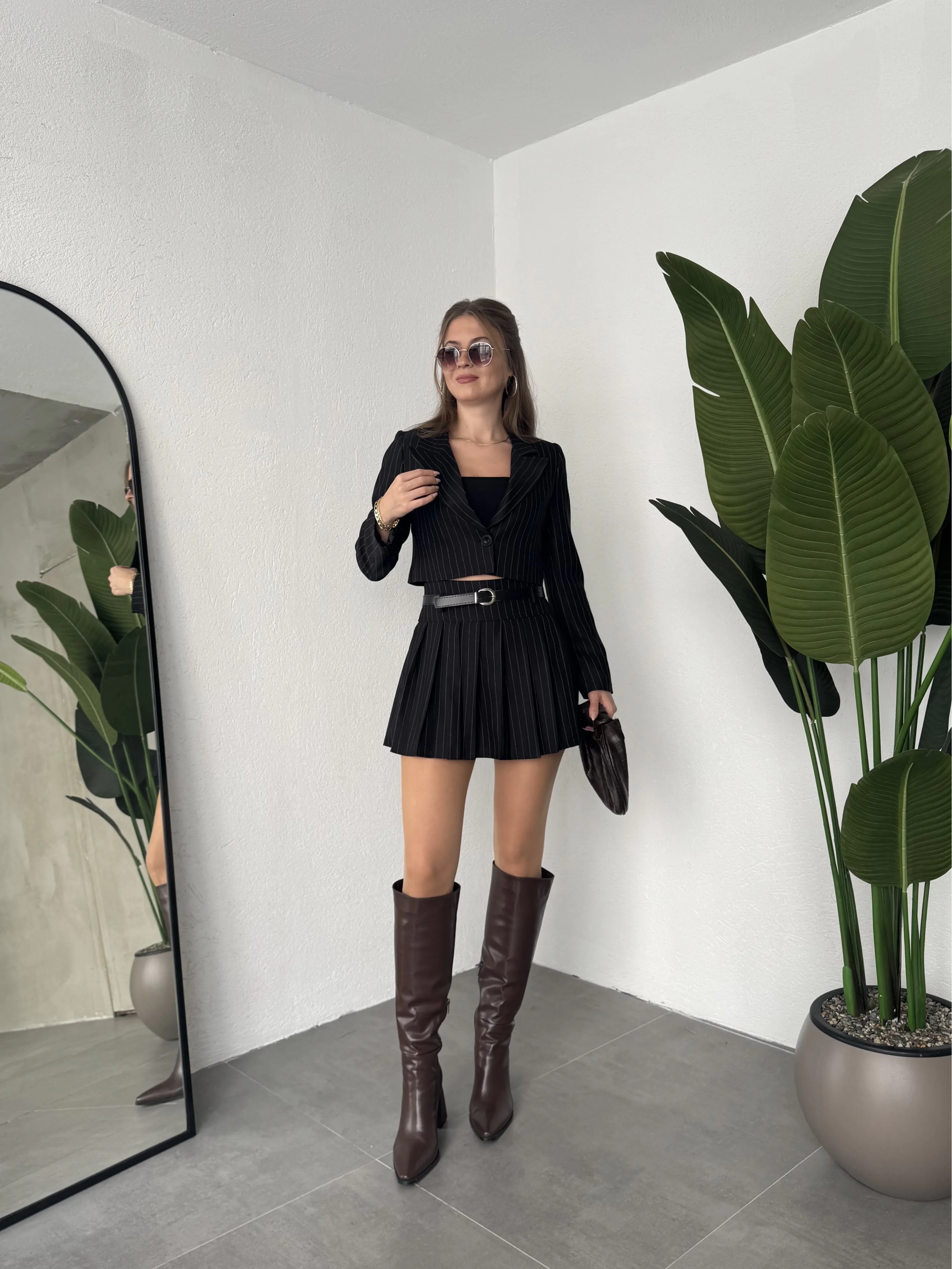 Siyah Çizgili Crop Ceket Kemerli Astarlı Pileli Etek Takım