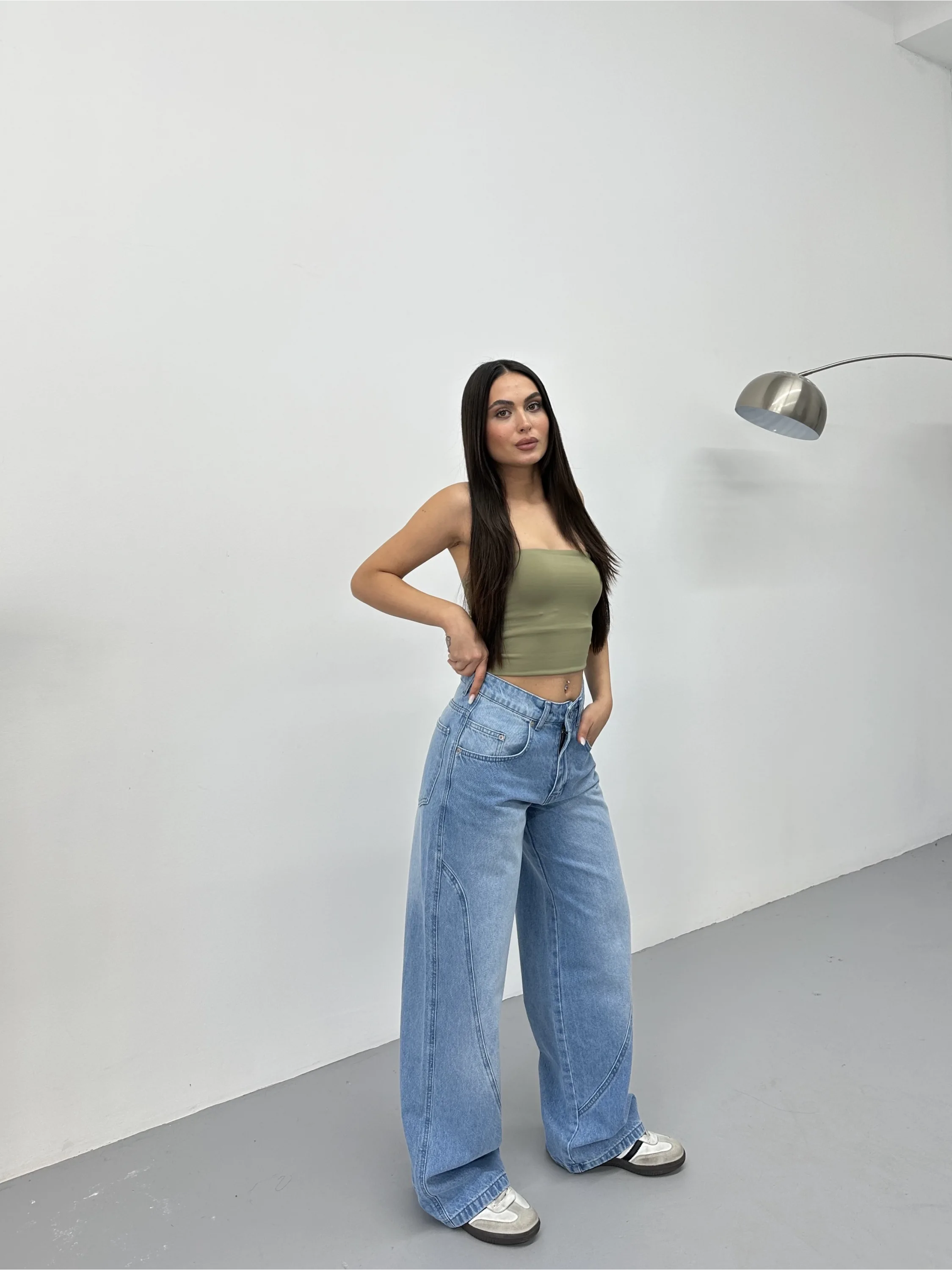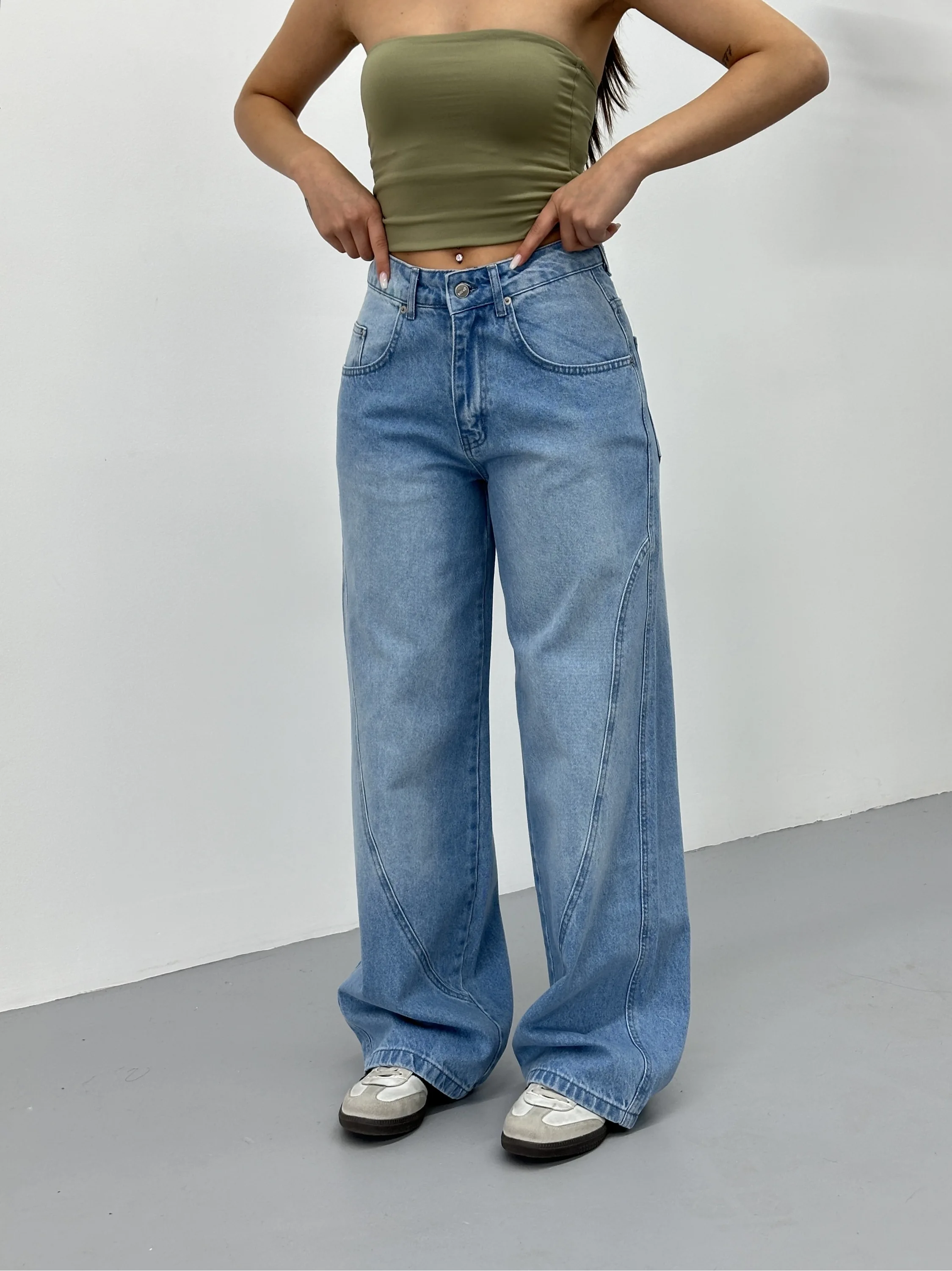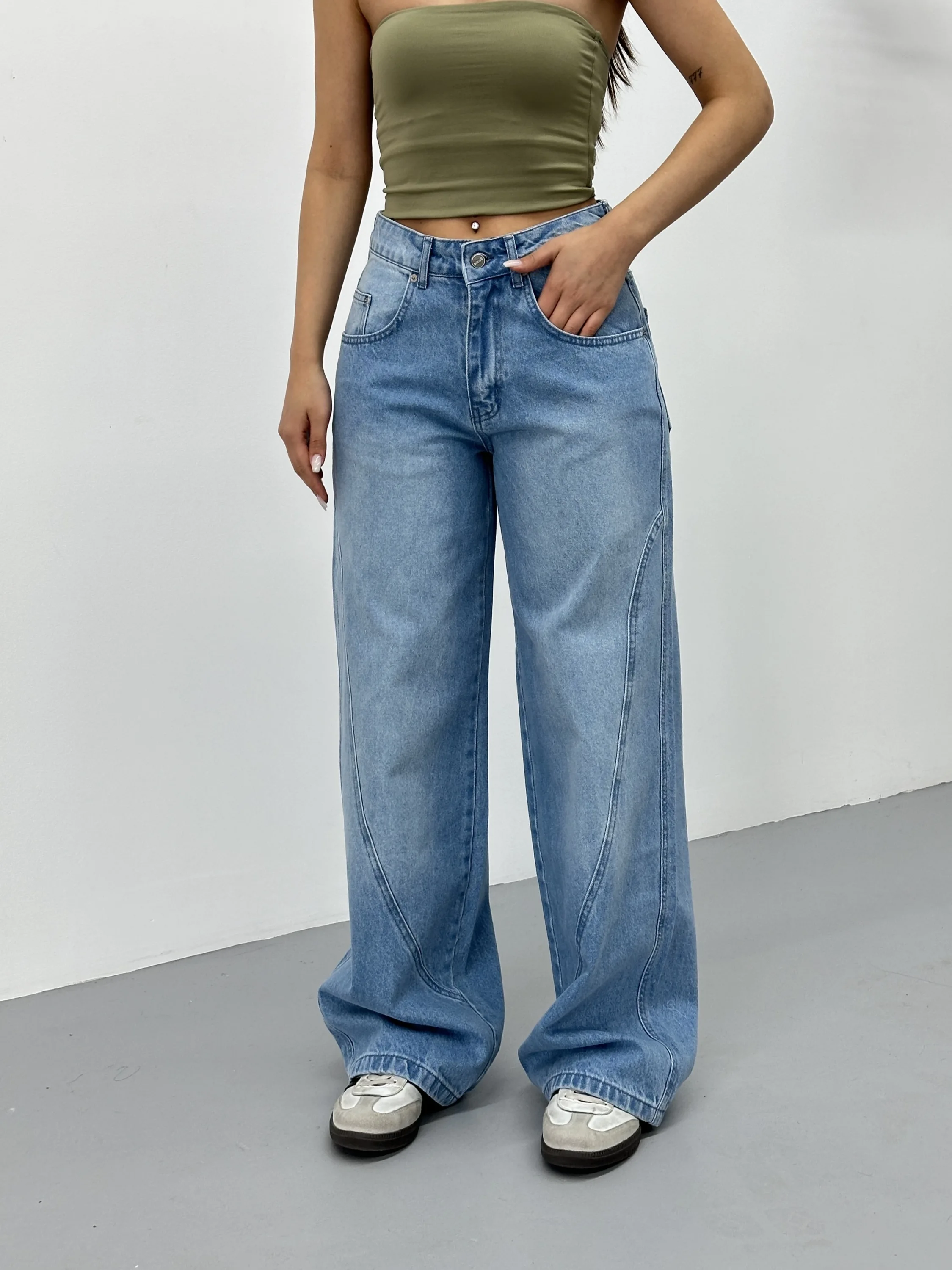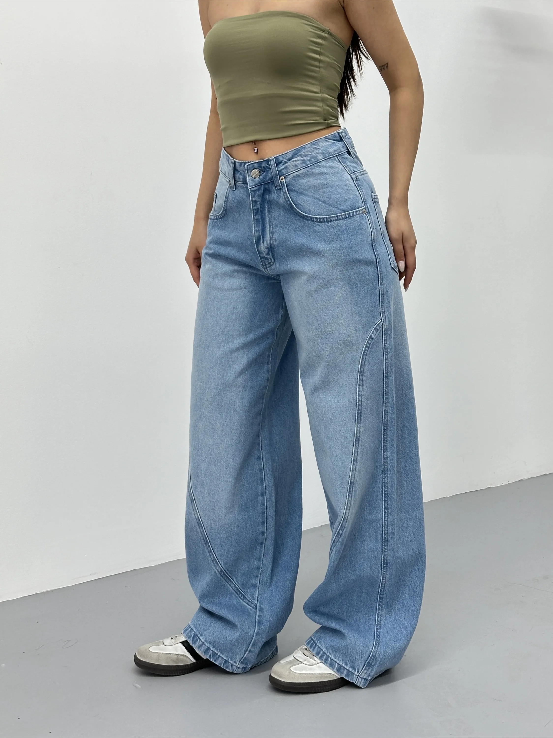 Mavi Dikiş Detaylı Yıkamalı Baggy Geniş Paça Yüksek Bel Oturtmalı Jean Kot Pantolon