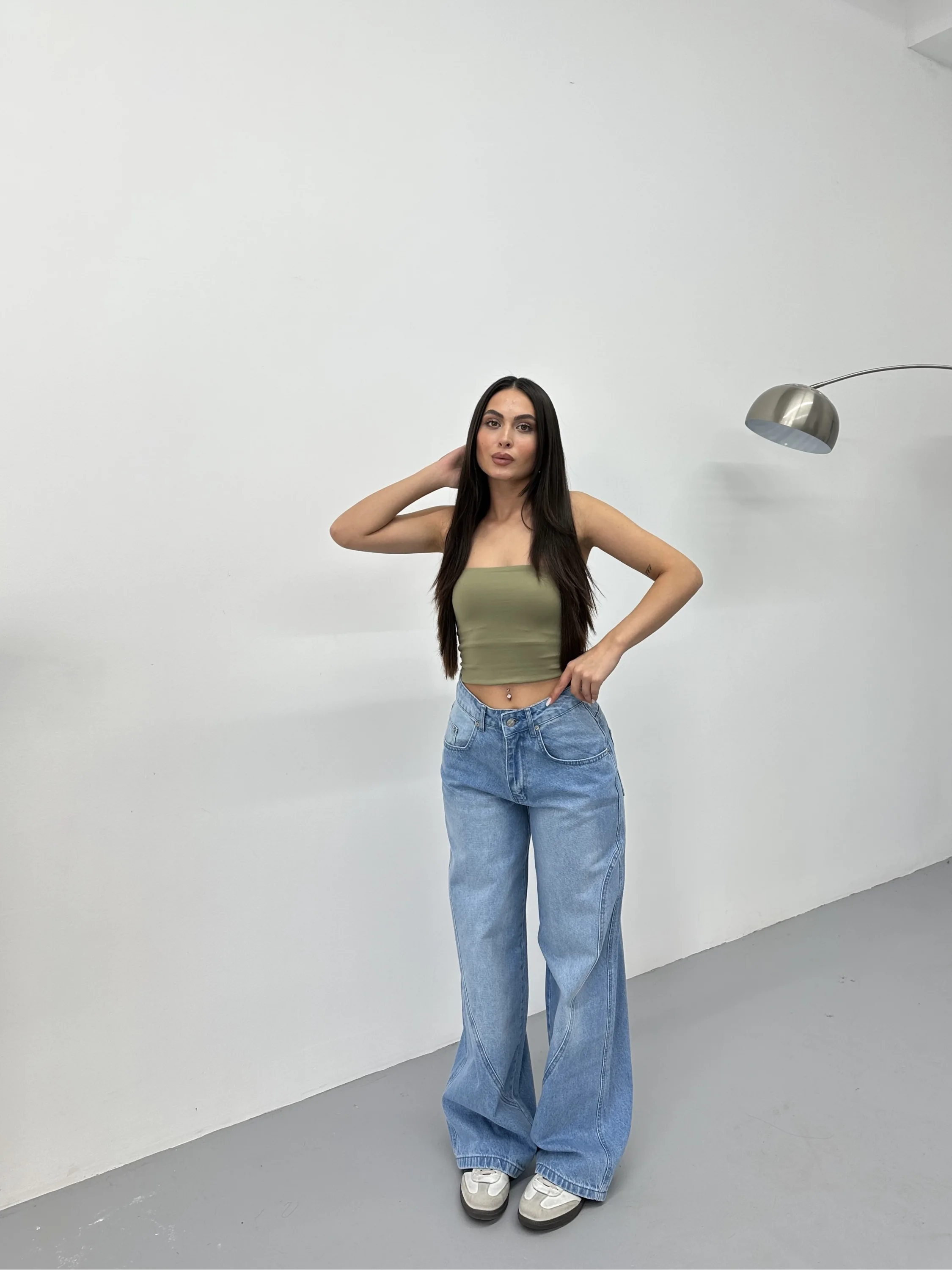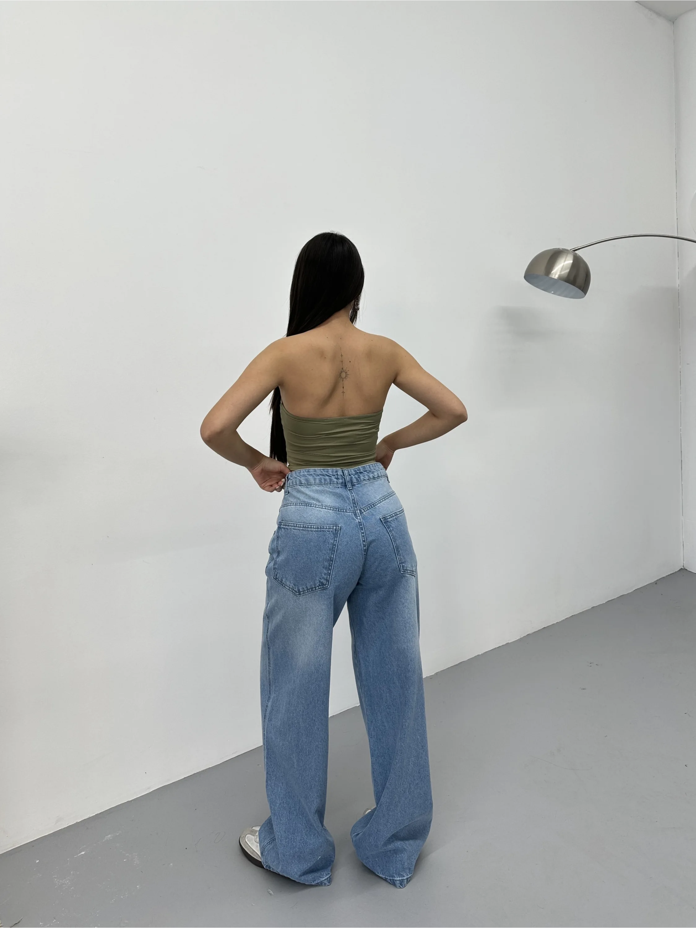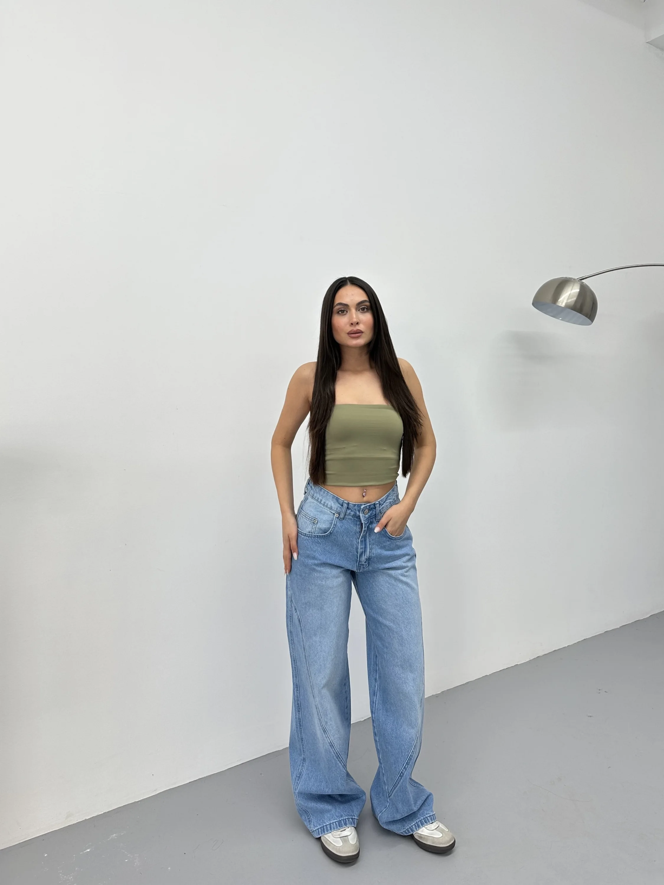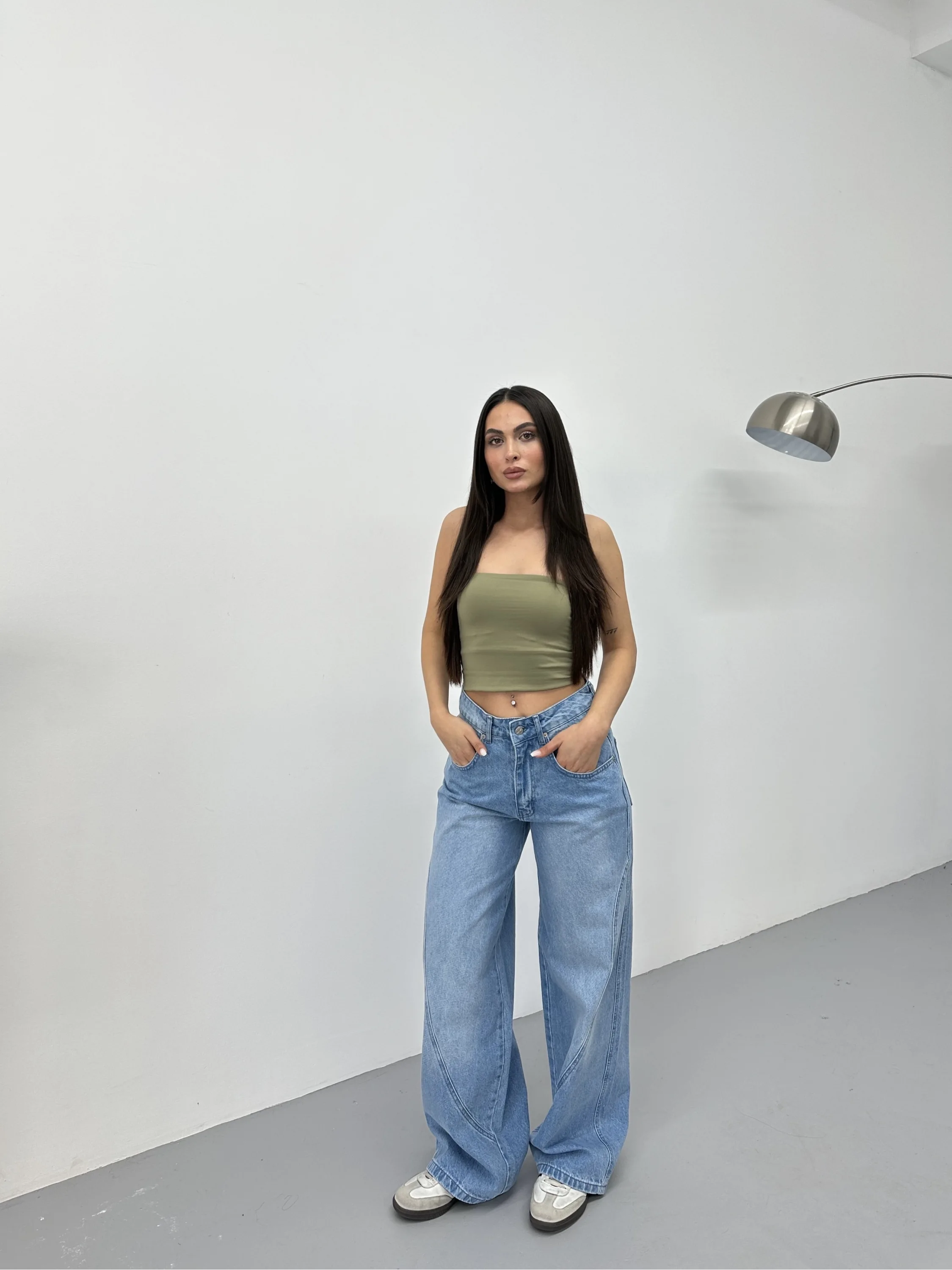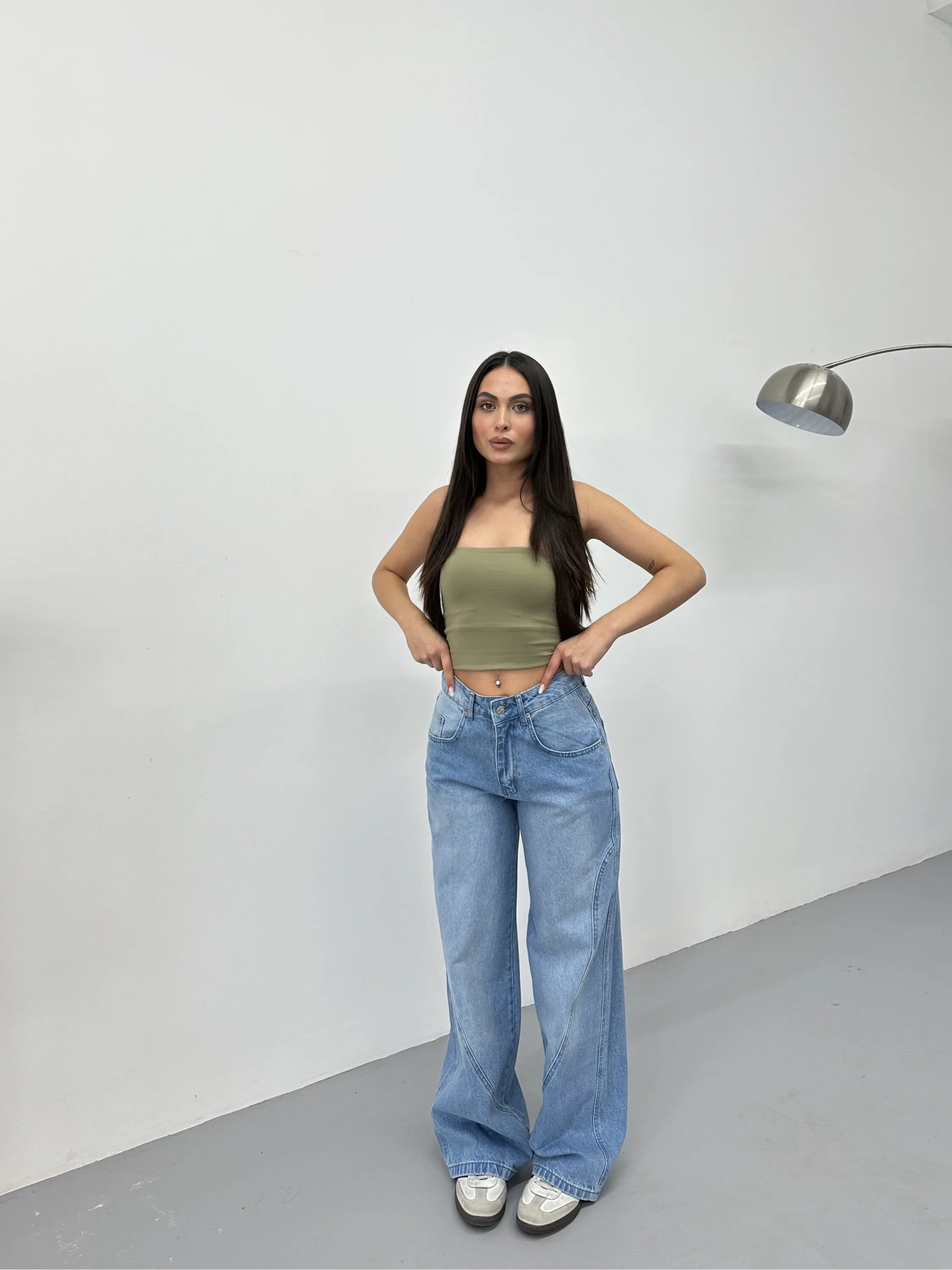 Mavi Dikiş Detaylı Yıkamalı Baggy Geniş Paça Yüksek Bel Oturtmalı Jean Kot Pantolon