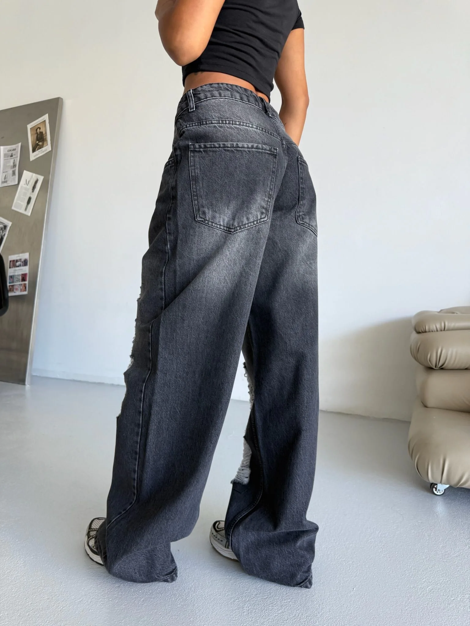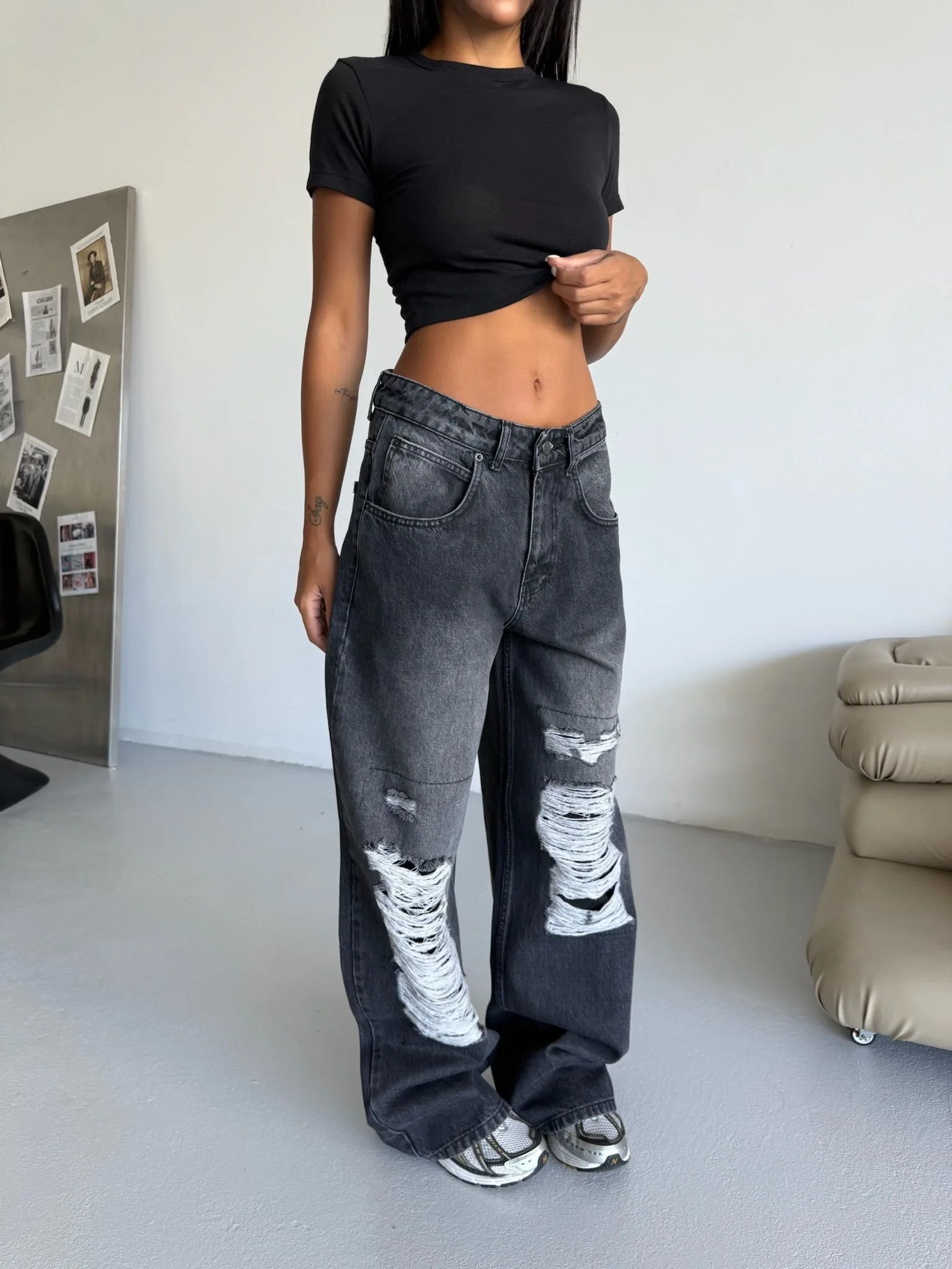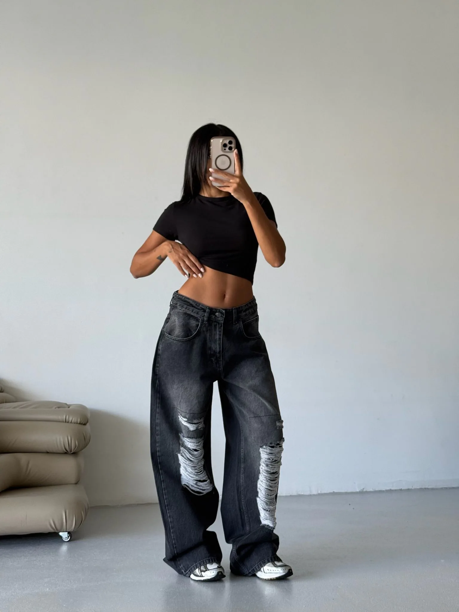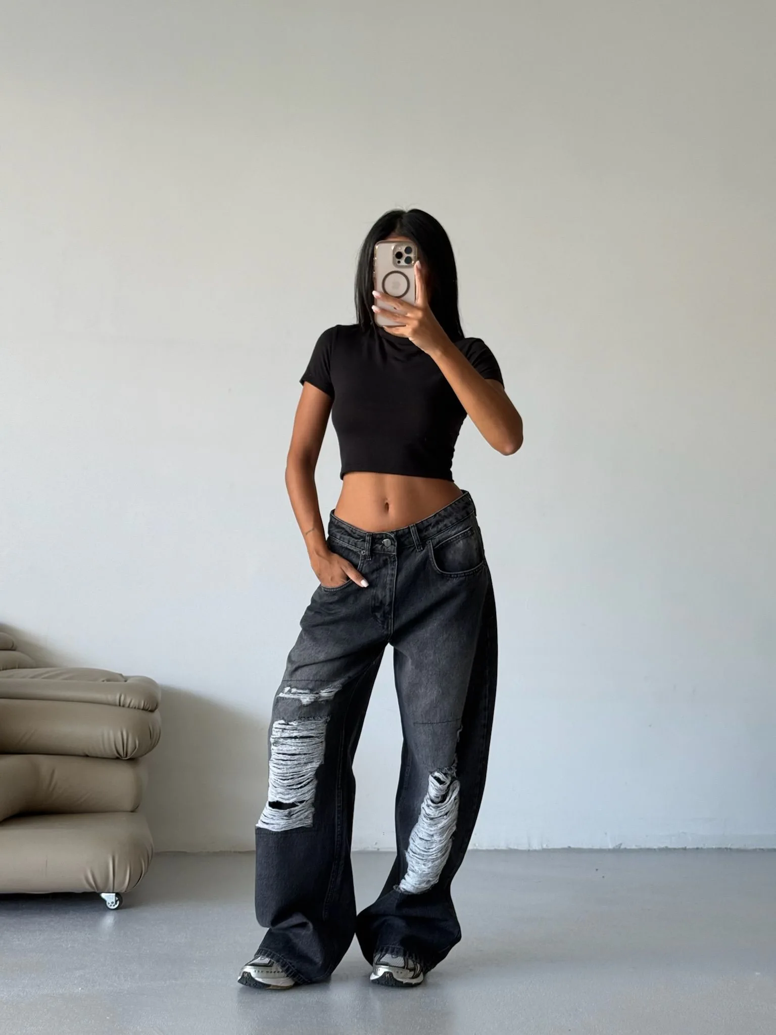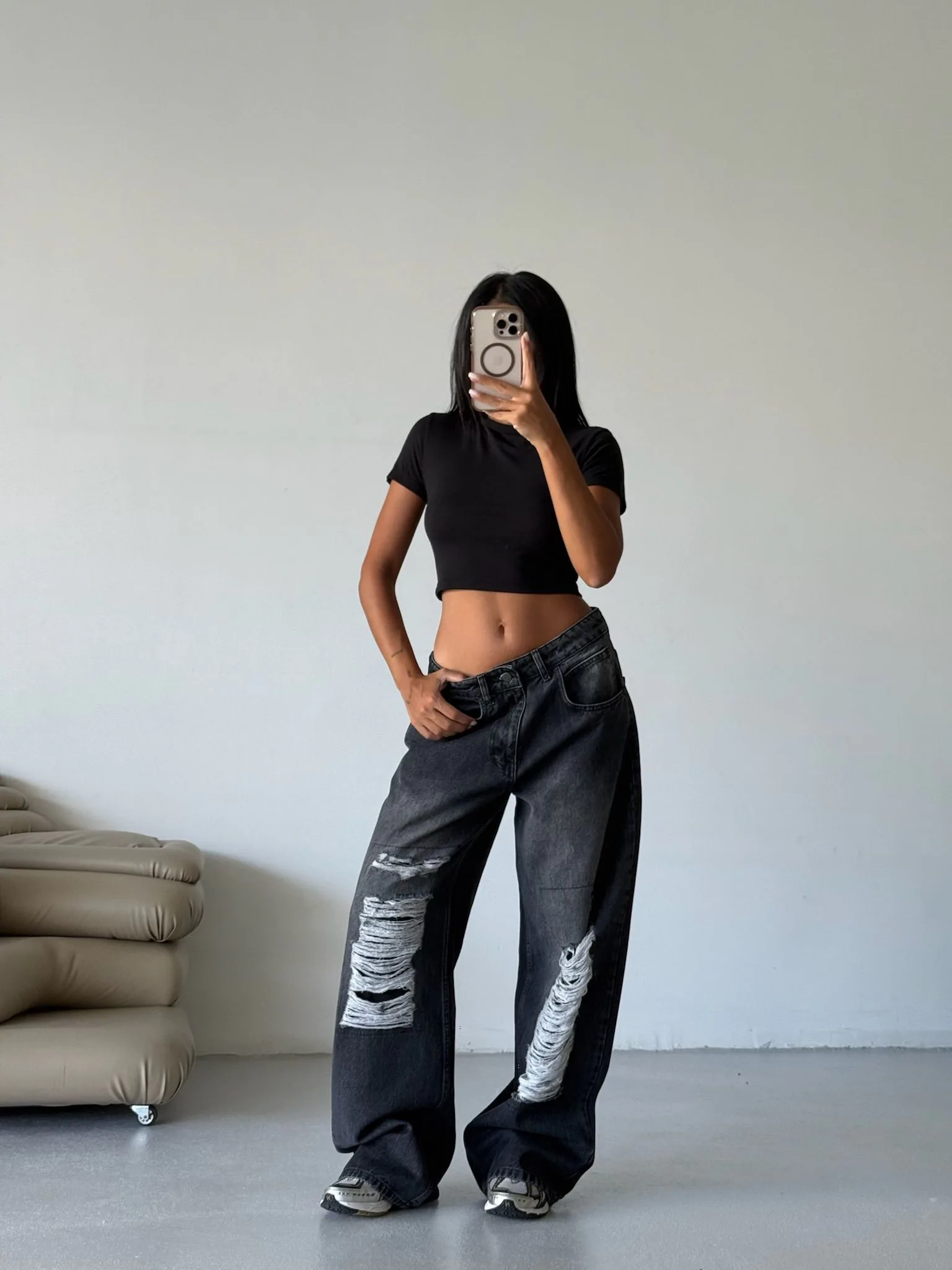 Siyah Dizi Yırtık Yıkamalı Baggy Geniş Paça Yüksek Bel Oturtmalı Jean Kot Pantolon