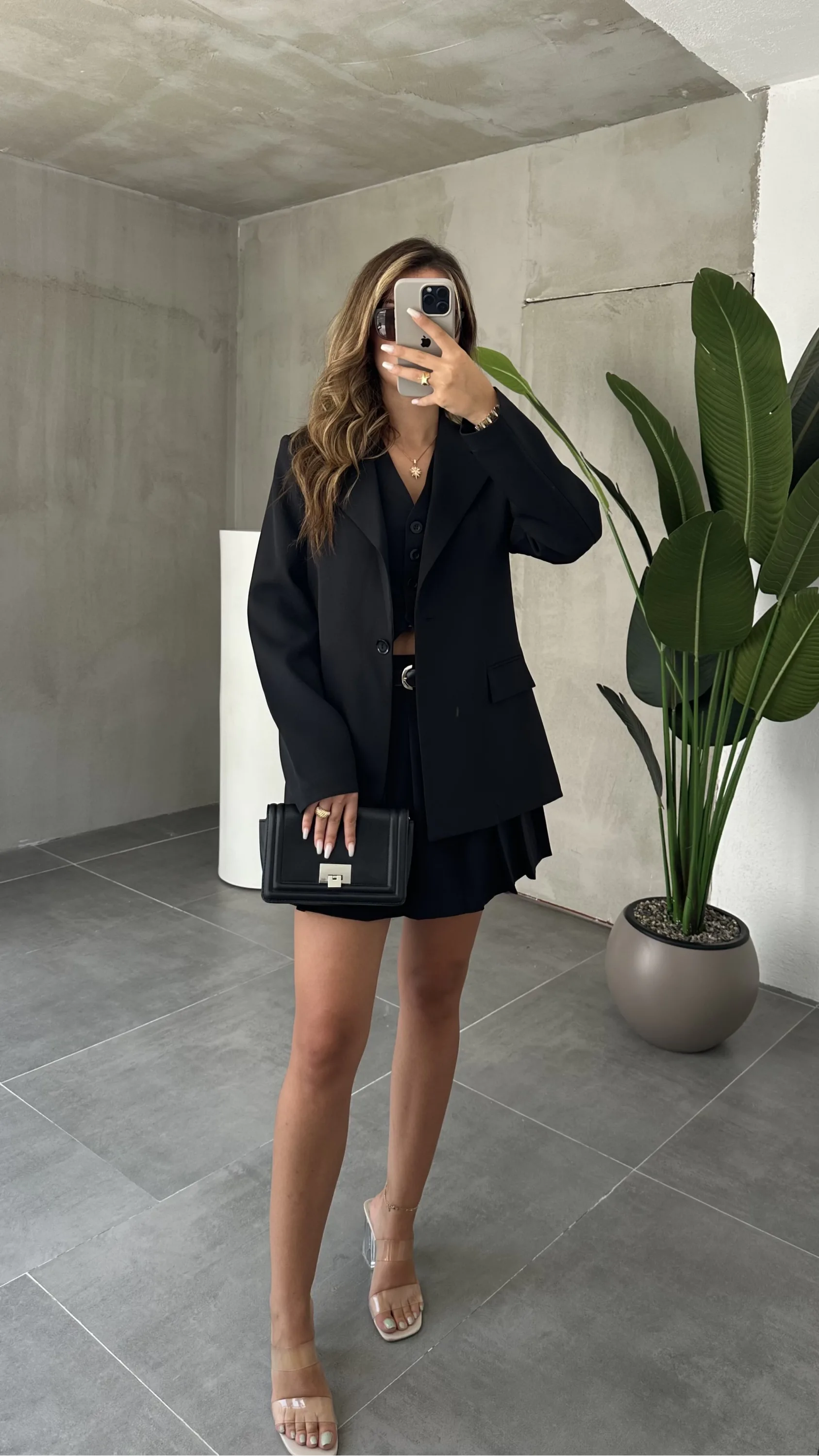 Siyah Double Yelek-Etek & Blazer Ceket Üçlü Set Takım