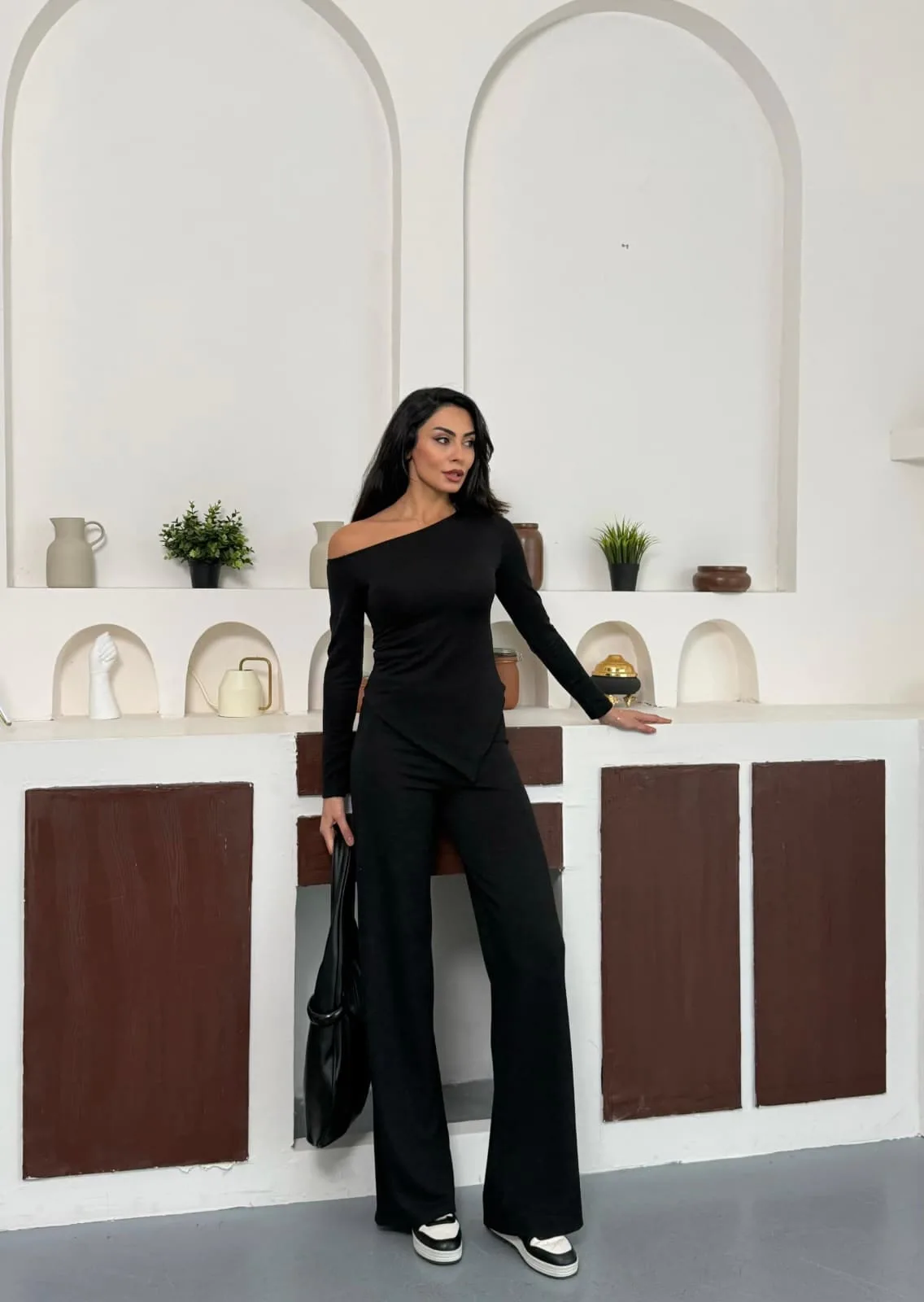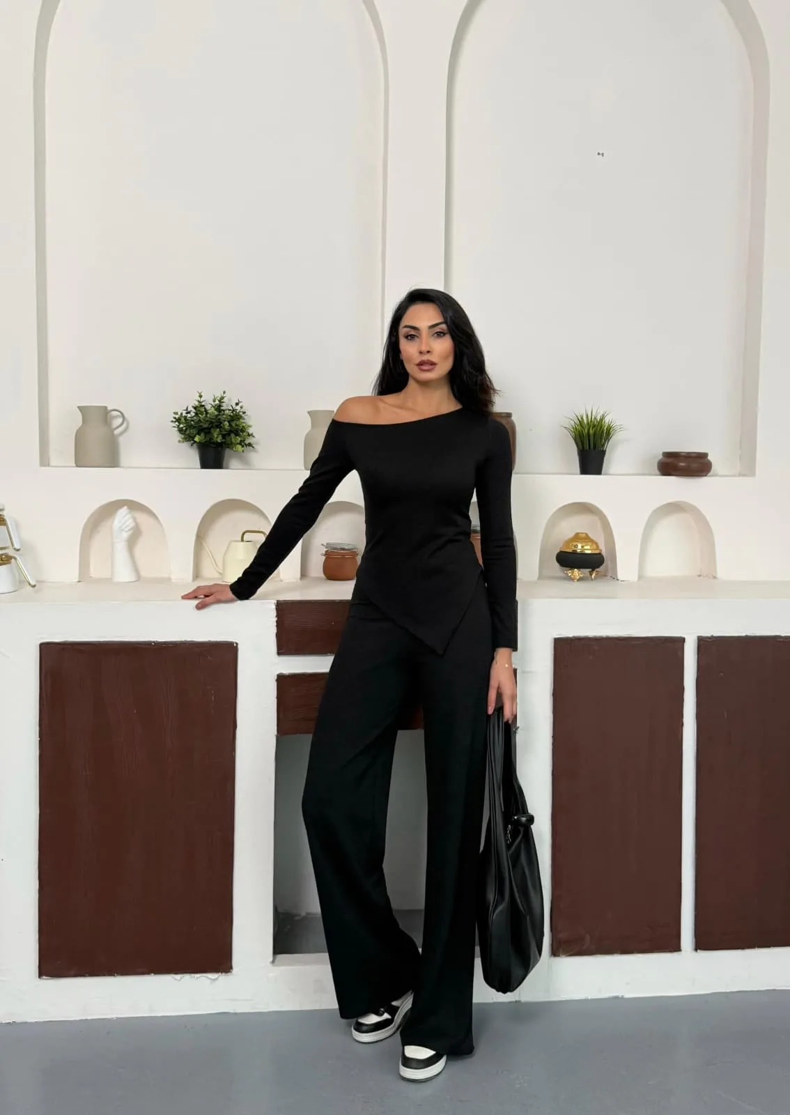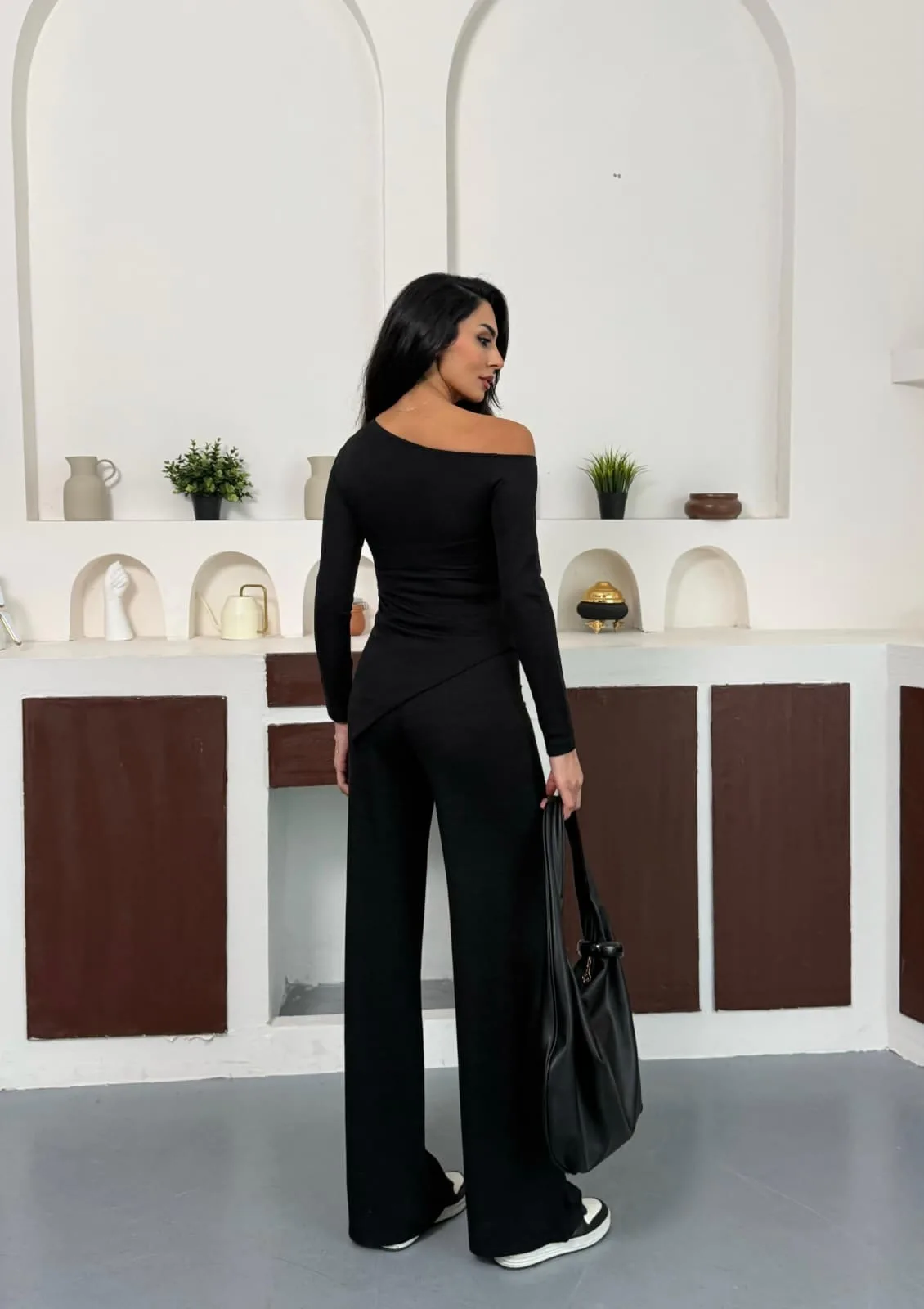 Siyah Kayık Yaka Asimetrit Kesim Bluz İspanyol Paça Pantolon İkili Takım