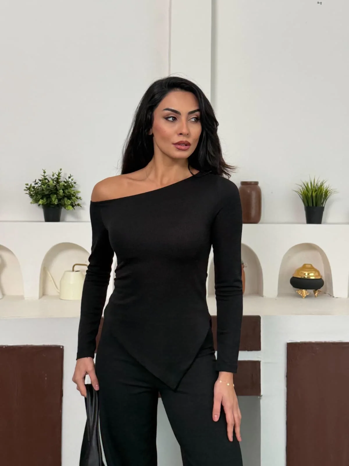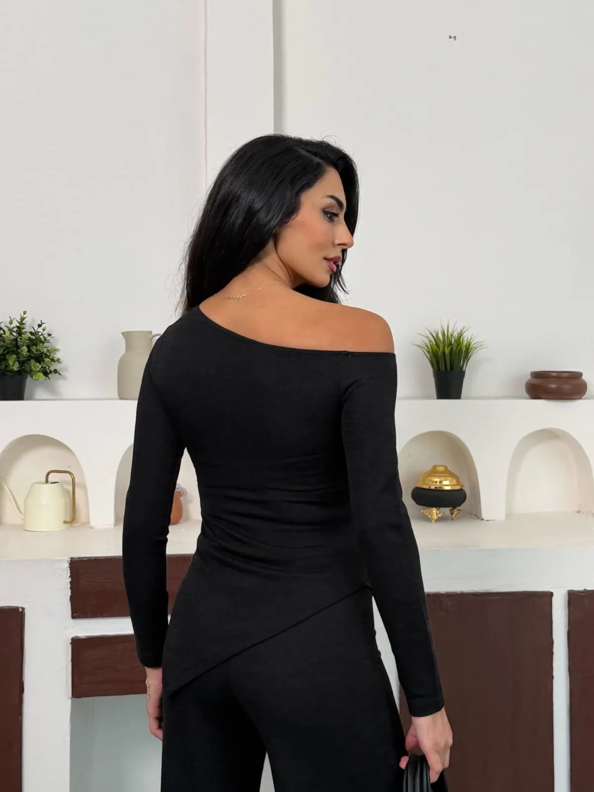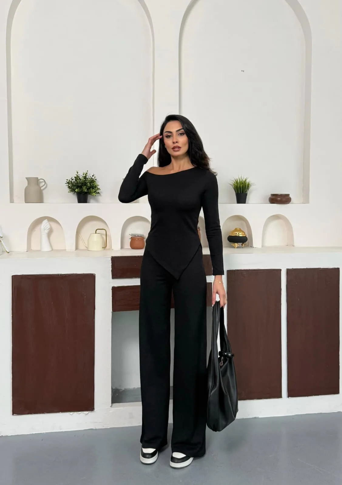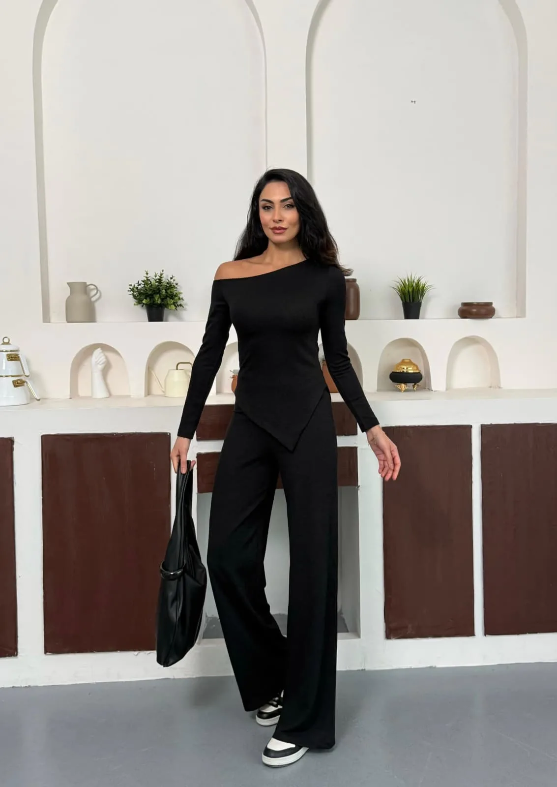 Siyah Kayık Yaka Asimetrit Kesim Bluz İspanyol Paça Pantolon İkili Takım