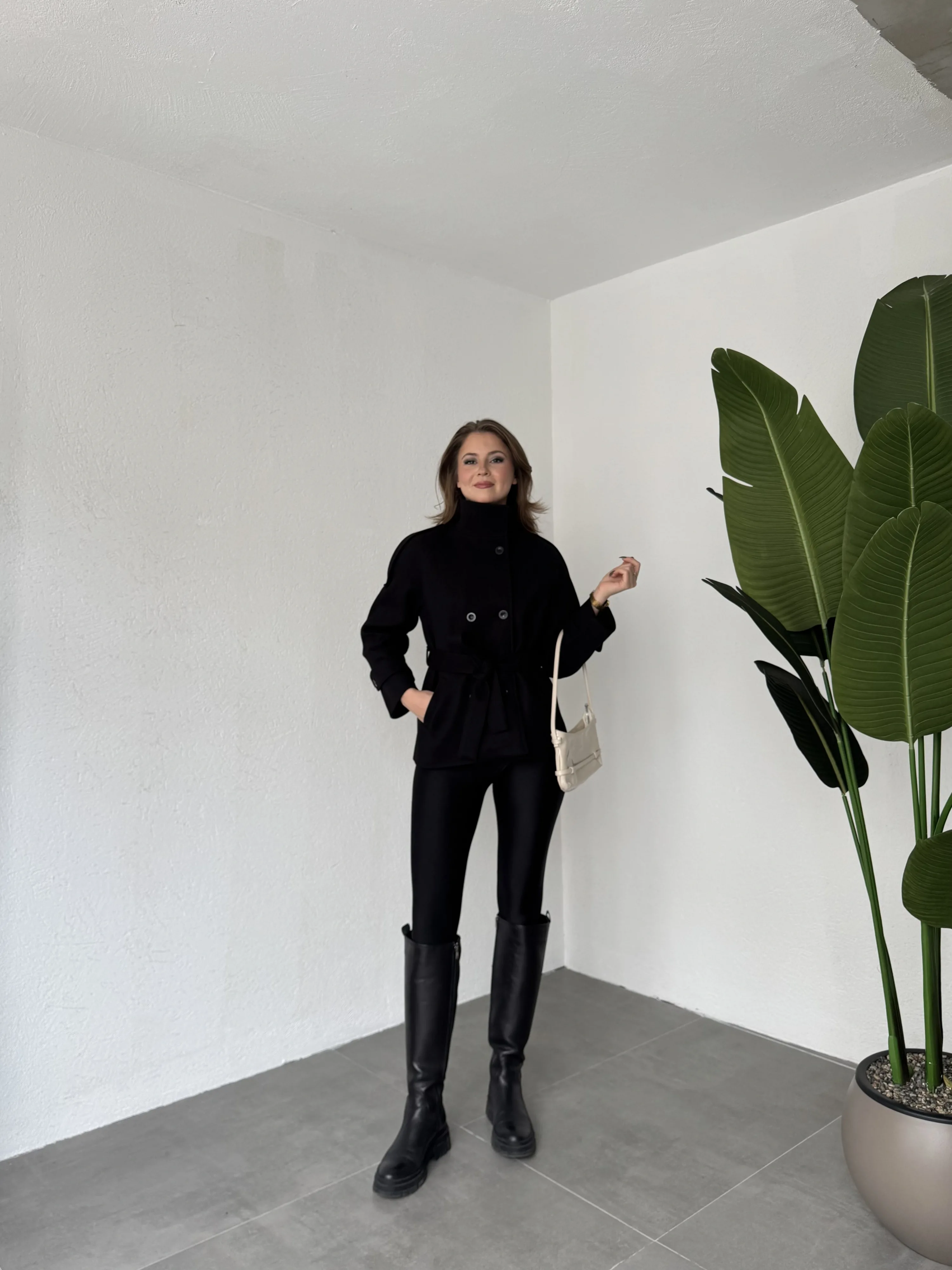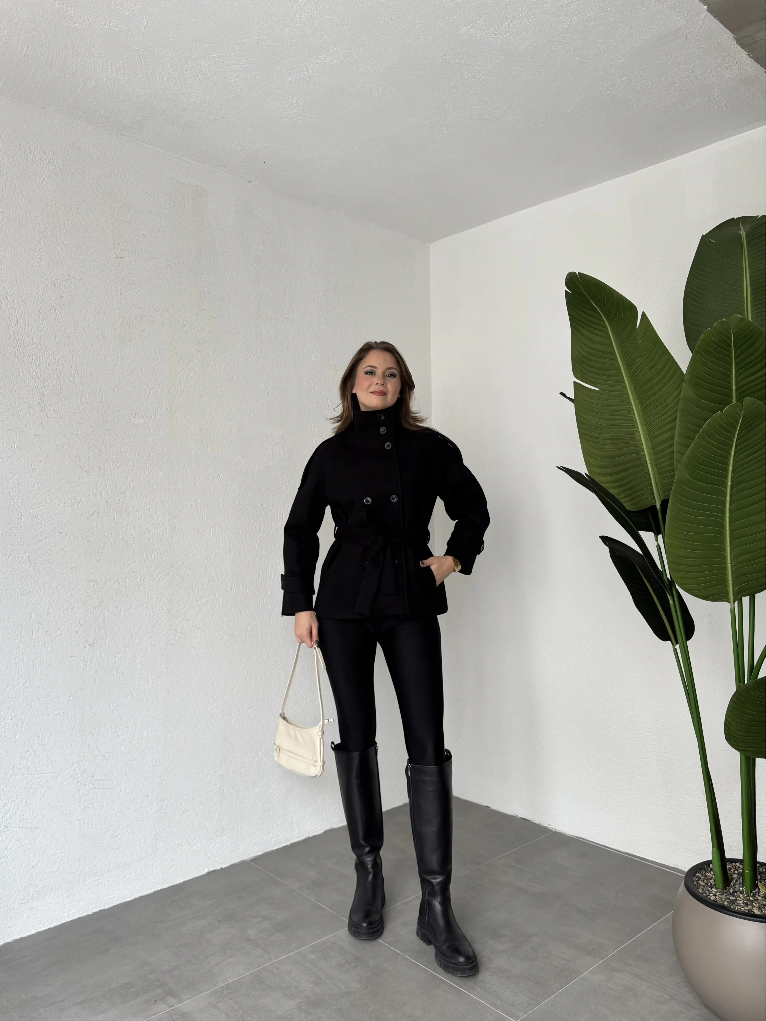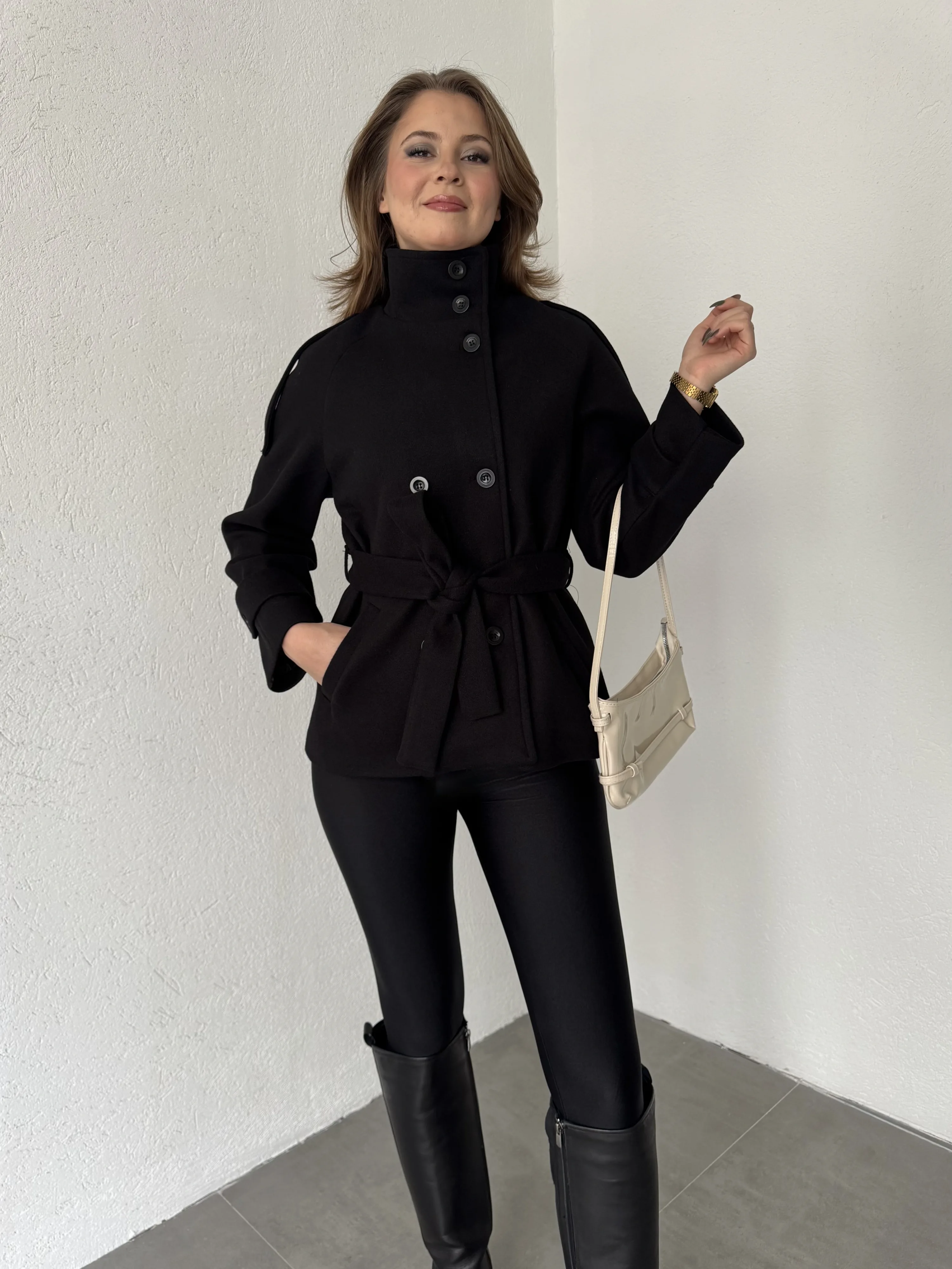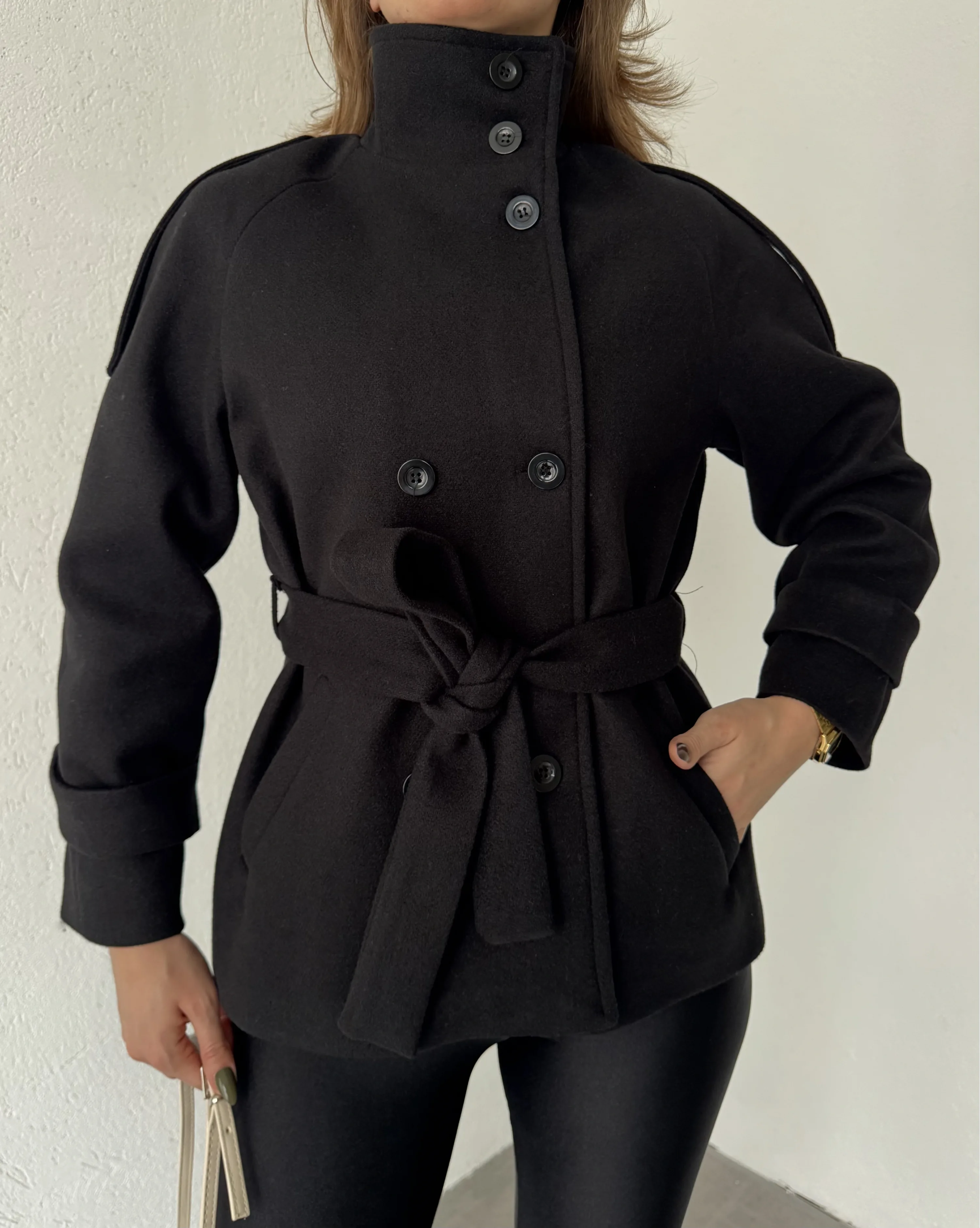 Siyah Bisiklet Yaka Şal Aksesurlı Düğmeli Kaşe Ceket Mont