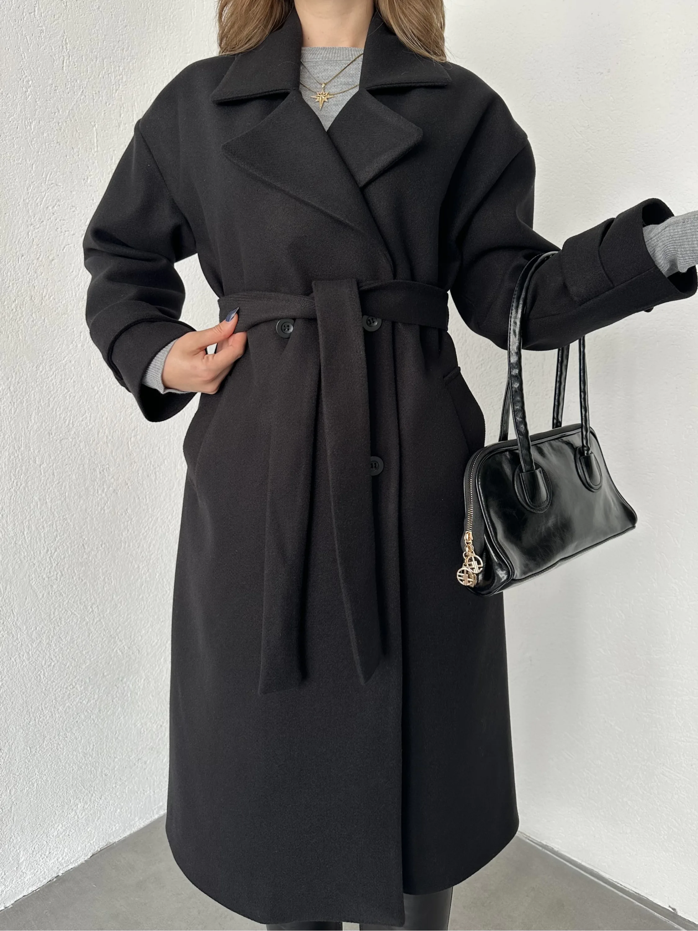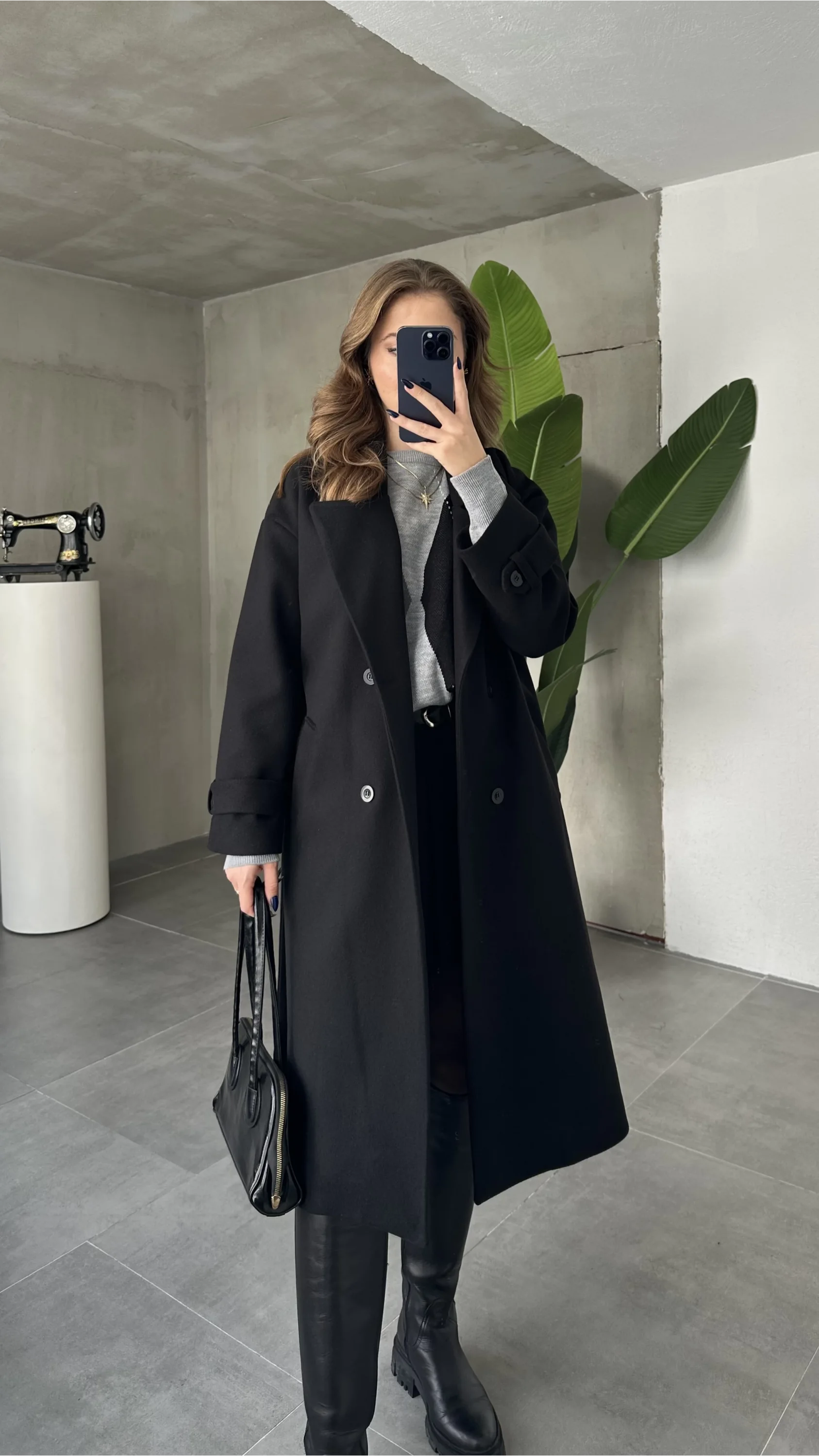 Siyah Kruvaze Oversize Premium Kalite Kuşaklı Tam Boy Uzun Kaşe Mont
