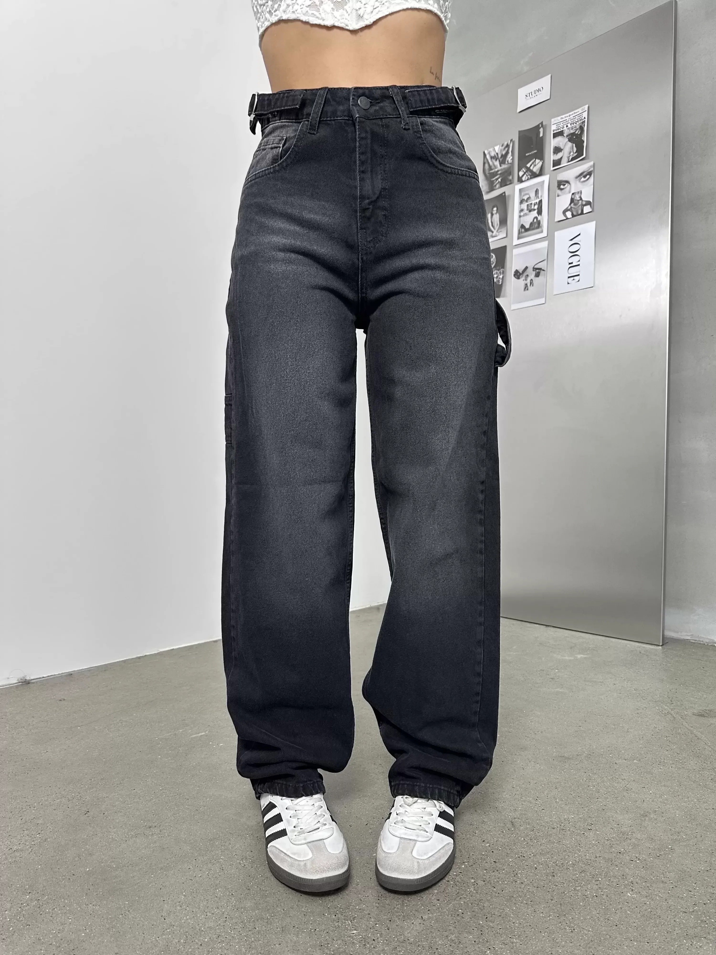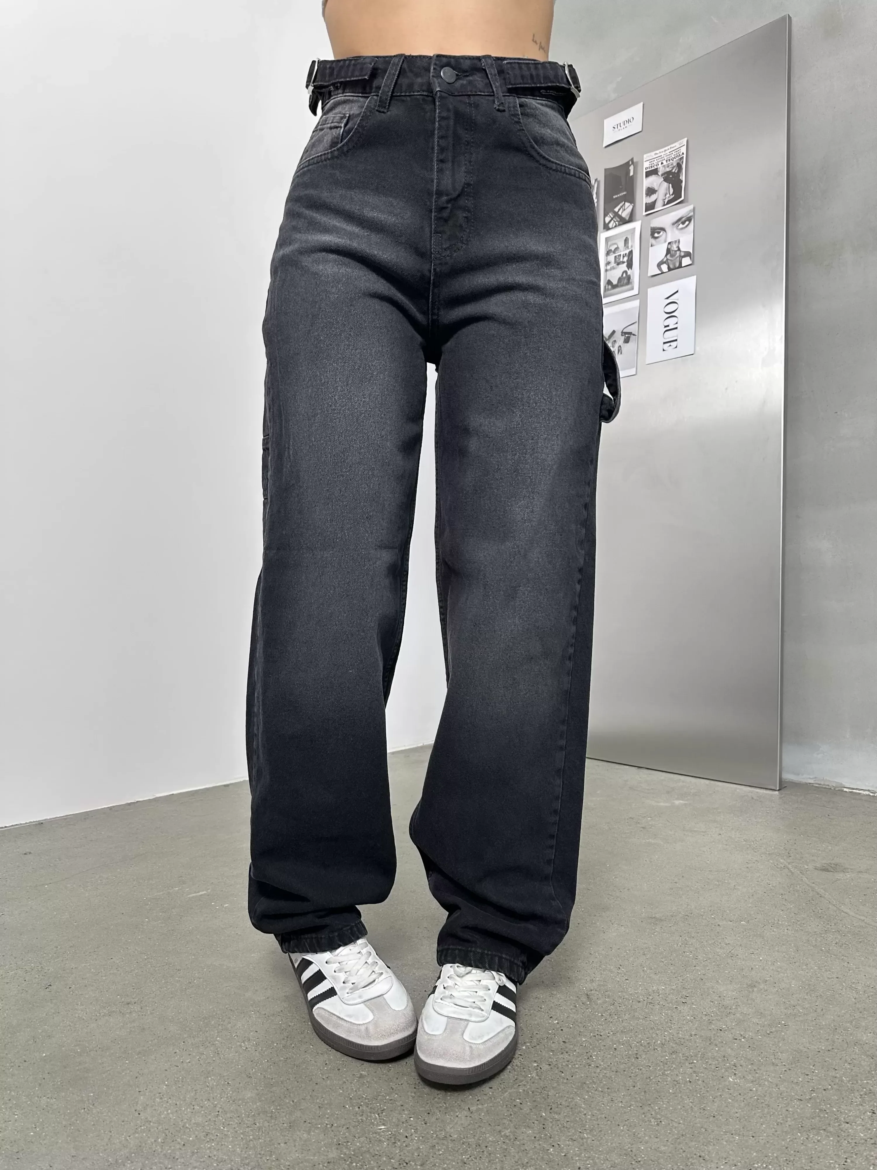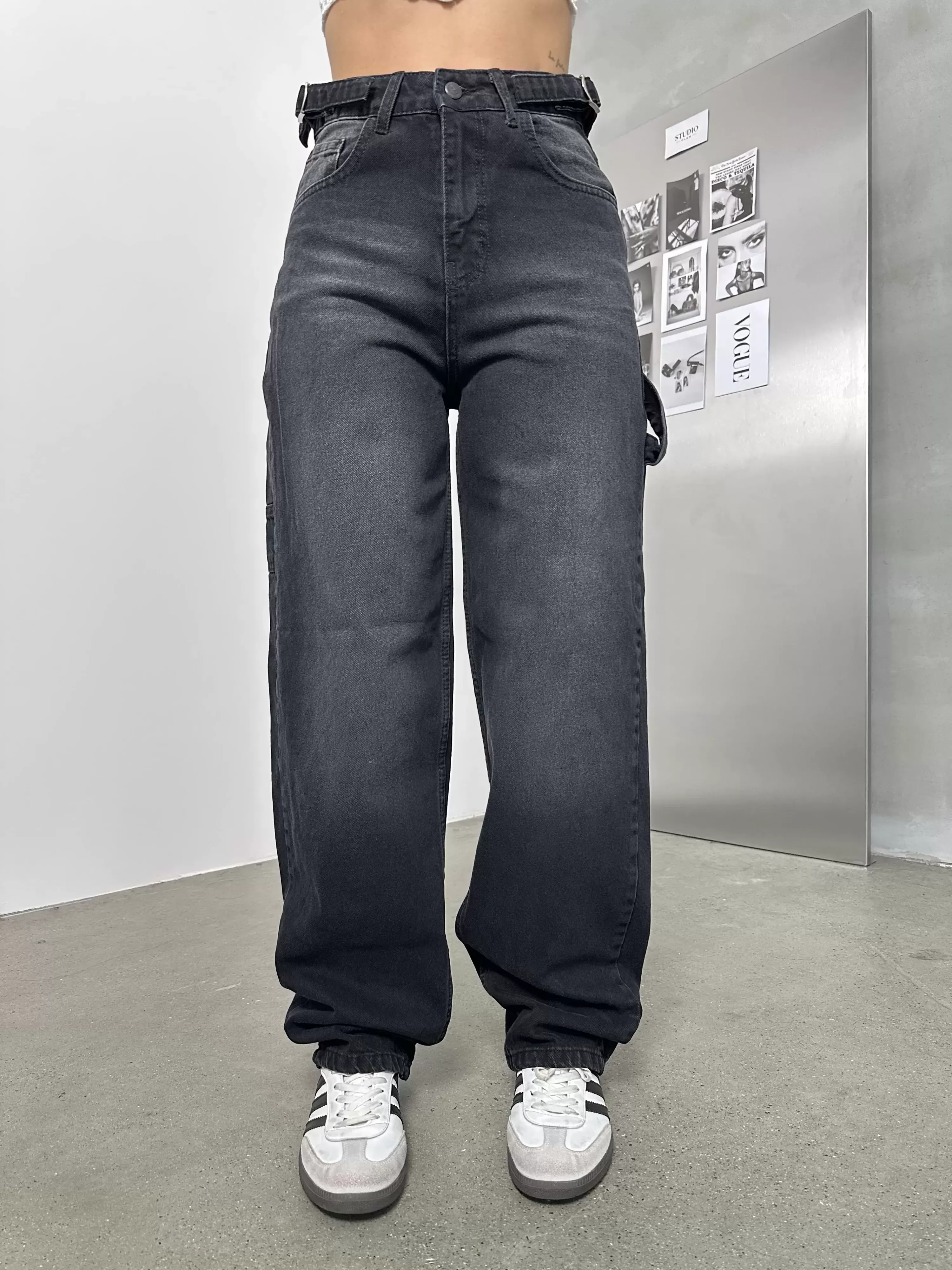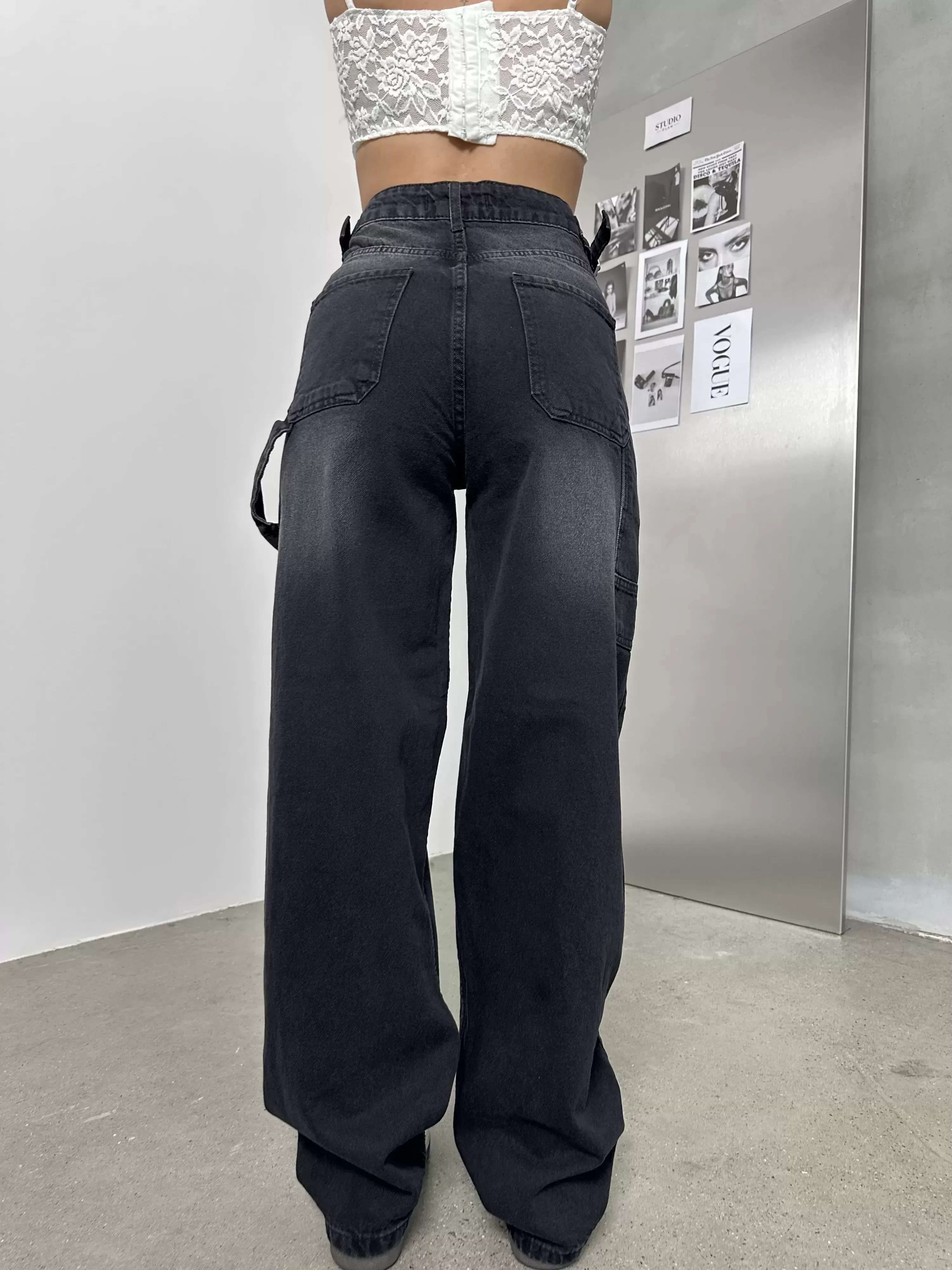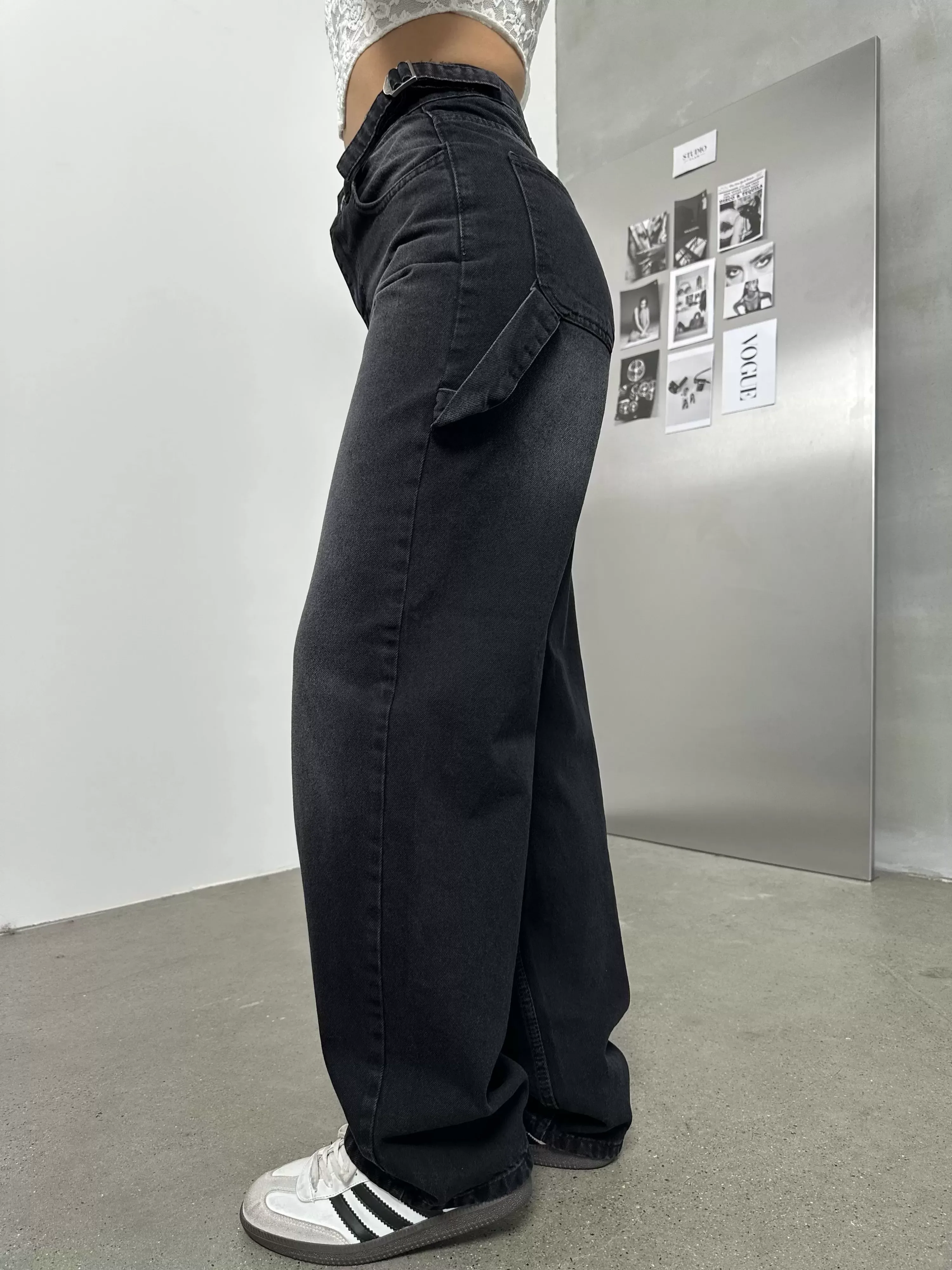 Siyah Palaska Tokalı Yıkamalı Baggy Geniş Paça Yüksek Bel Oturtmalı Jean Kot Pantolon