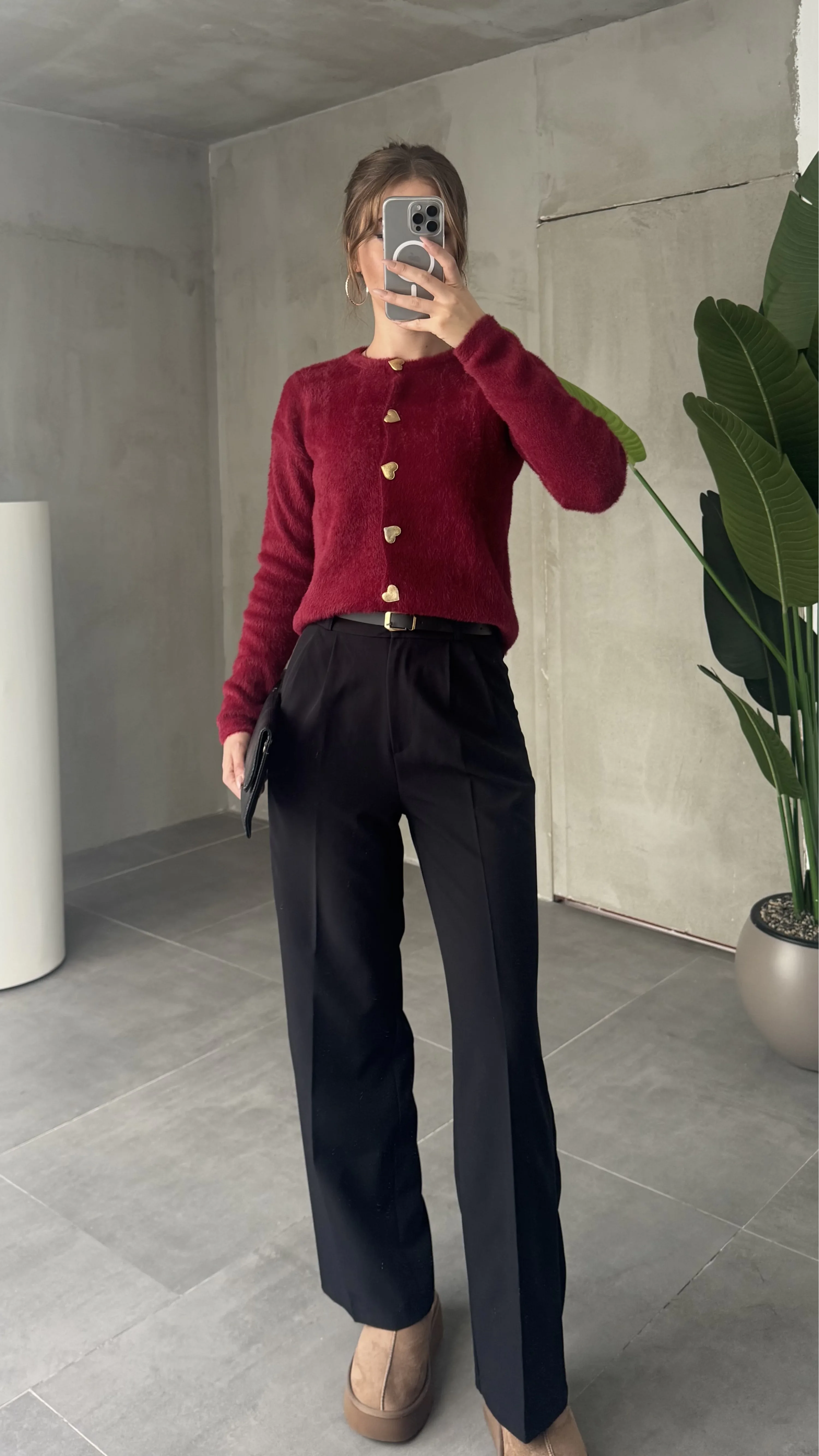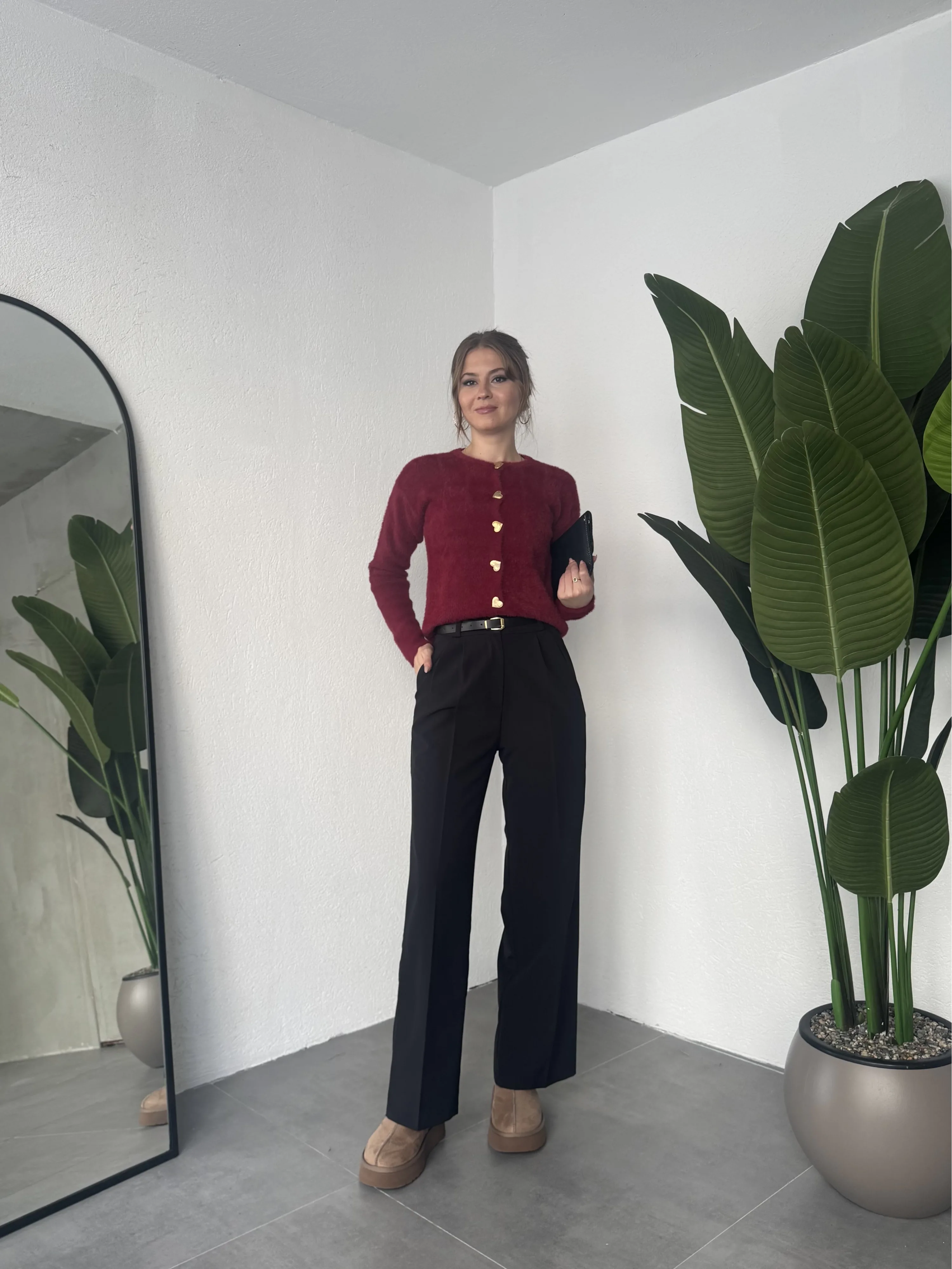Bordo Kemerli Dik Yaka Düğmeli Kaşe Pelerin Panço