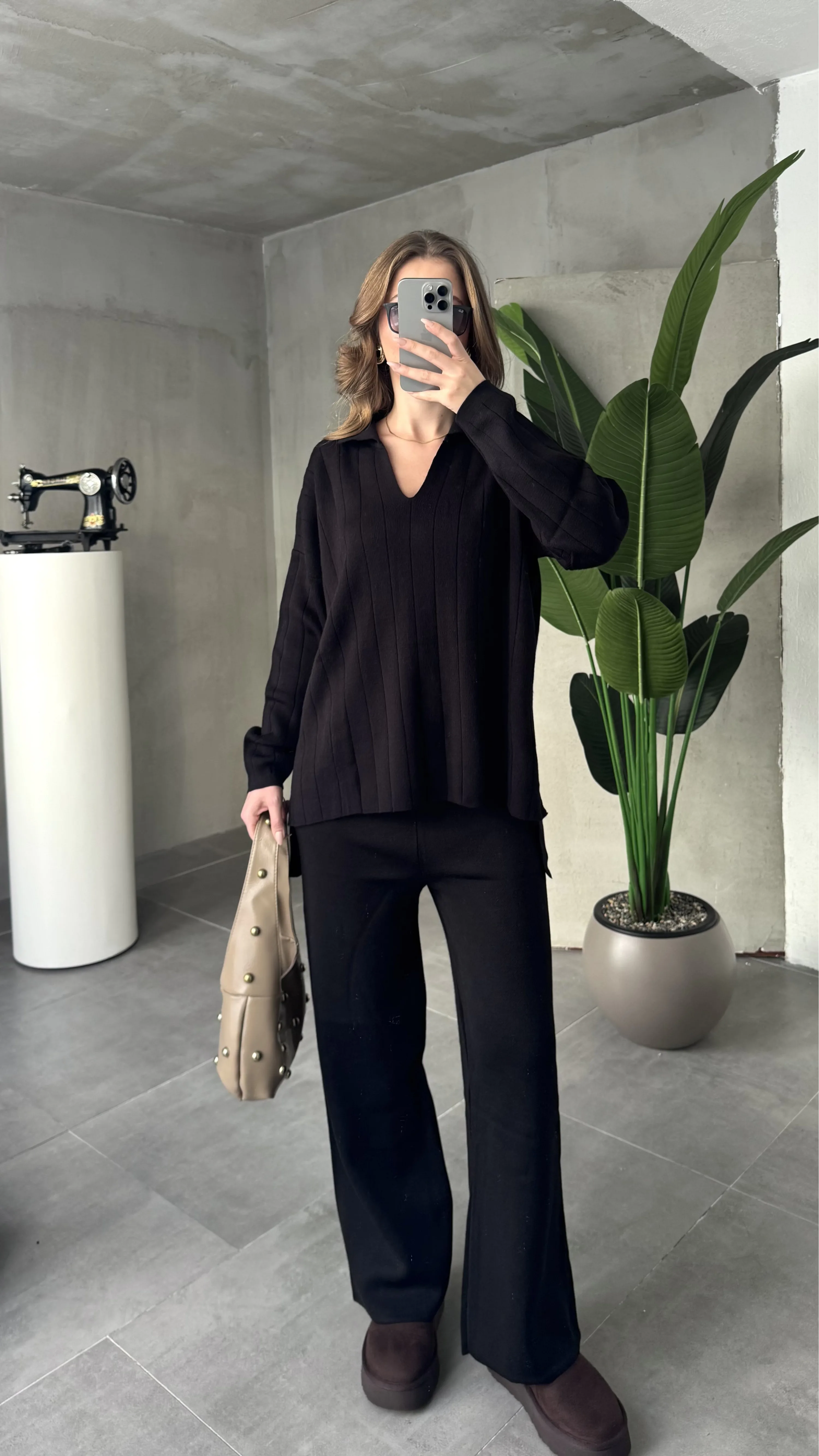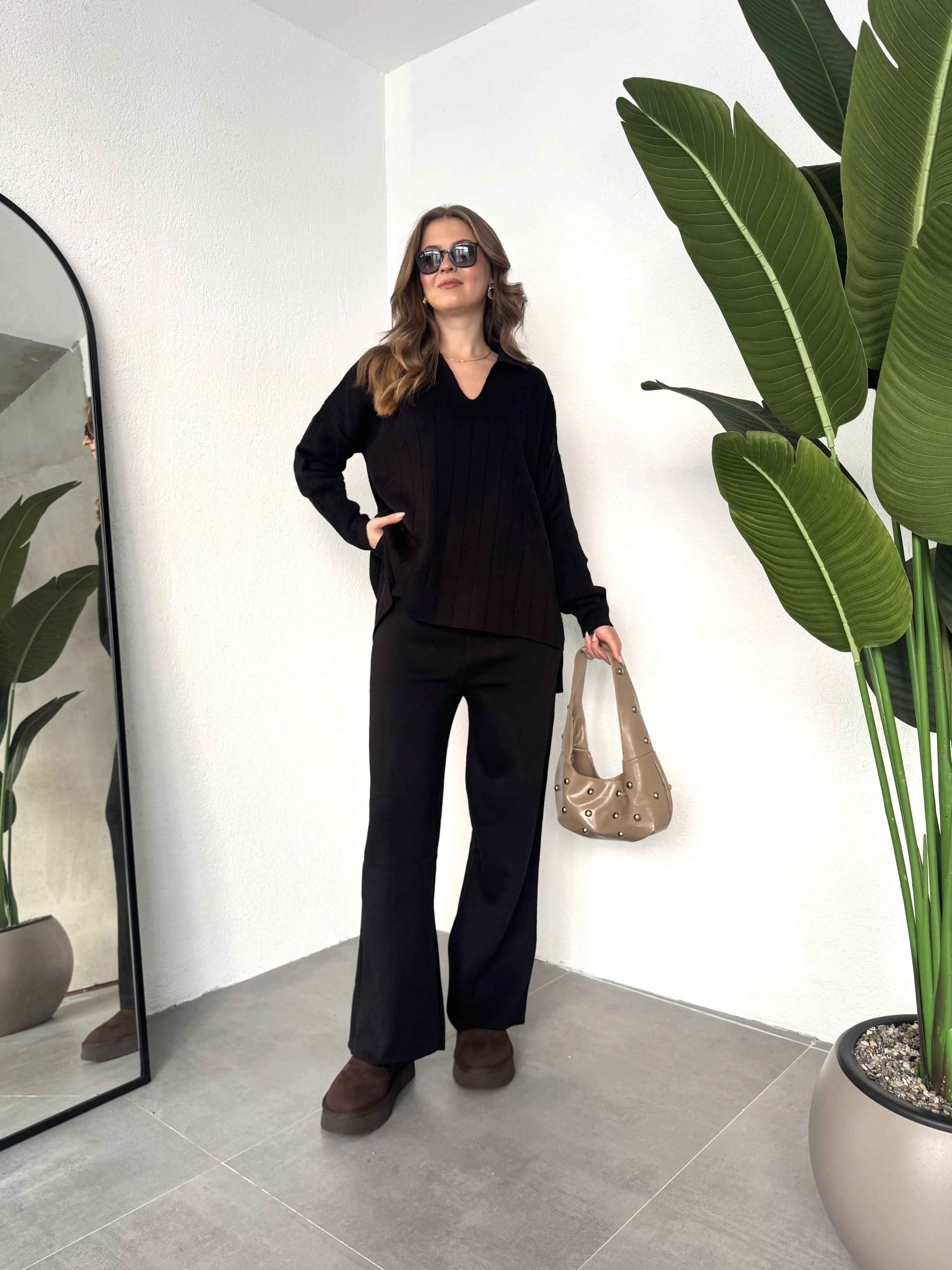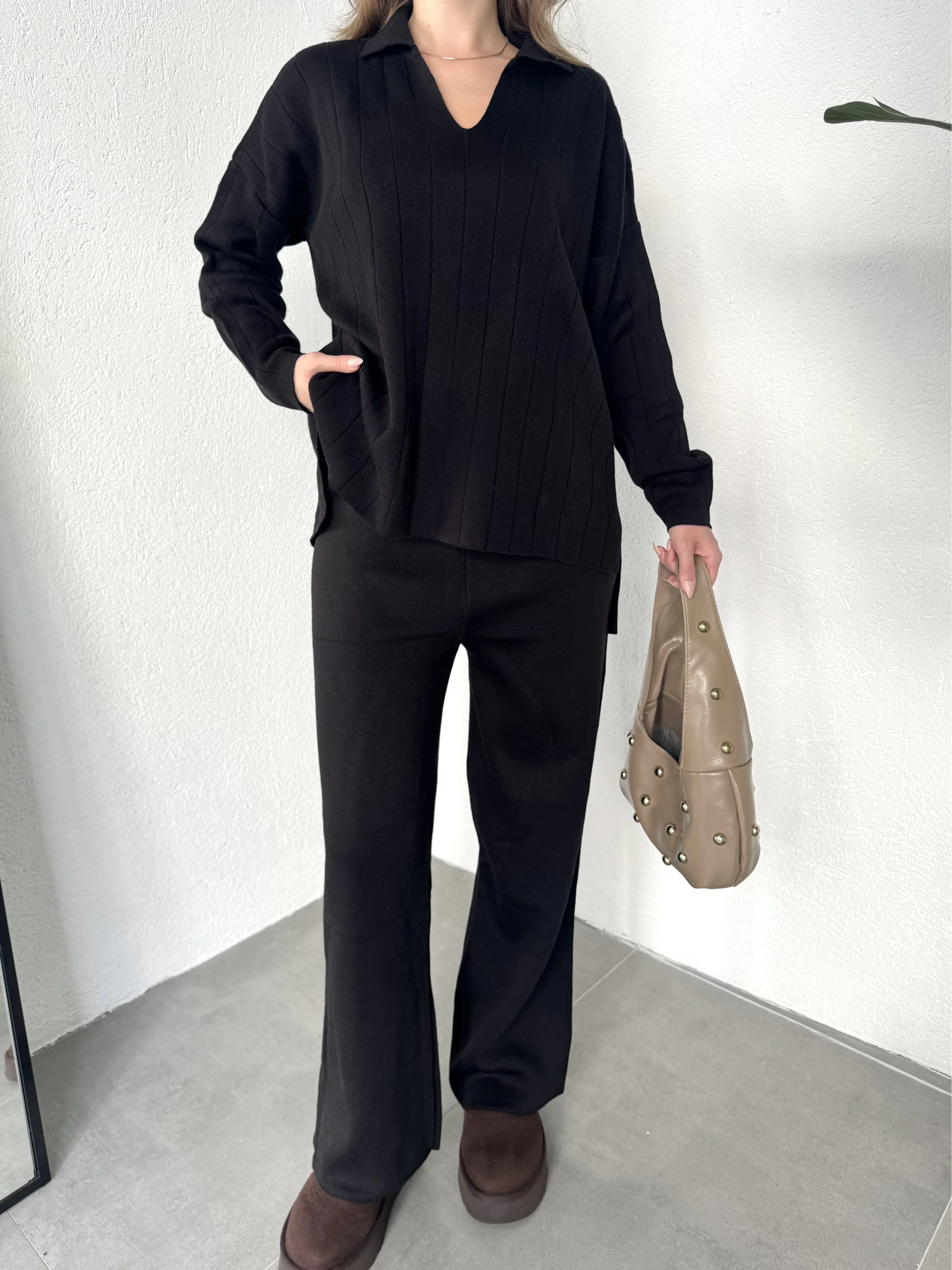 Siyah Polo Yakalı Kazak İspanyol Paça Triko Pantolon İkili Takım