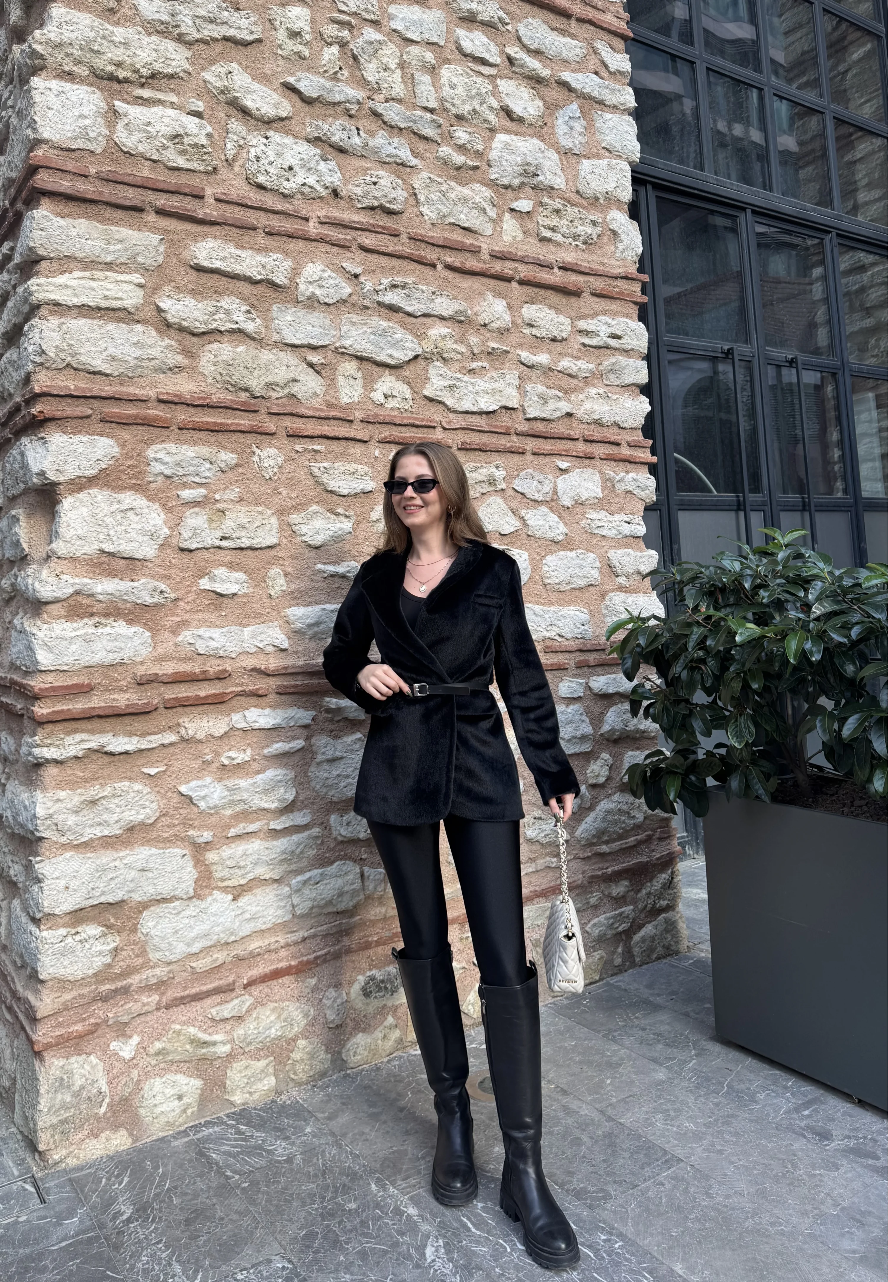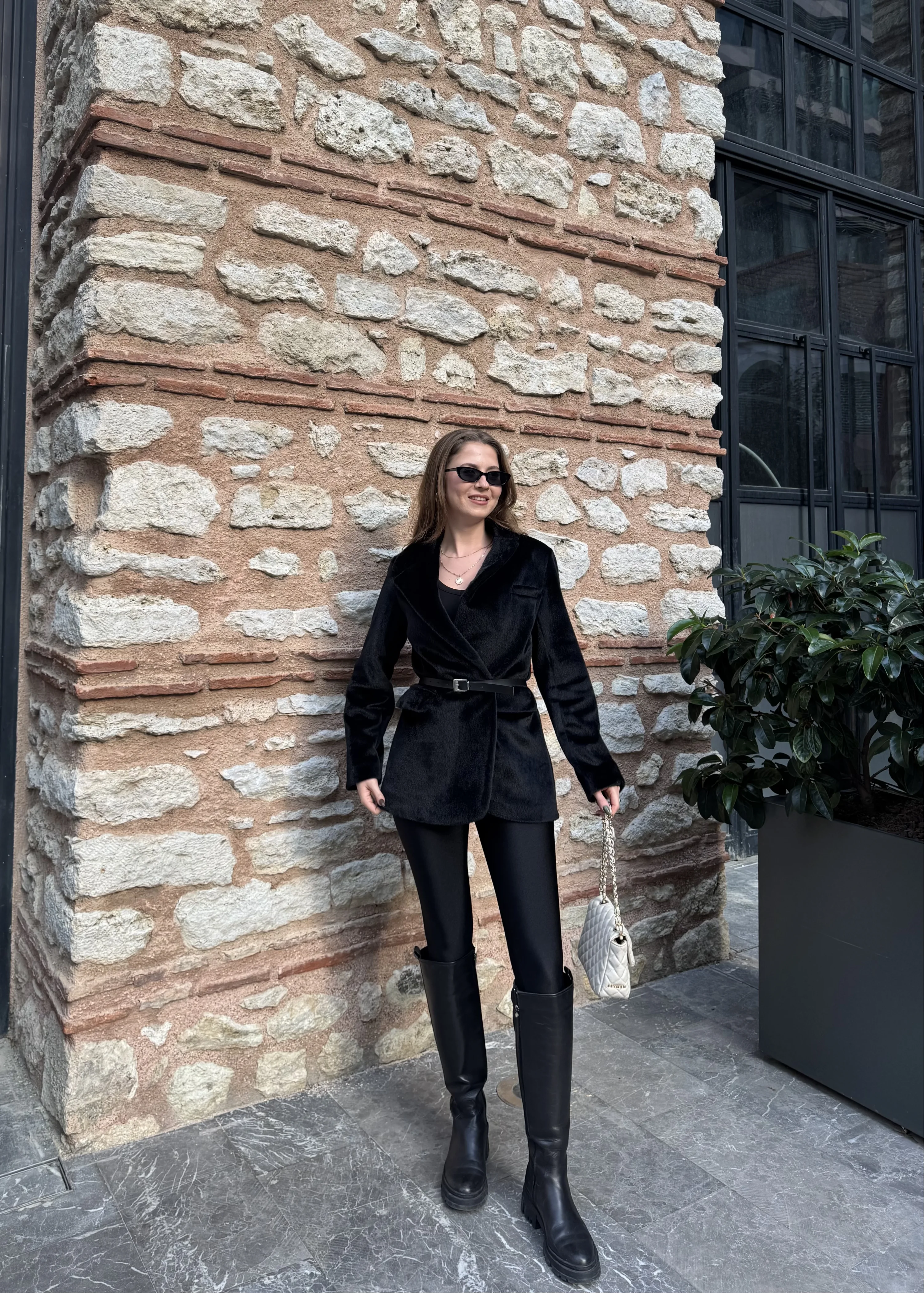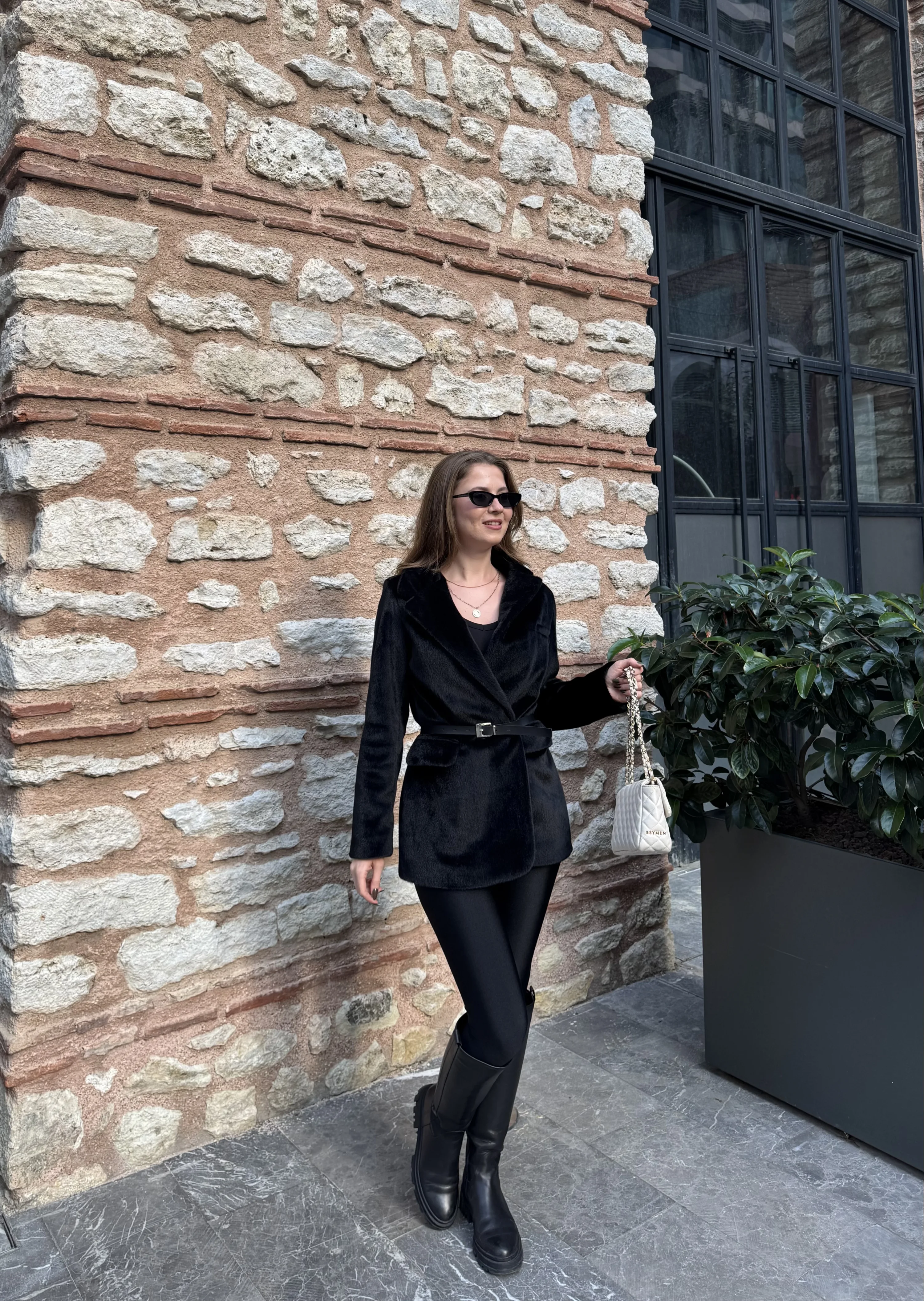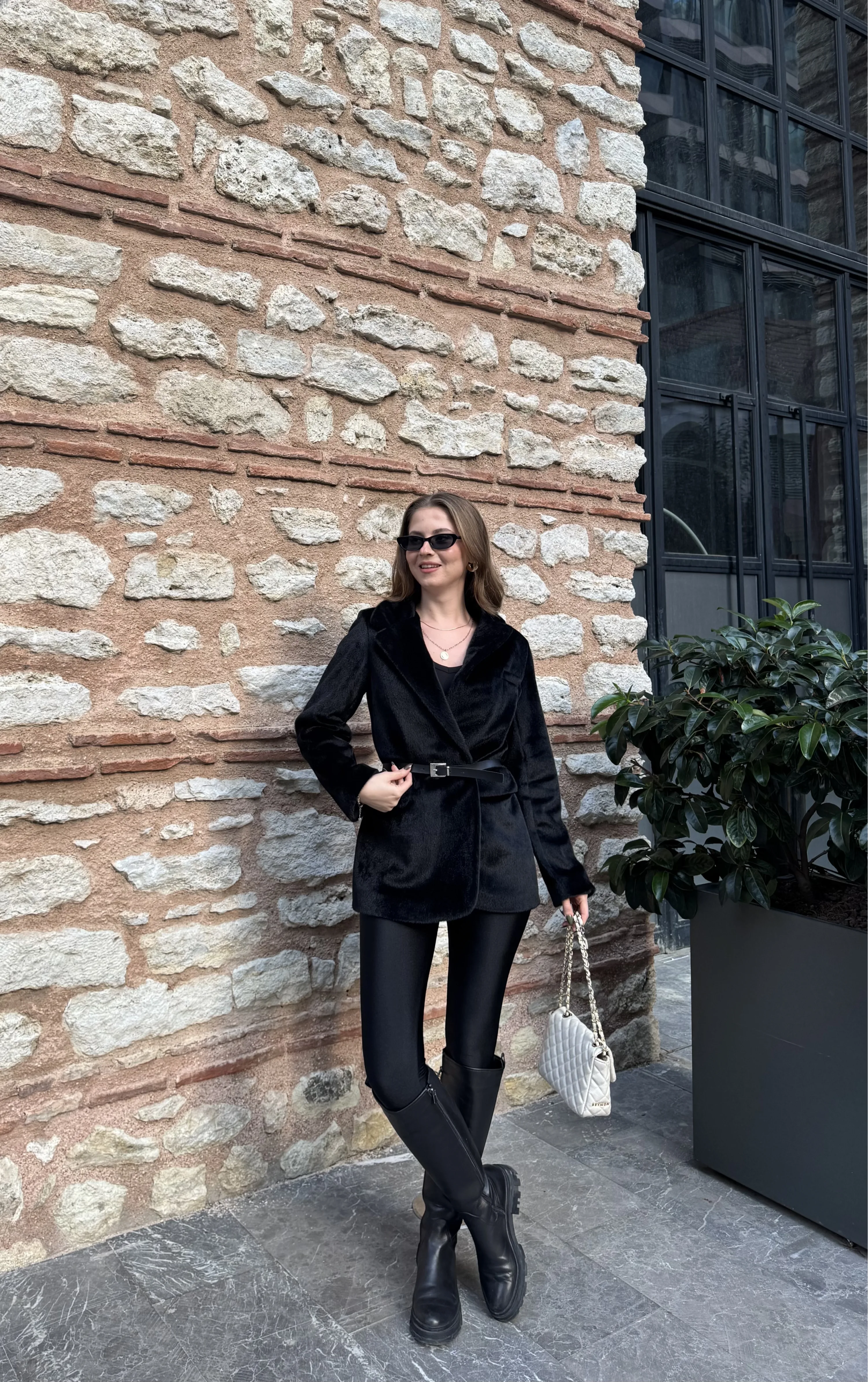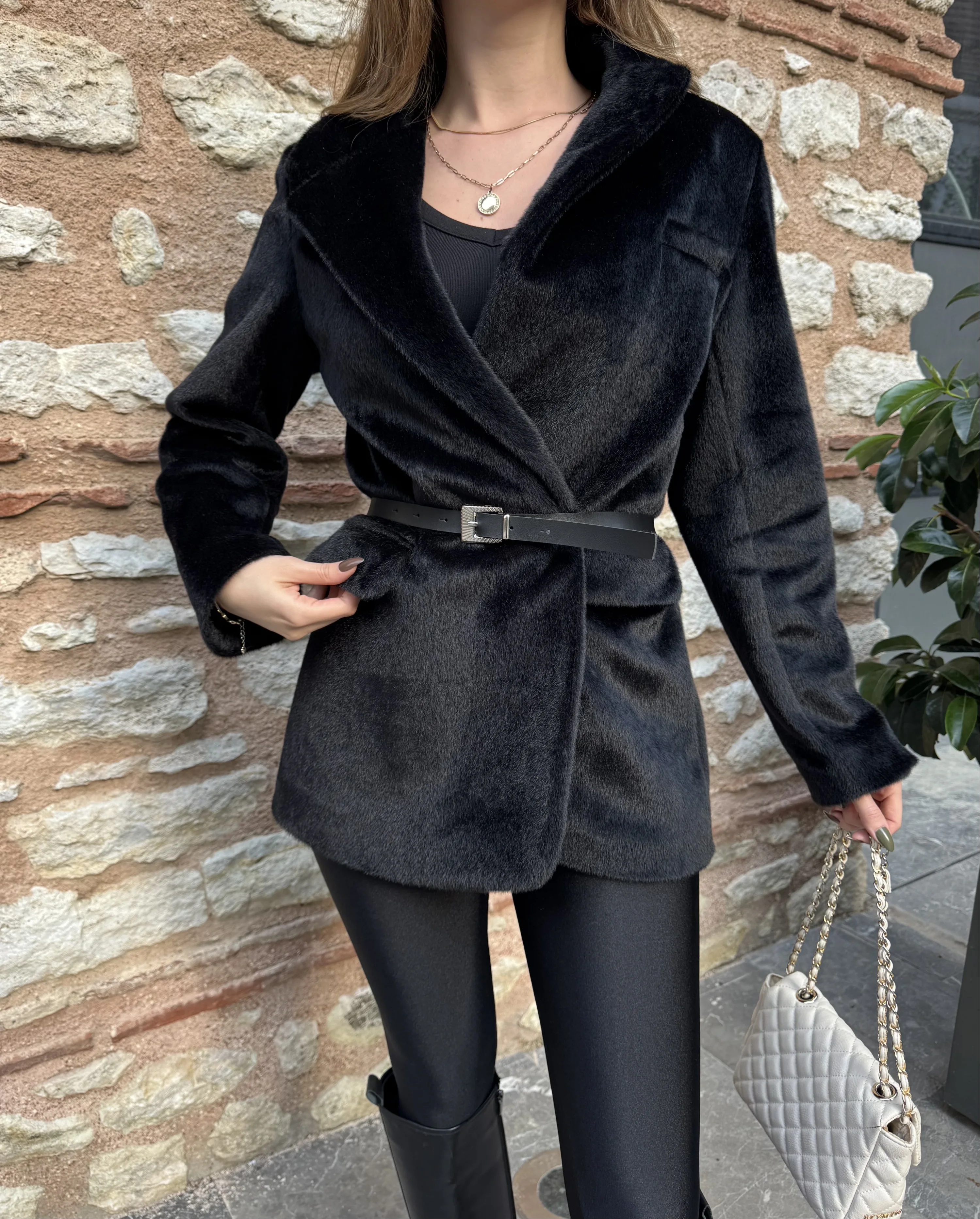 Siyah Tay Tüylü Kemerli Kürk Fox Ceket