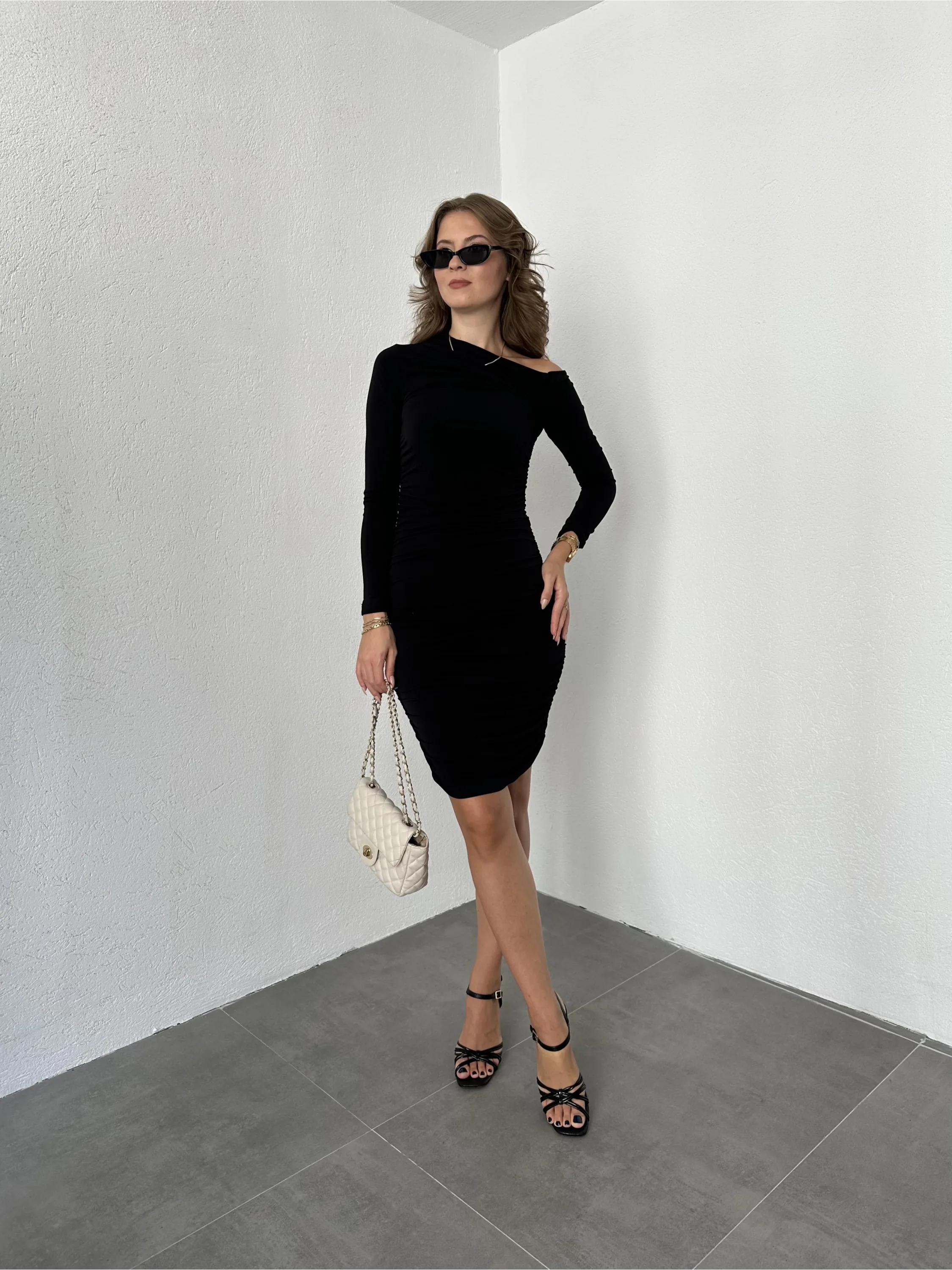 Siyah Tek Omuz Kayık Yaka Büzgülü Parmak Geçirmeli Mini Boy Candy Elbise