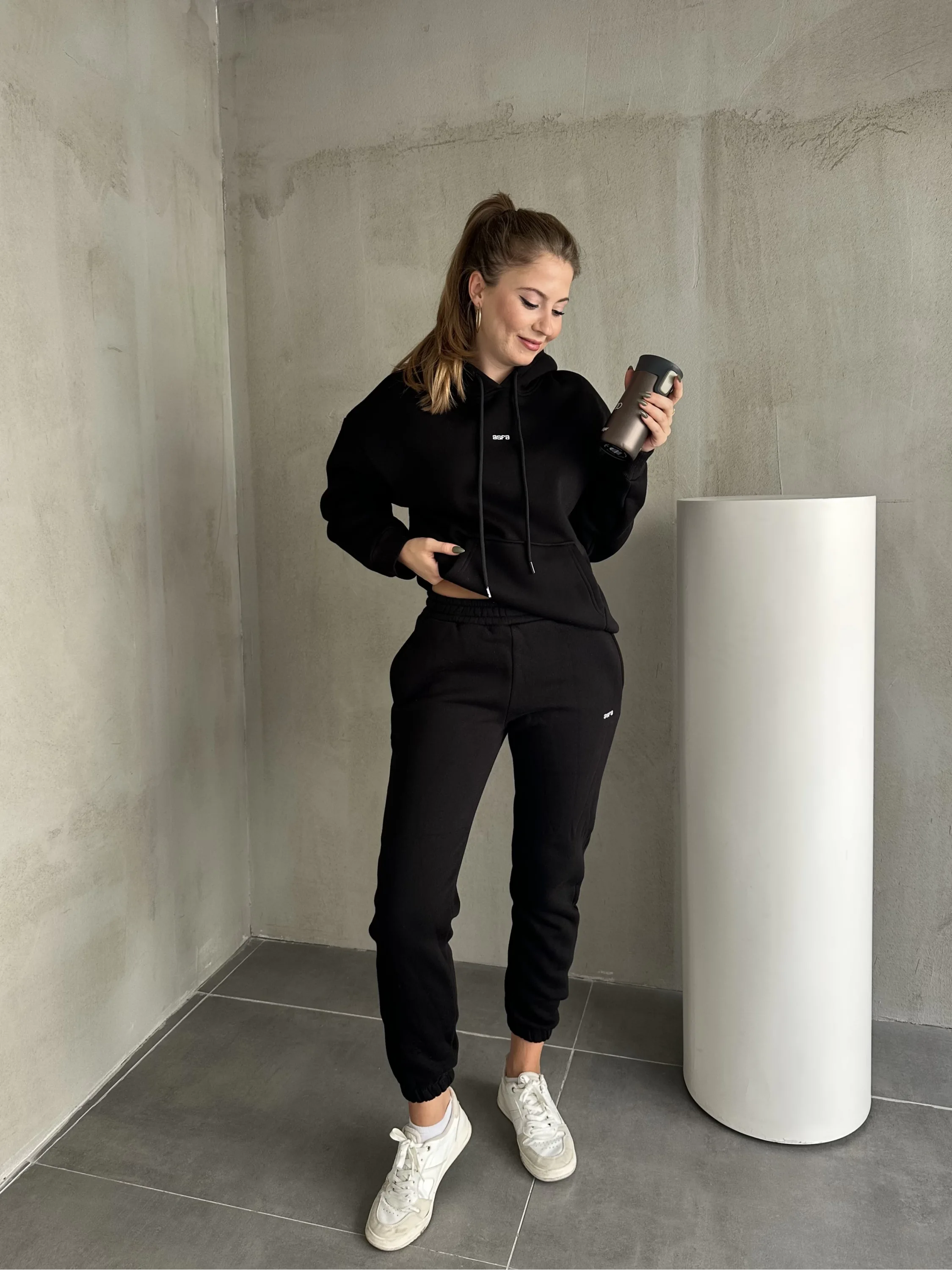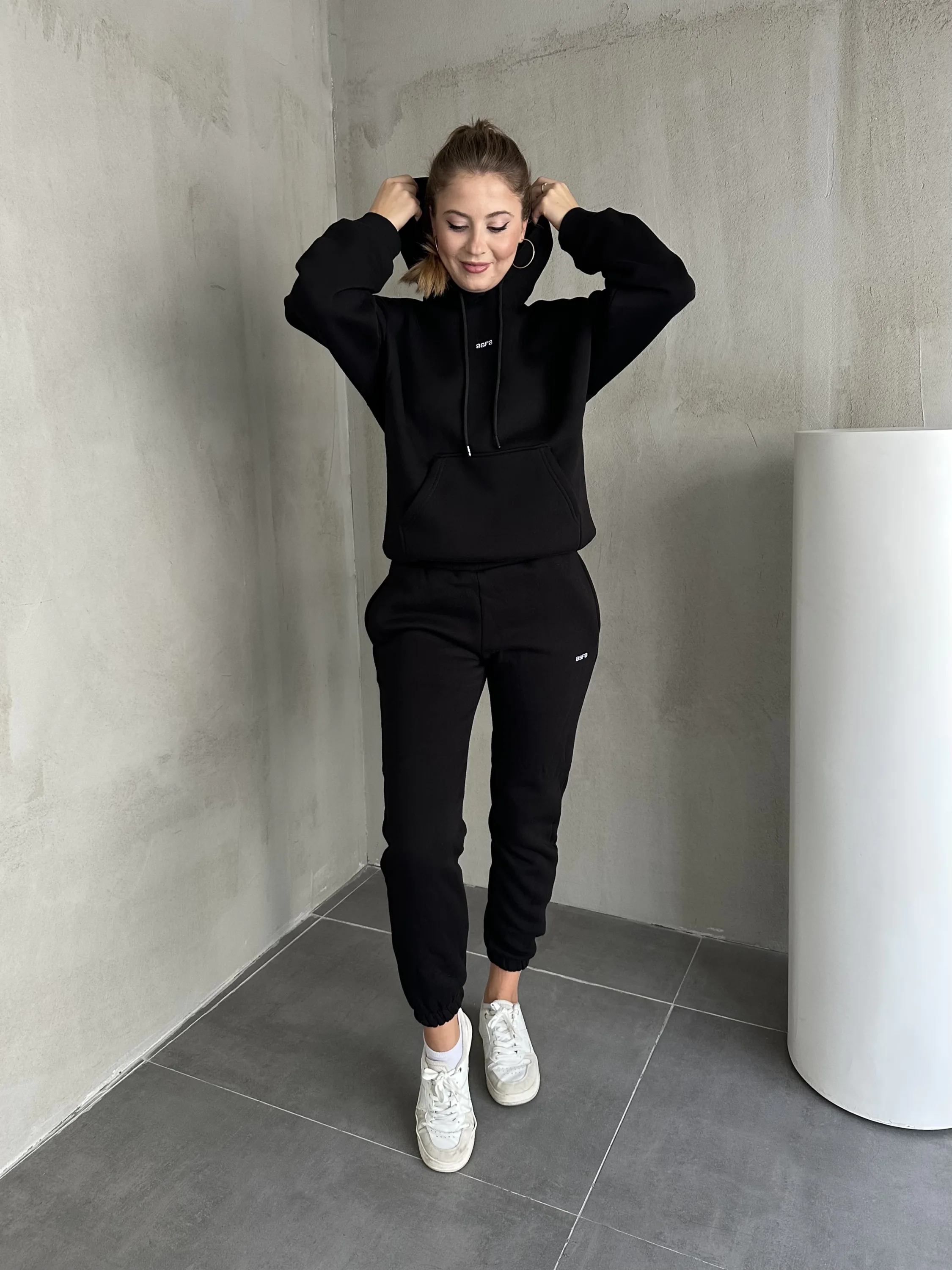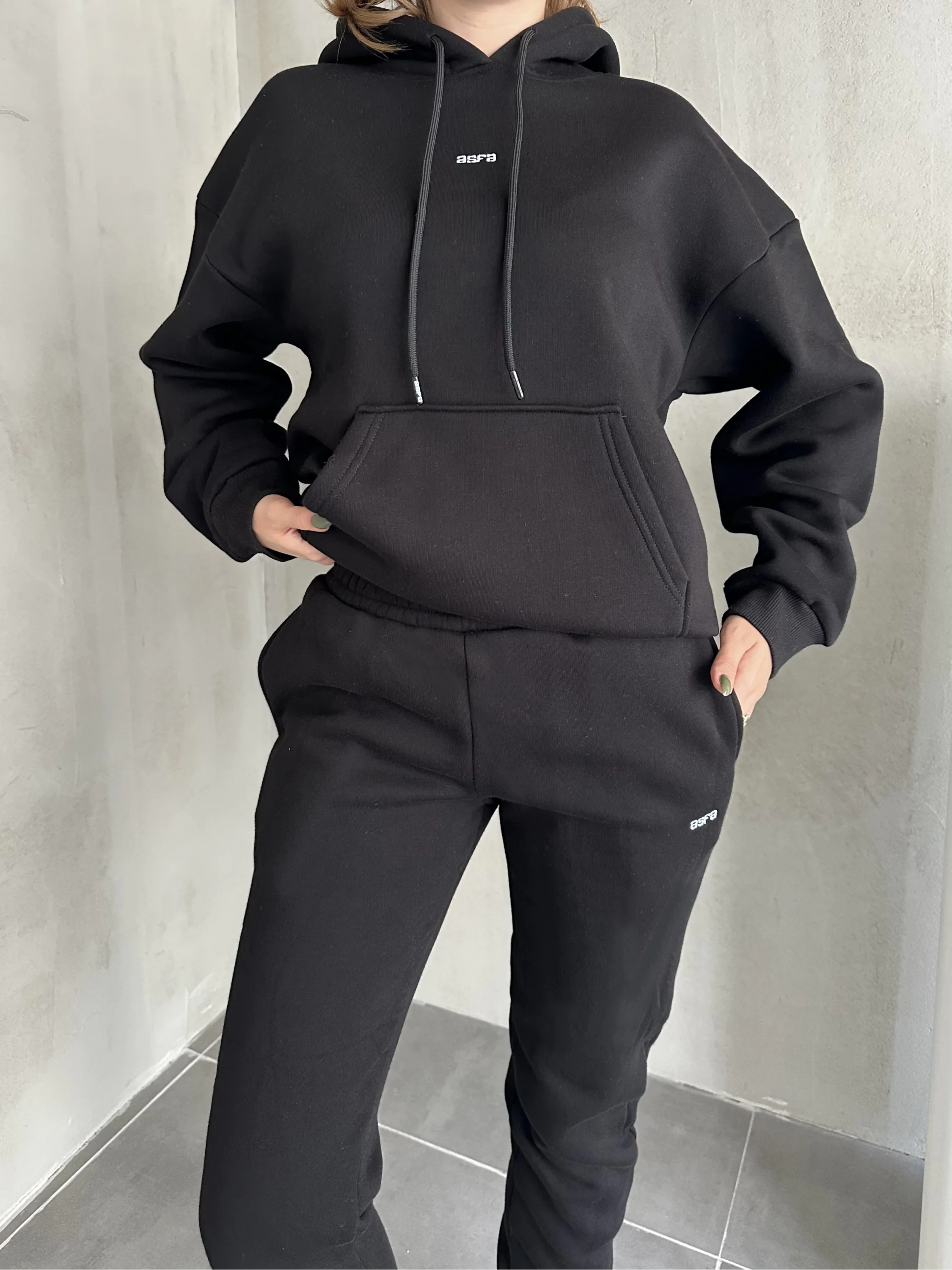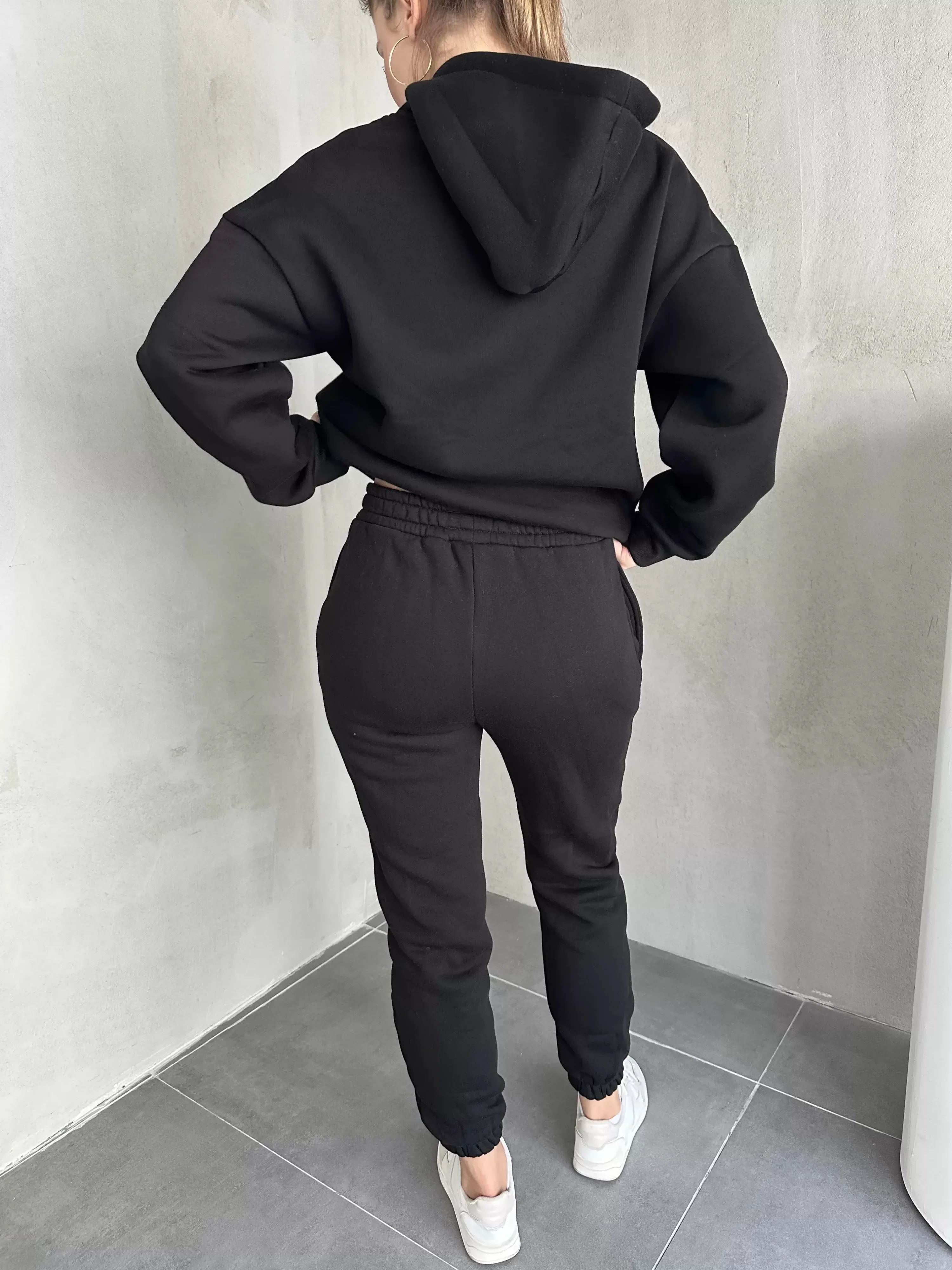 Siyah Üç İplik Şardonlu Kapşonlu Sweat Eşofman Takımı