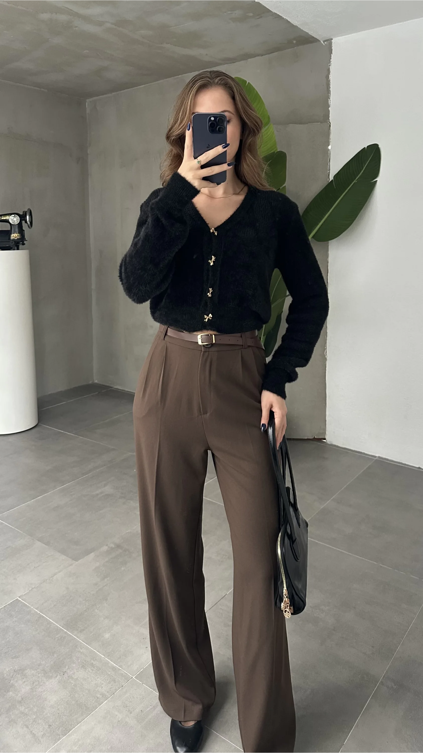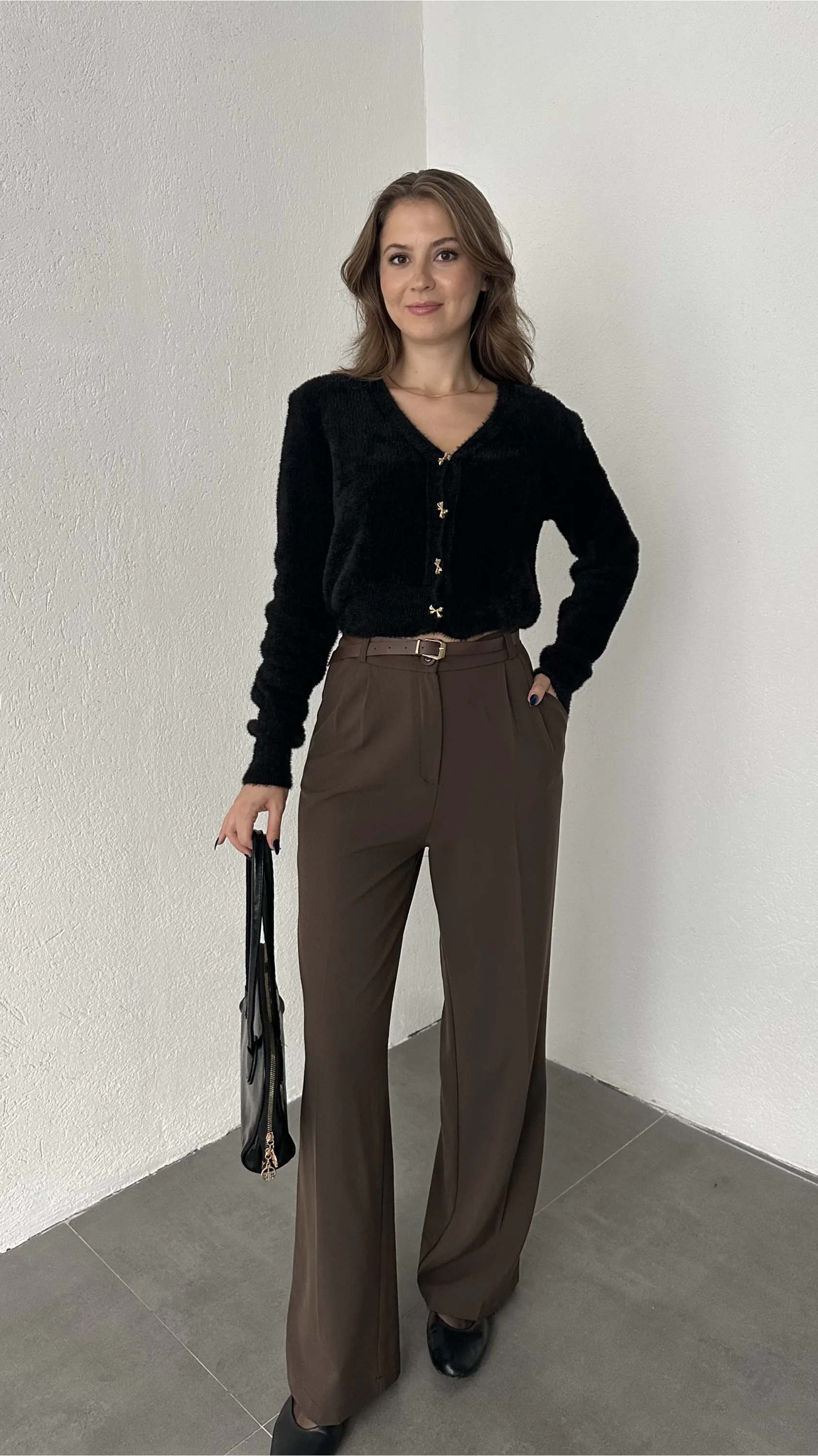 Kahverengi V Yaka Fiyonk Gold Düğme Detaylı Yumoş Triko Hırka