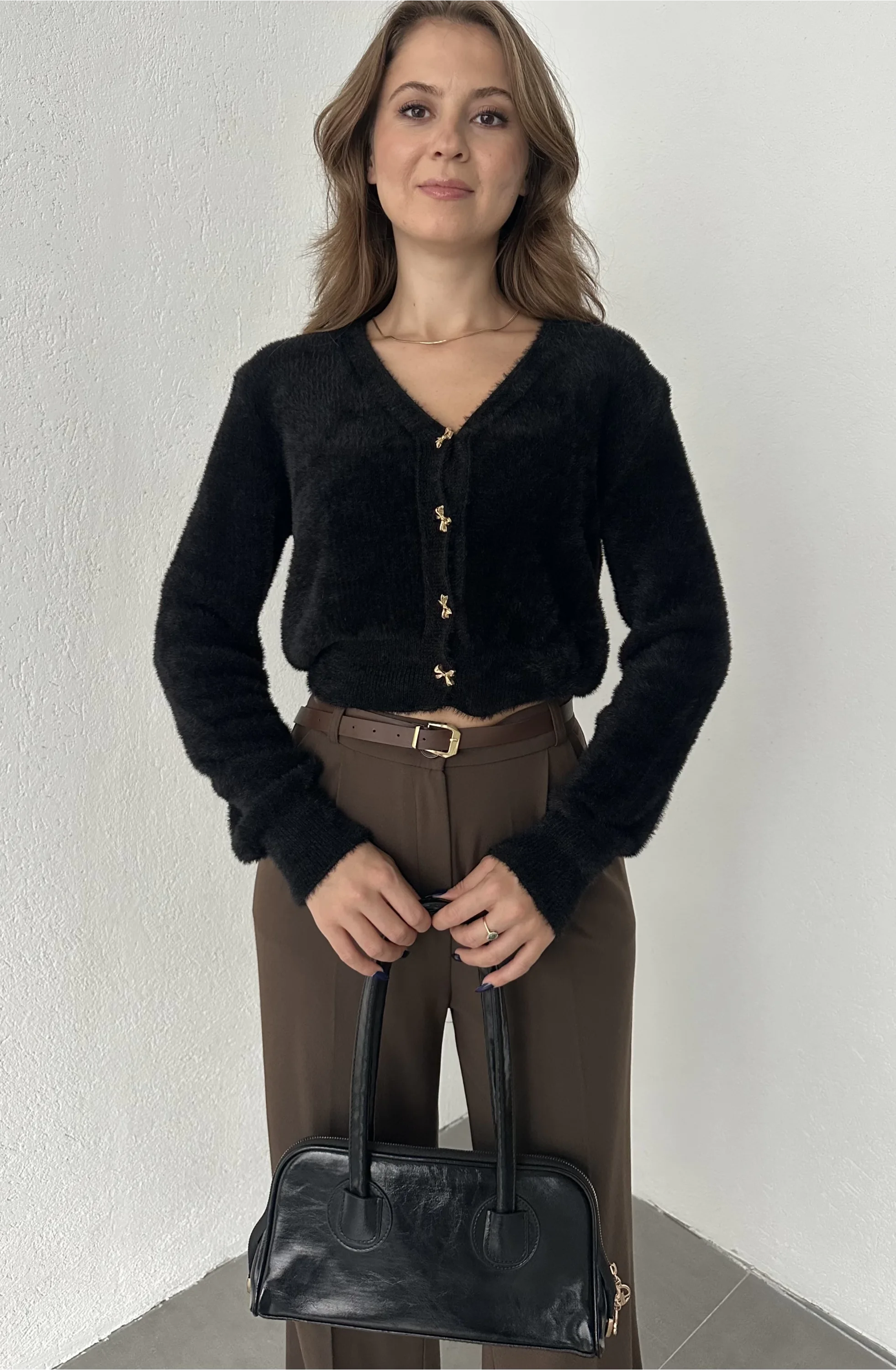 Siyah V Yaka Fiyonk Gold Düğme Detaylı Yumoş Triko Hırka