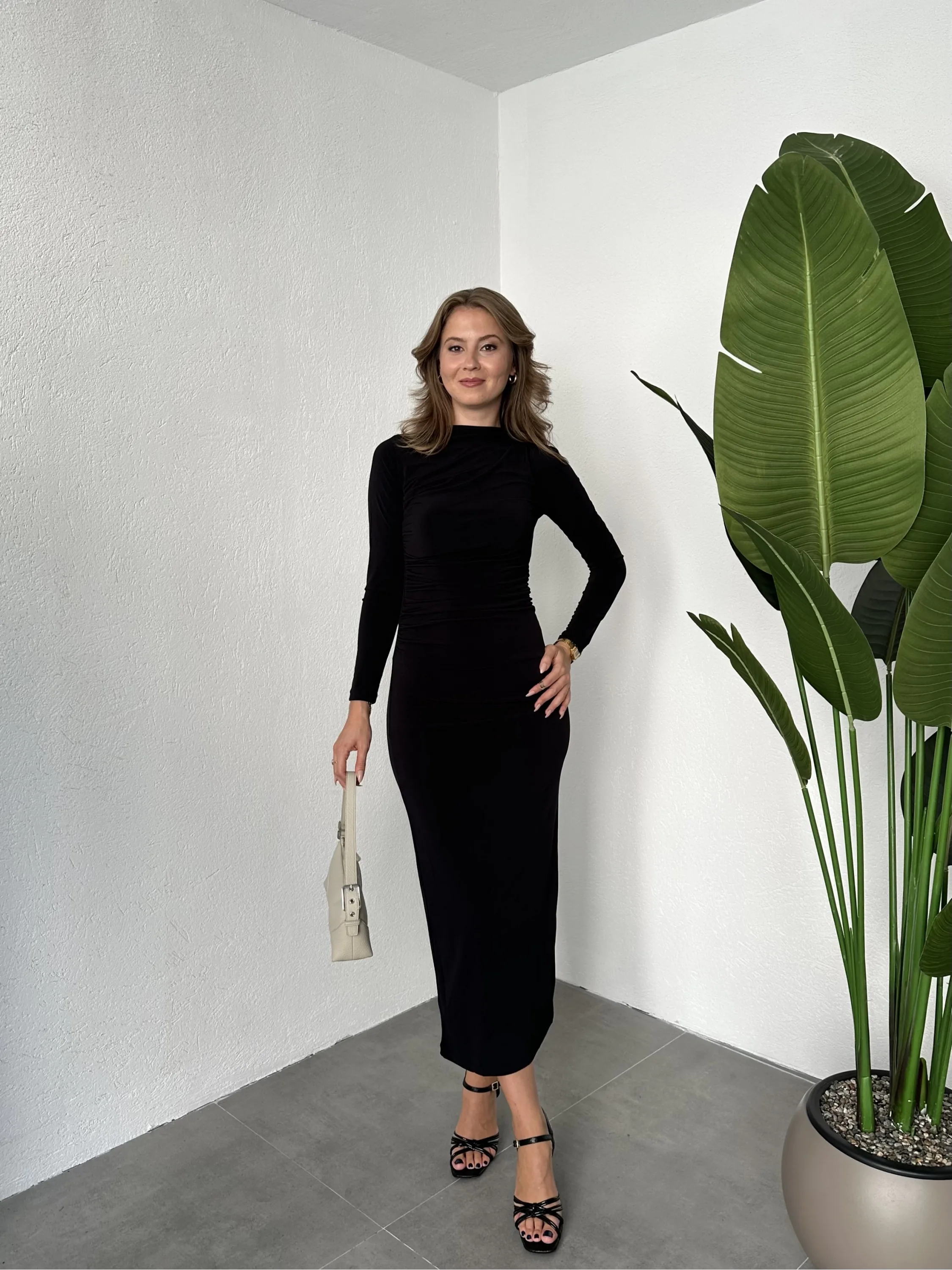 Siyah Vucudu Saran Büzgülü Drapeli Tam Boy Uzun Kollu Candy Elbise