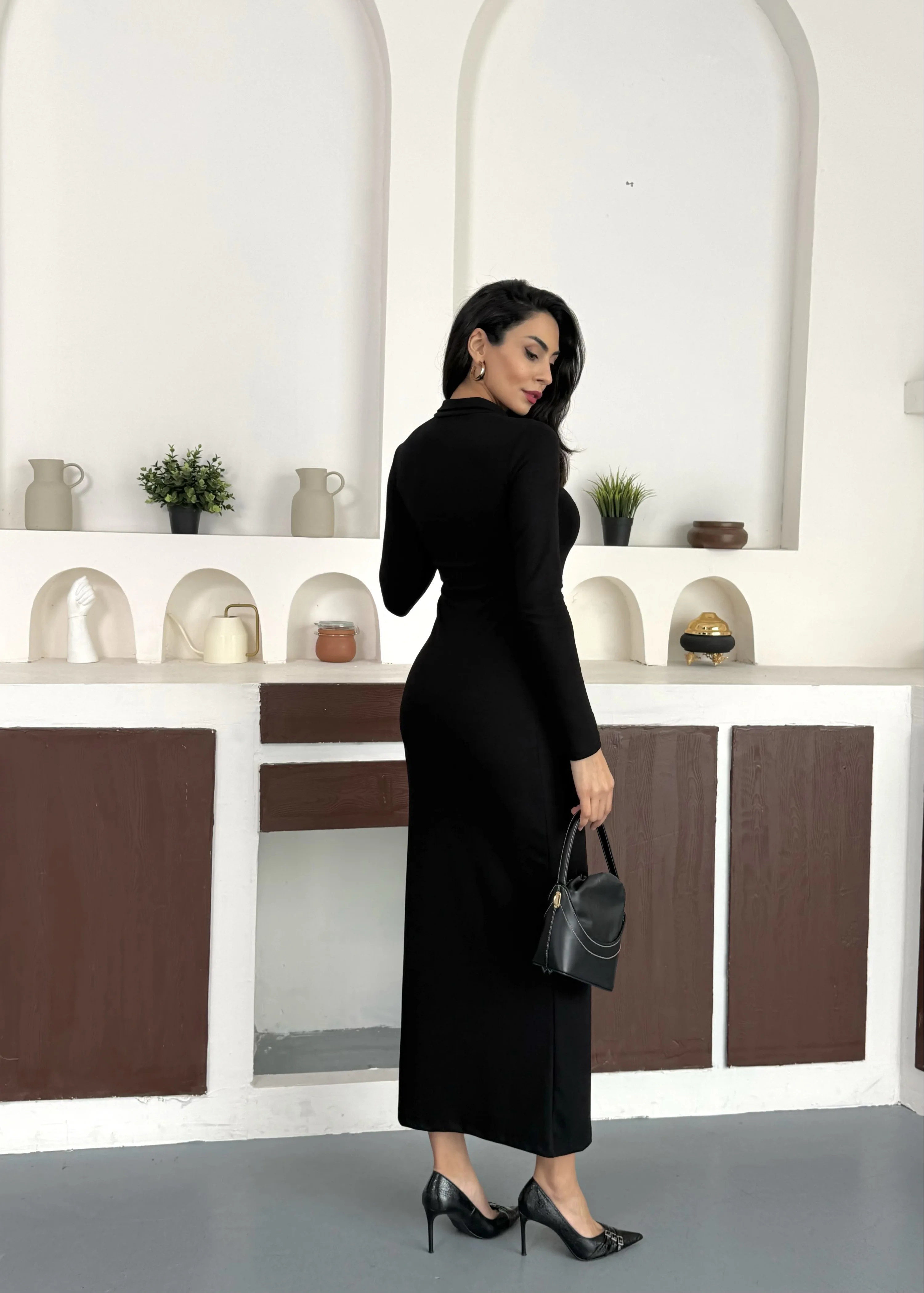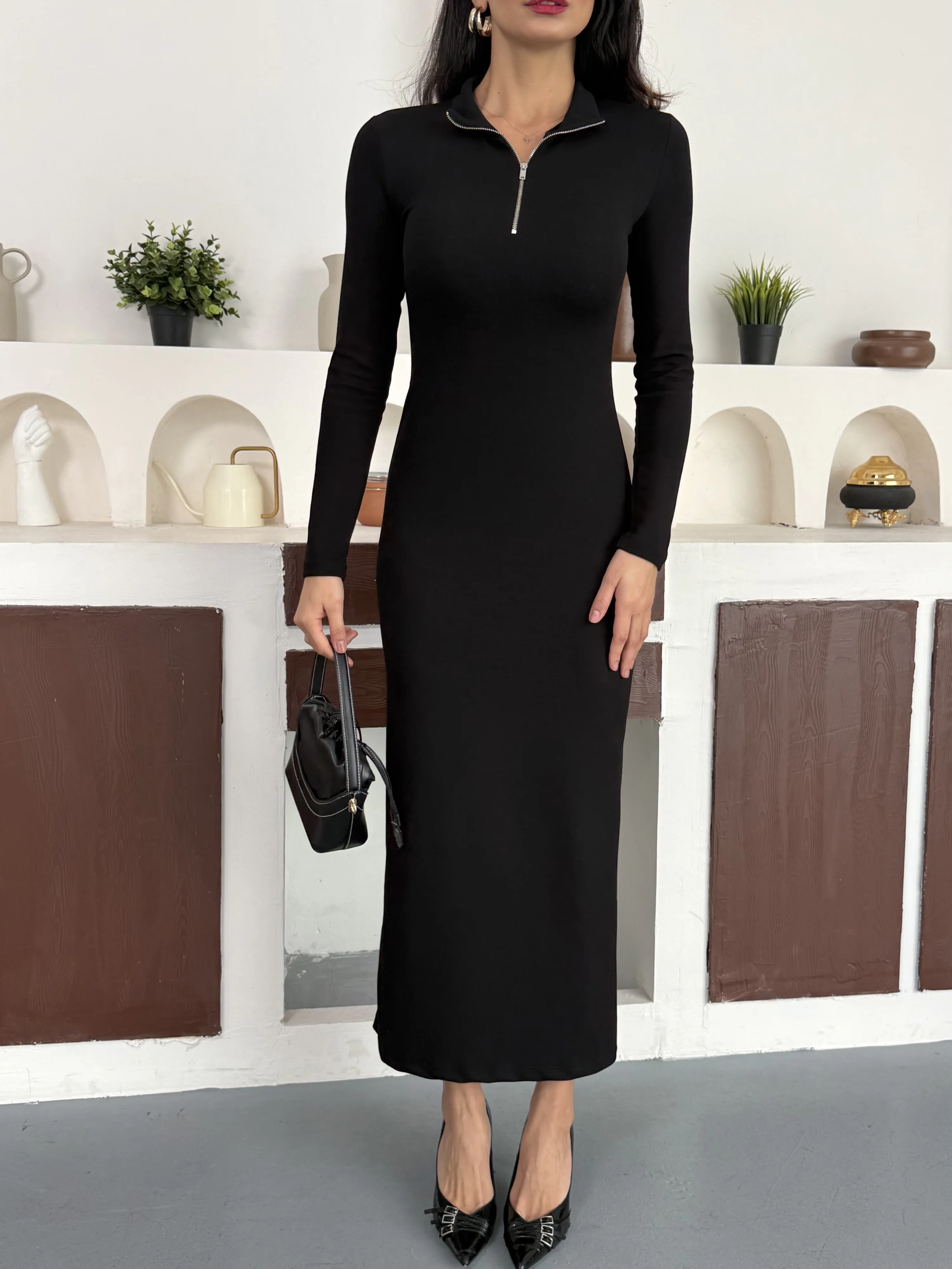 Siyah Yarım Fermuarlı Fitilli Tam Boy Uzun Kollu Midi Elbise