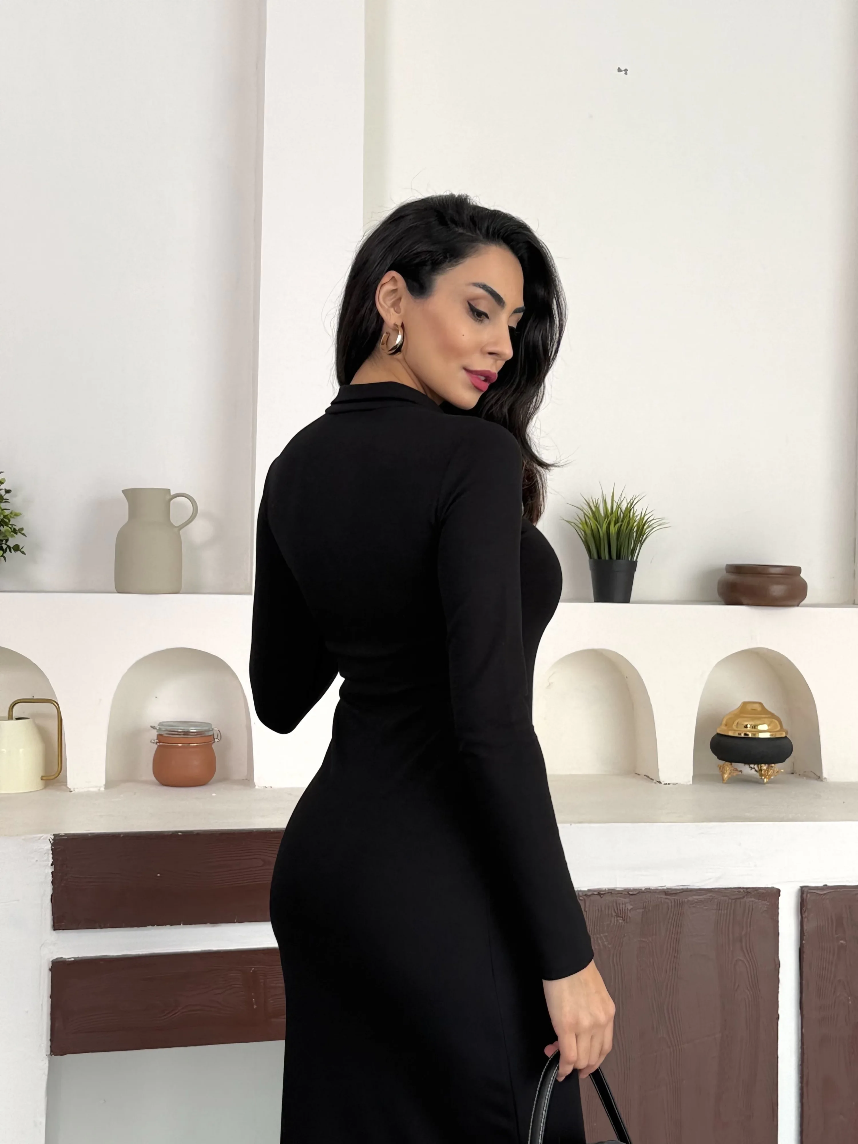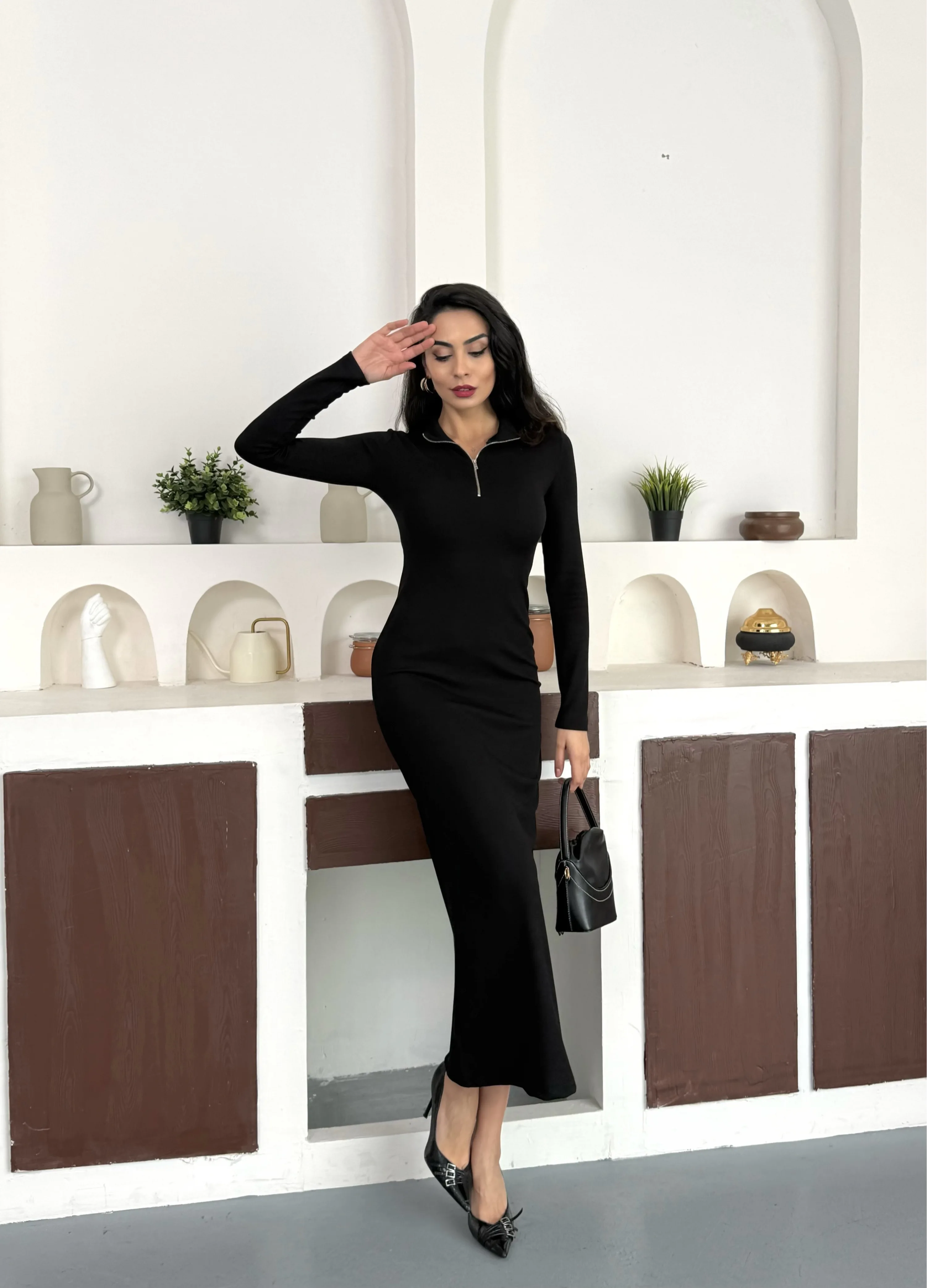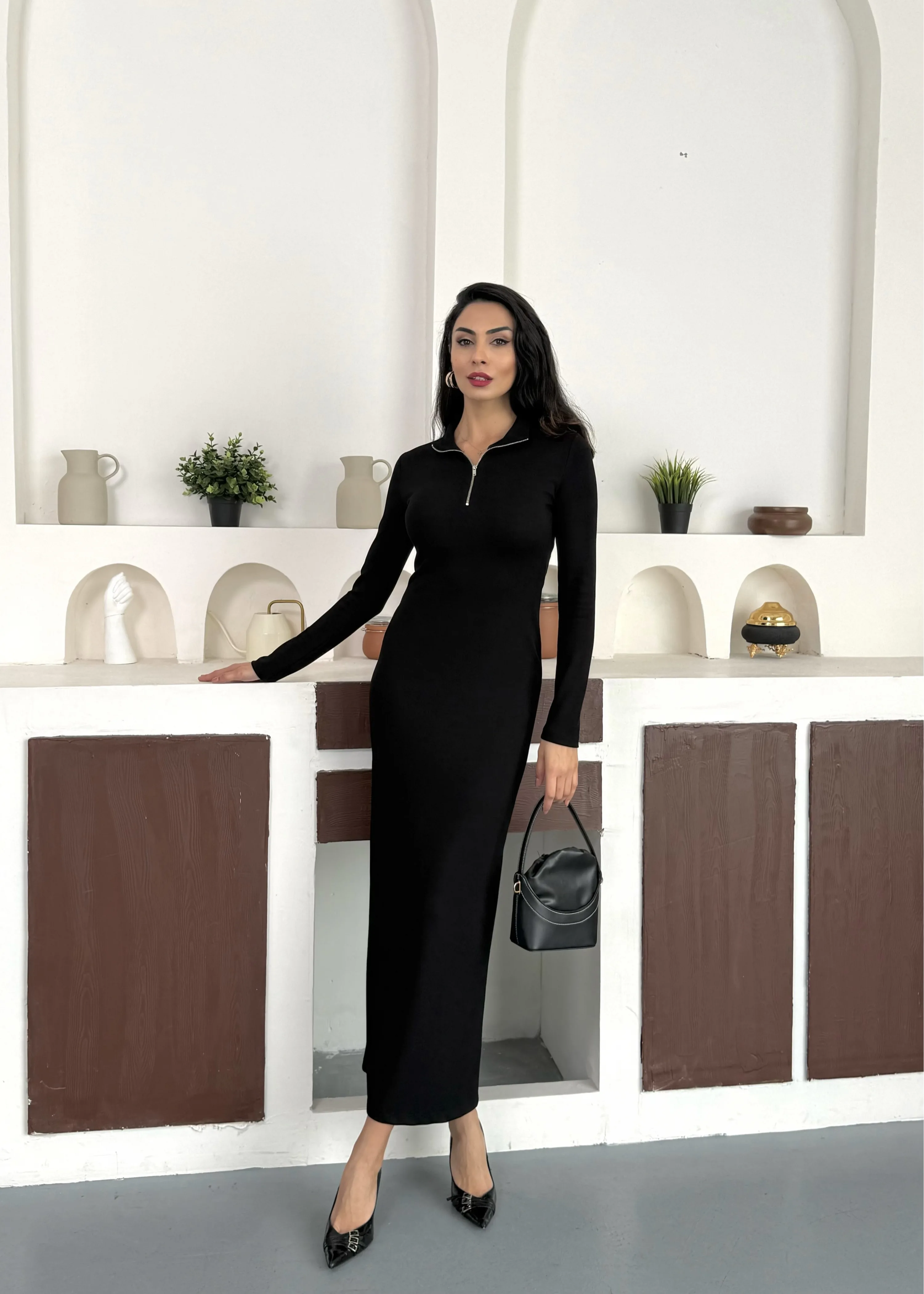 YARIM FERMUARLI FİTİLLİ TAM BOY UZUN KOLLU MİDİ ELBİSE