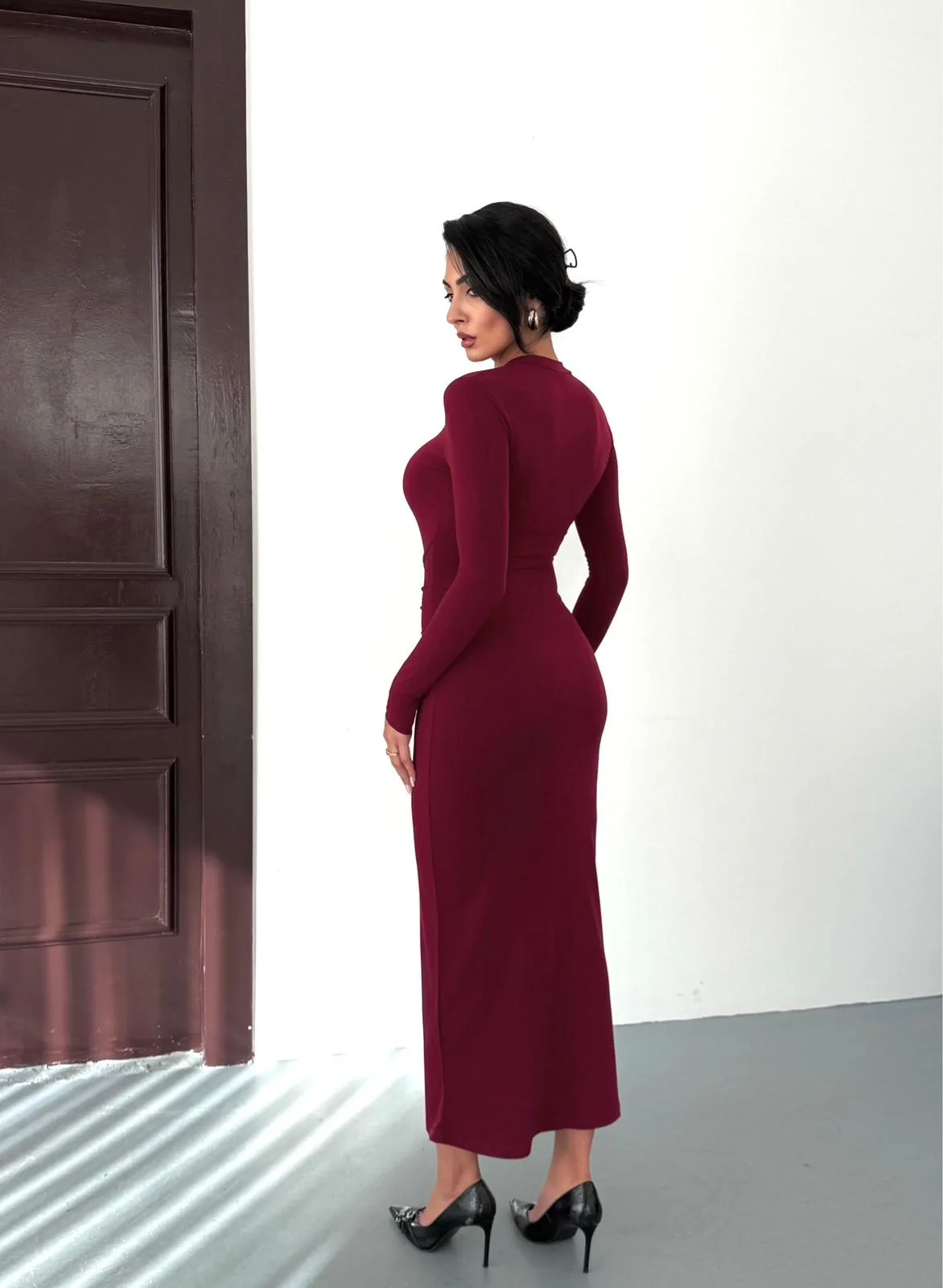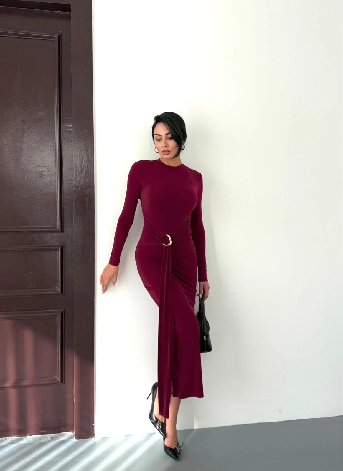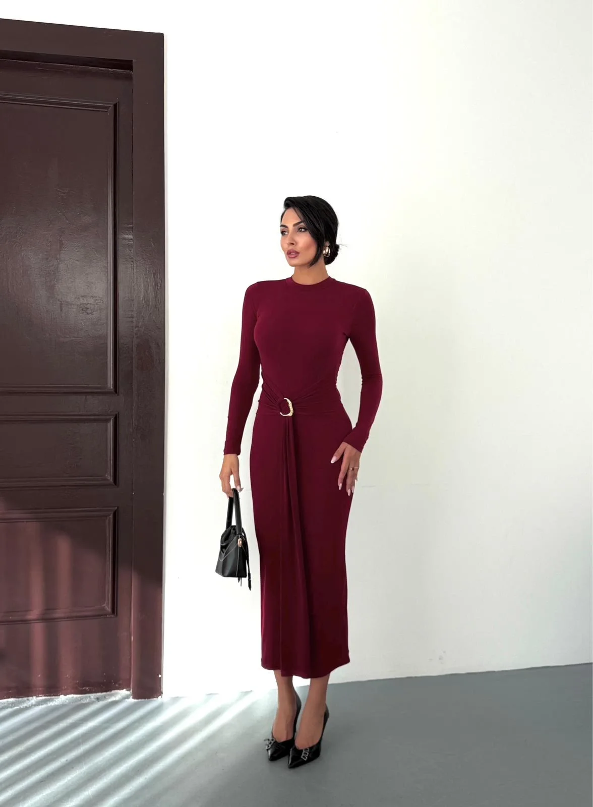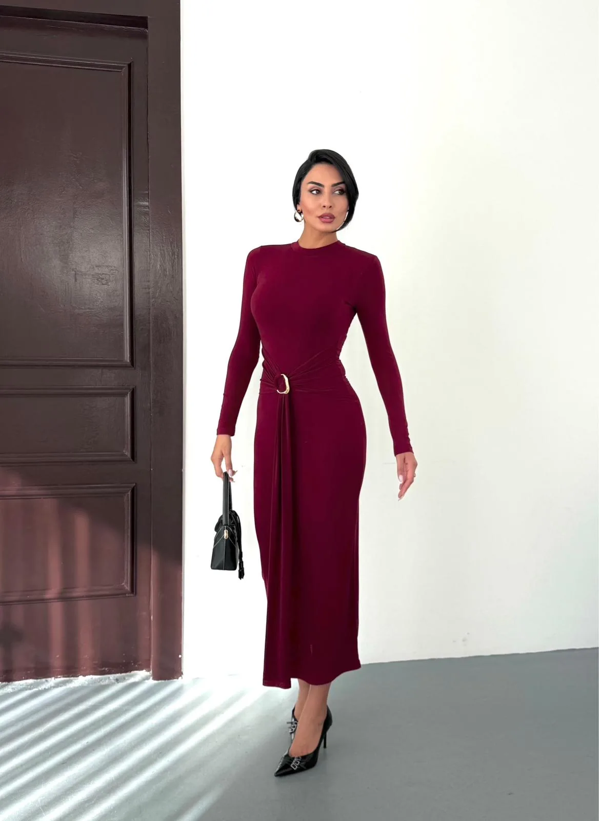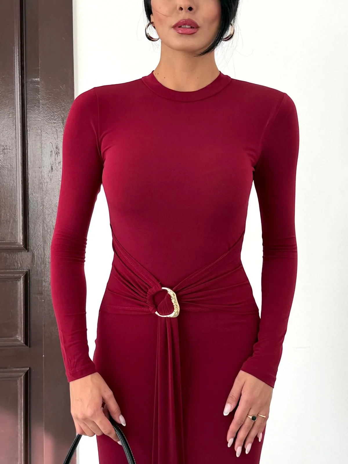 Kadın Bordo Bisiklet Yaka Gold Aksesuarlı Kuşaklı Uzun Boy Vucudu Saran Elbise