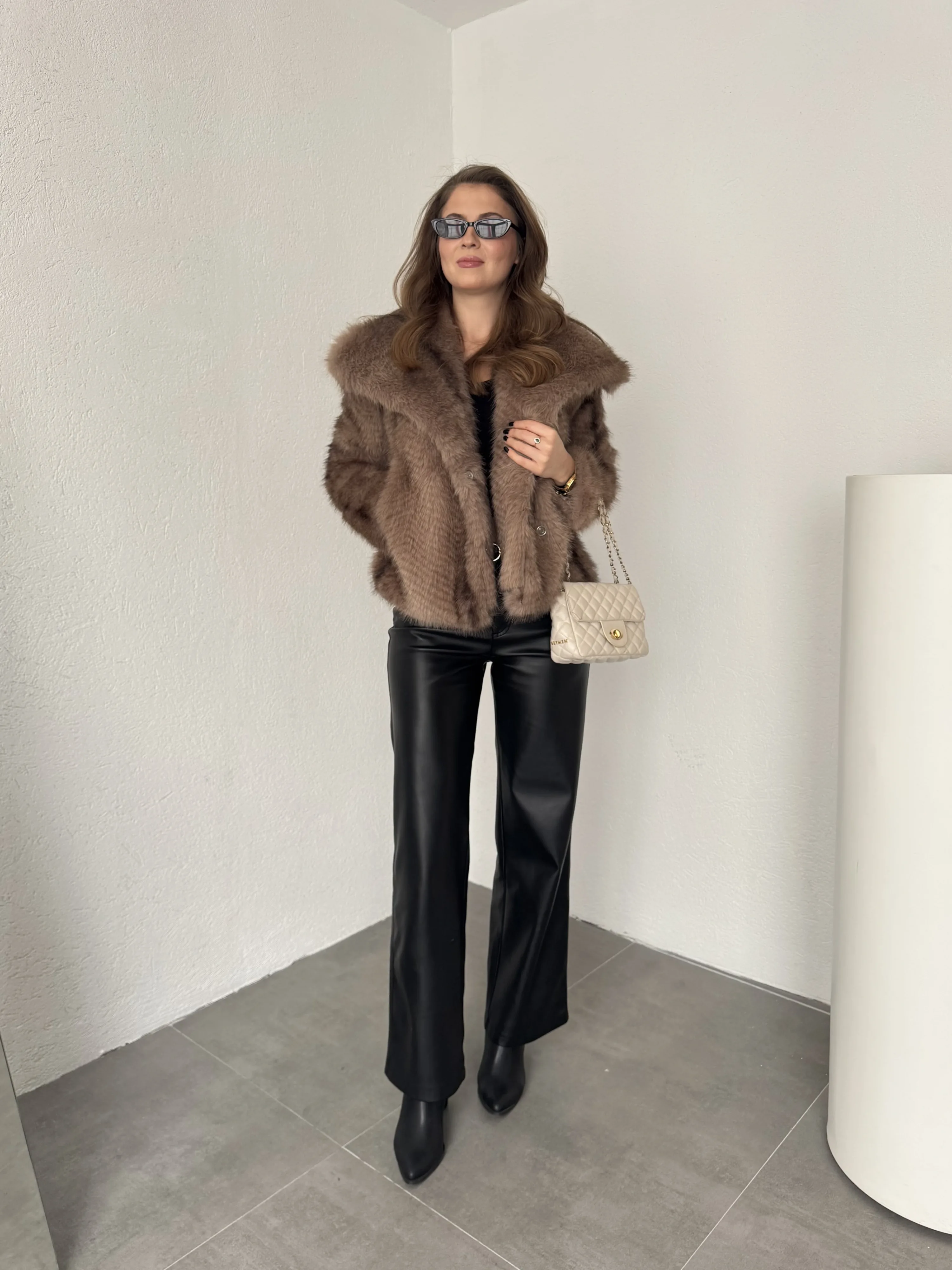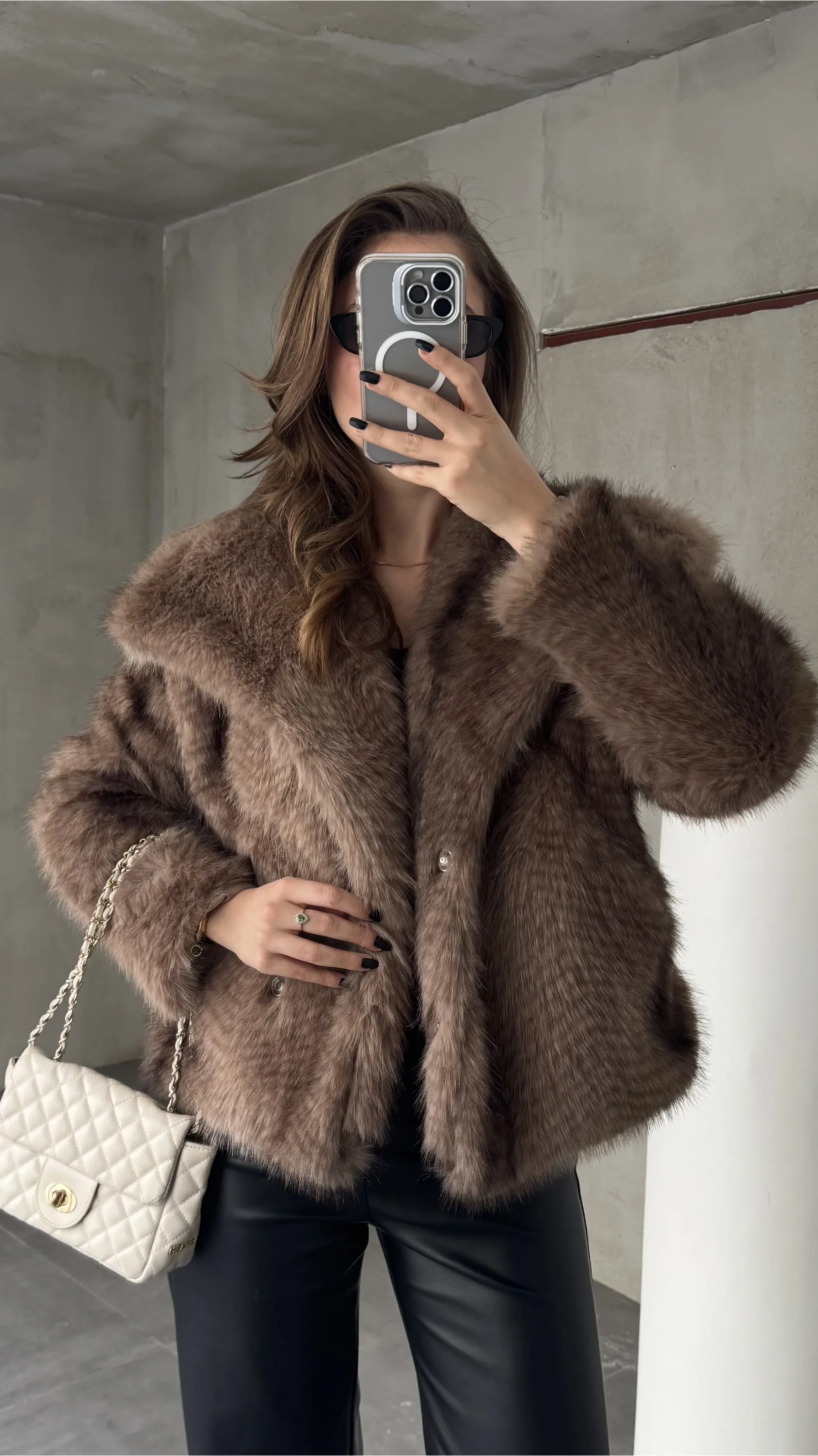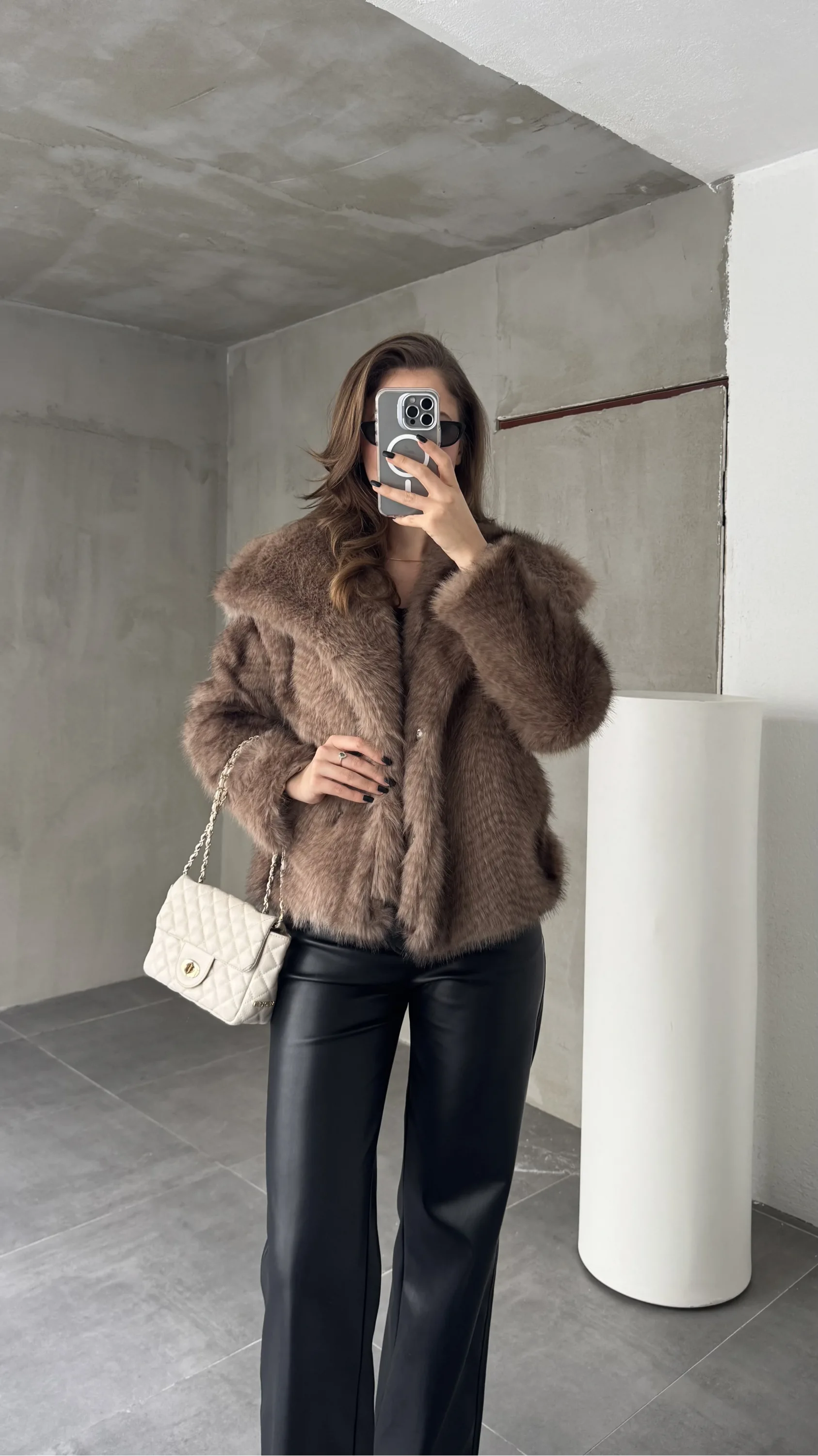 Sütlü Kahve Şal Yaka Jakarlı Çıt Çıtlı Cepli Geniş Kalıp Lolita Kürk