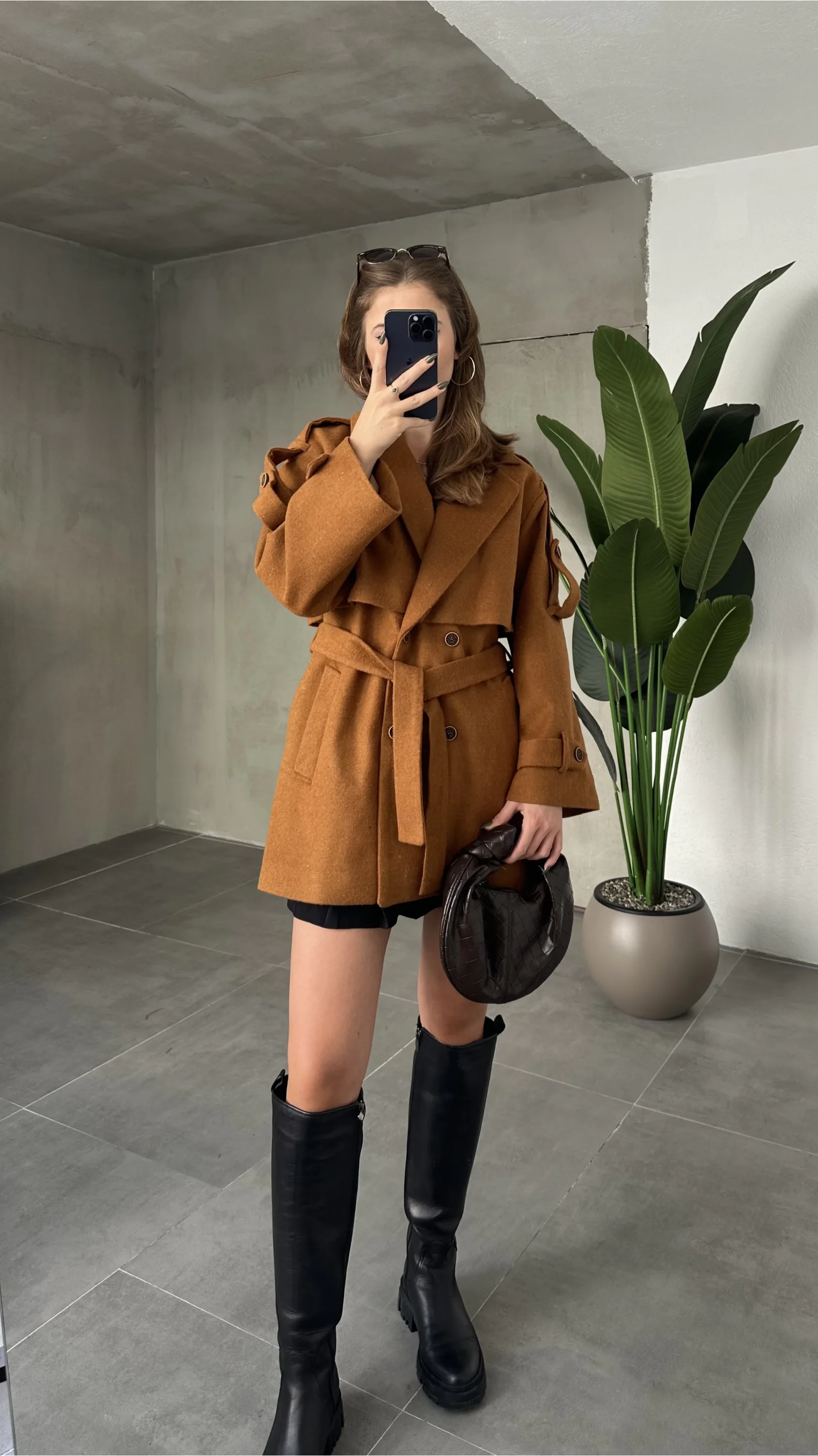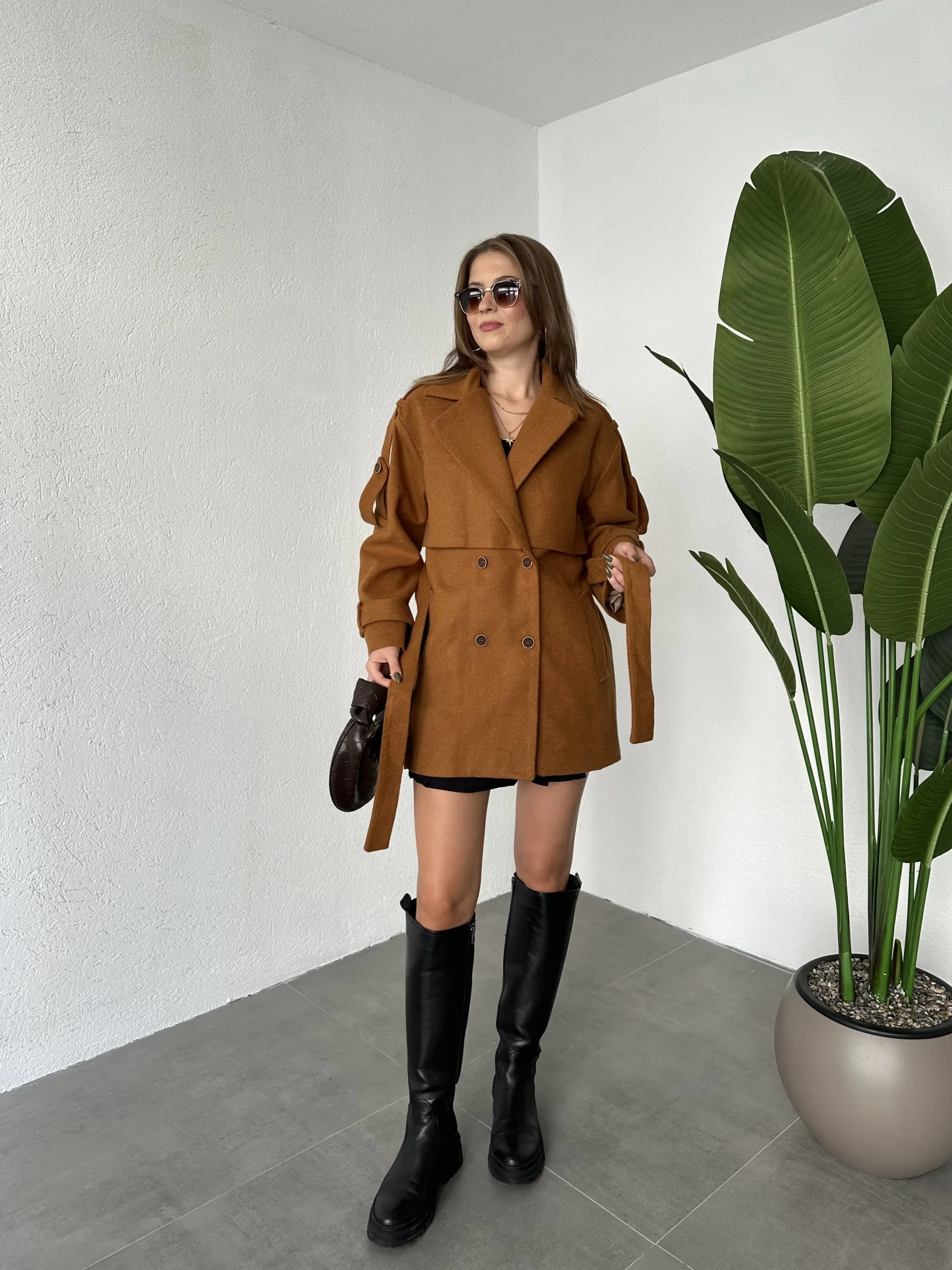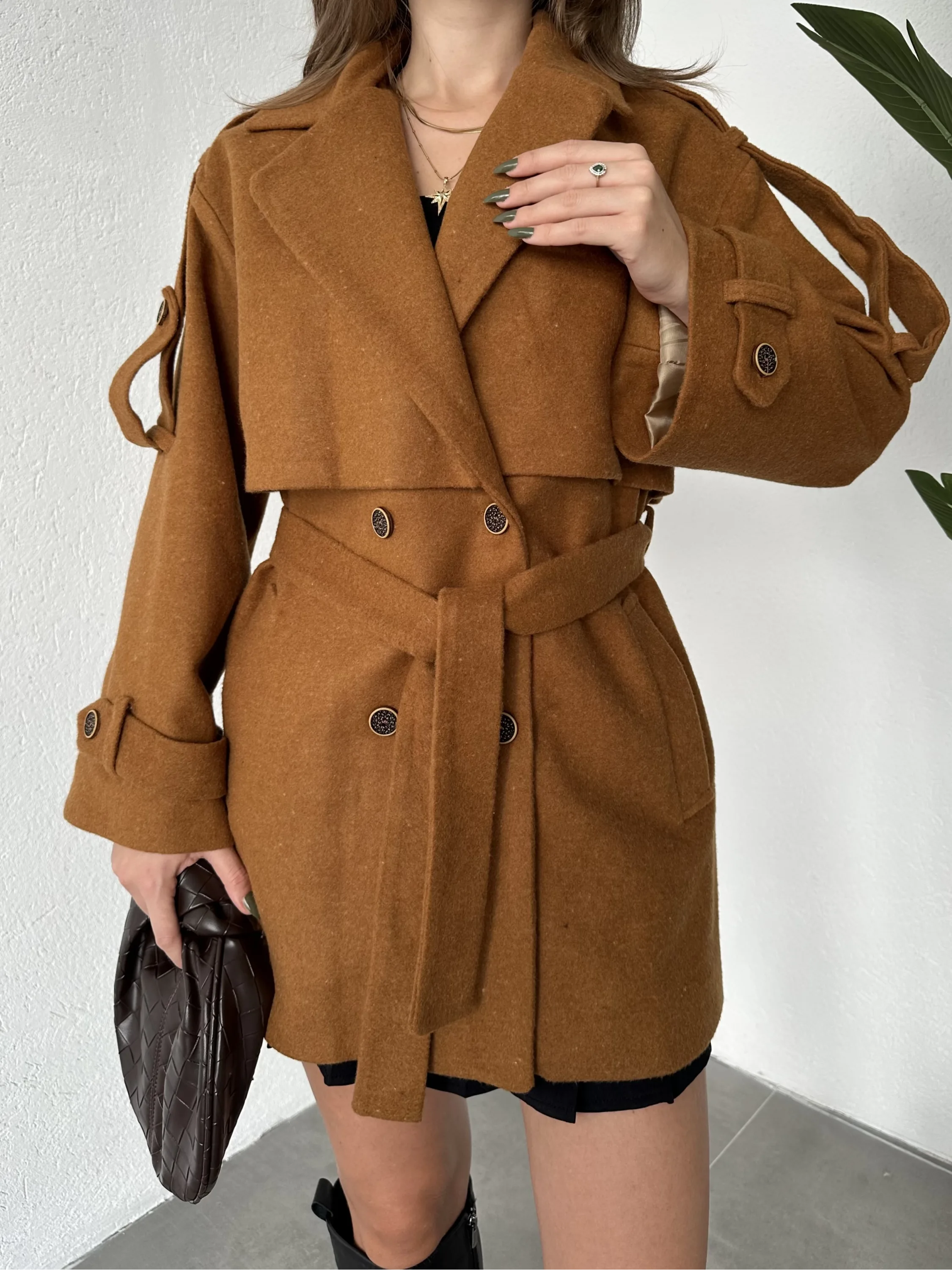 Taba Kruvaze Oversize Astarlı Cepli Kuşaklı Kaşe Mont Kaban