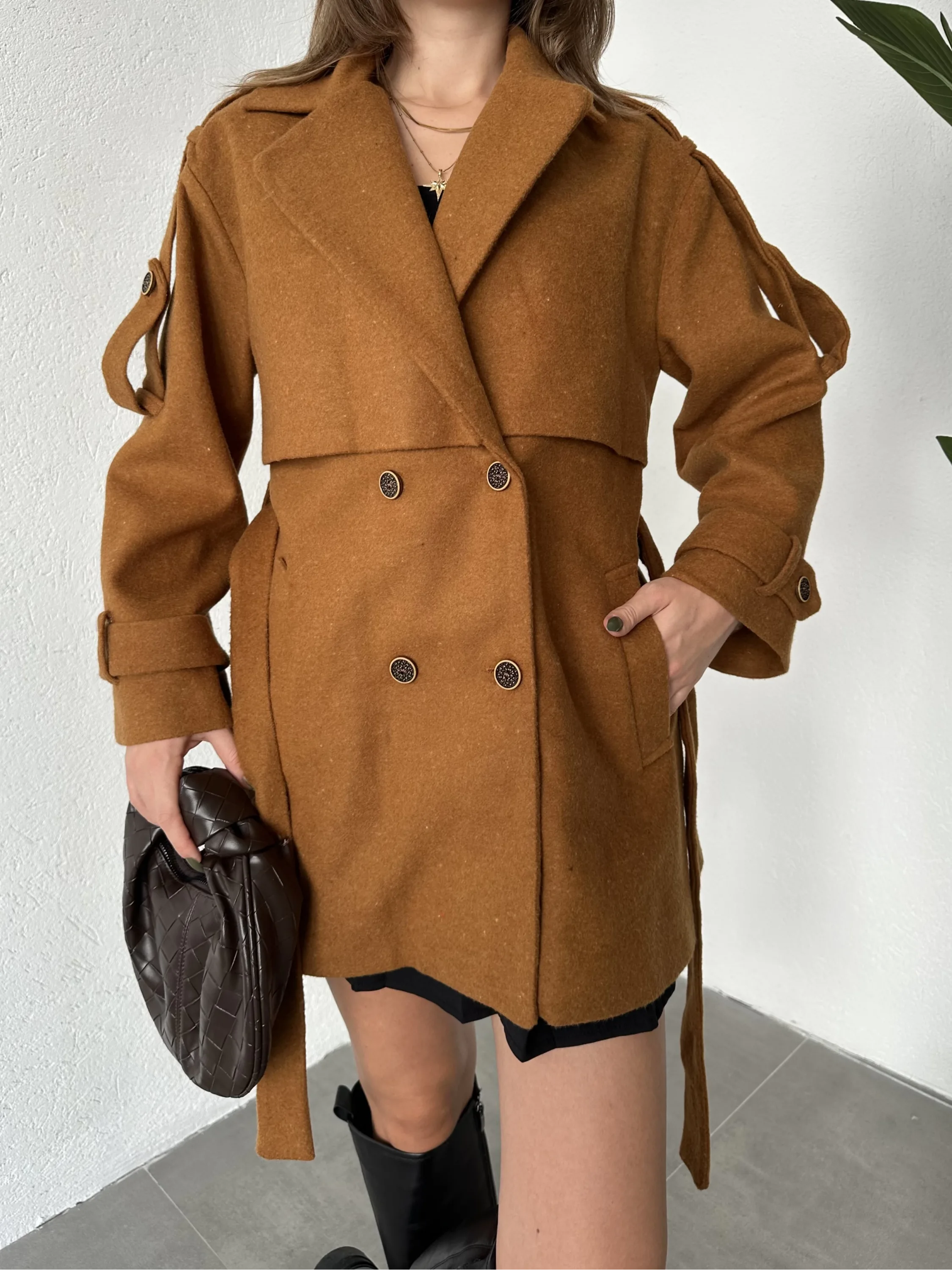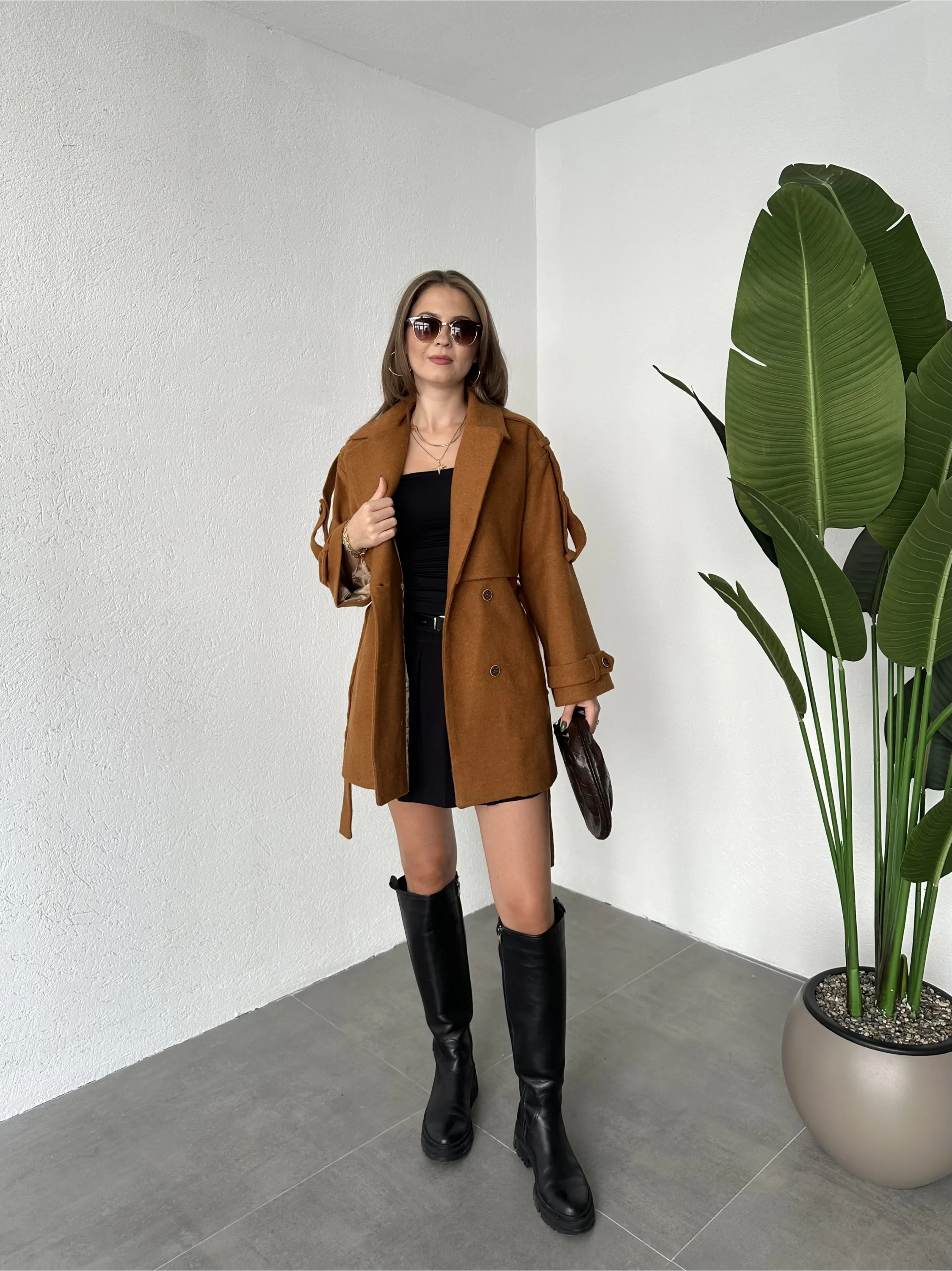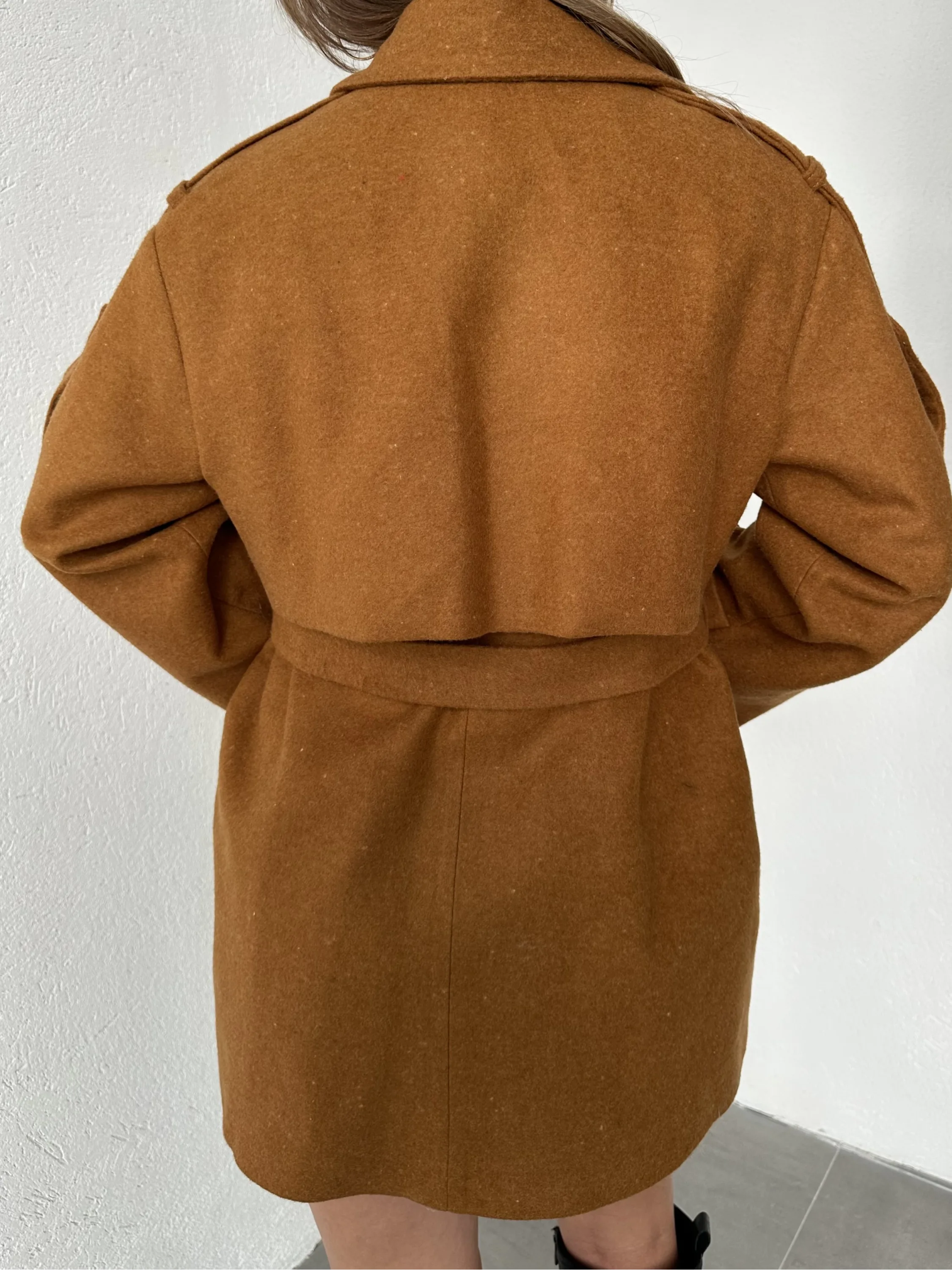 Taba Kruvaze Oversize Astarlı Cepli Kuşaklı Kaşe Mont Kaban