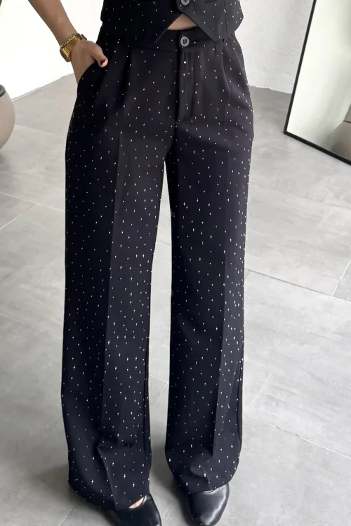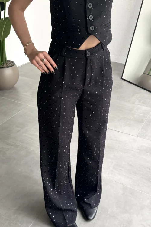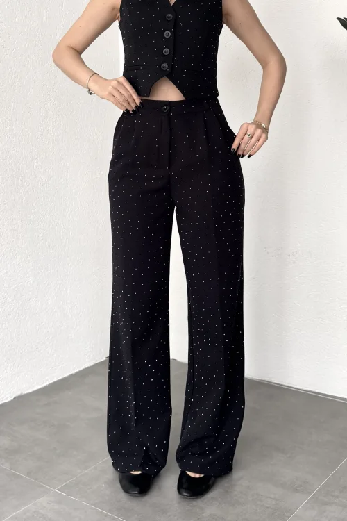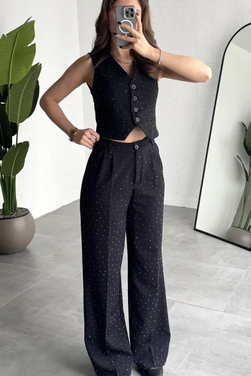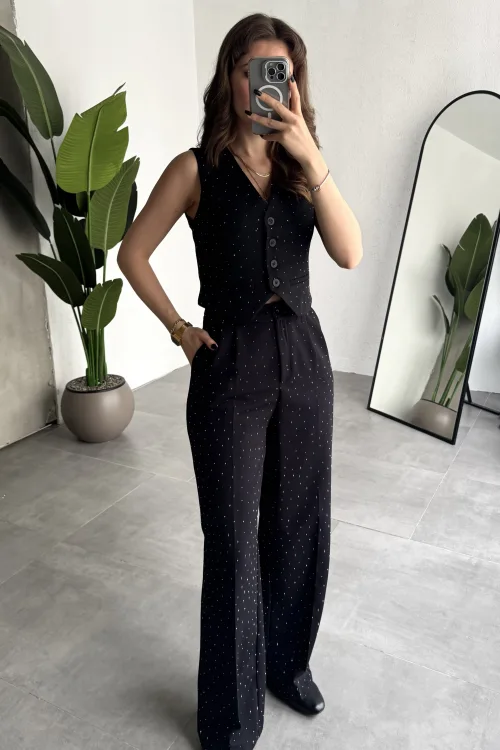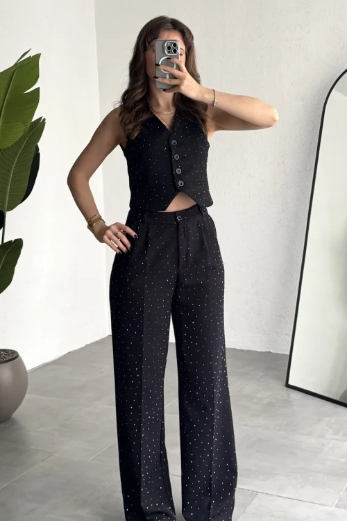 Kadın Siyah Pırıltı Taşlı Düğmeli Kolsuz Yelek Pileli Palazzo Pantolon Takım