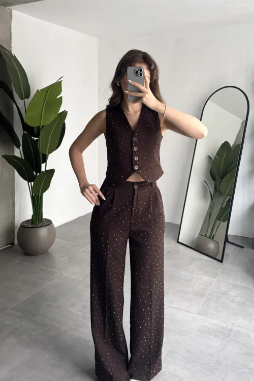 Kadın Kahverengi Pırıltı Taşlı Düğmeli Kolsuz Yelek Pileli Palazzo Pantolon Takım